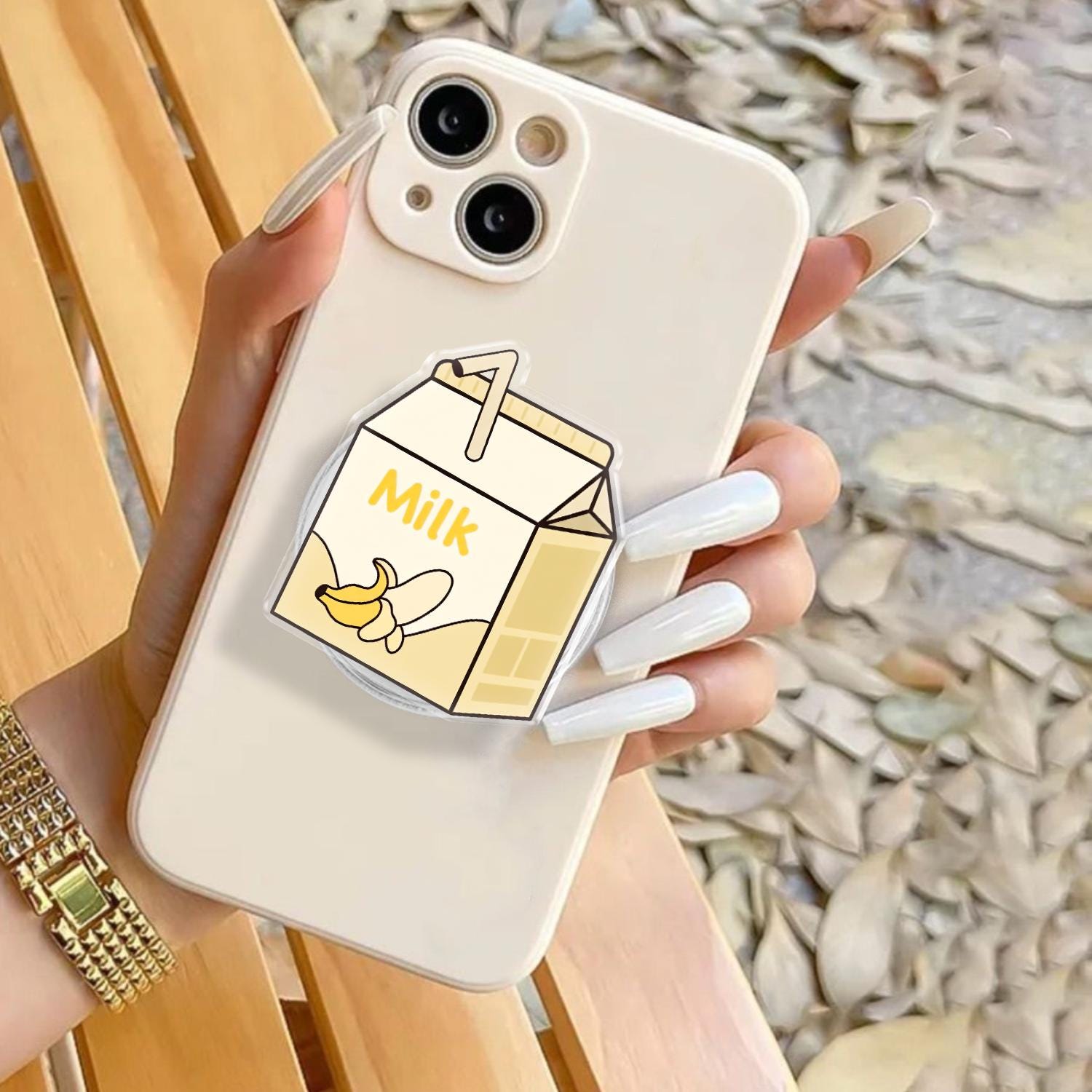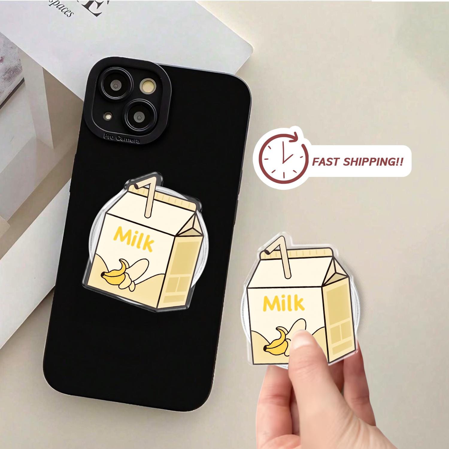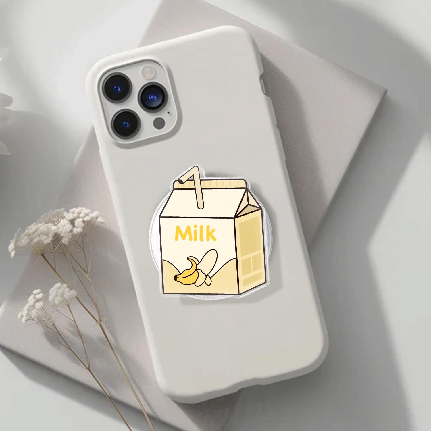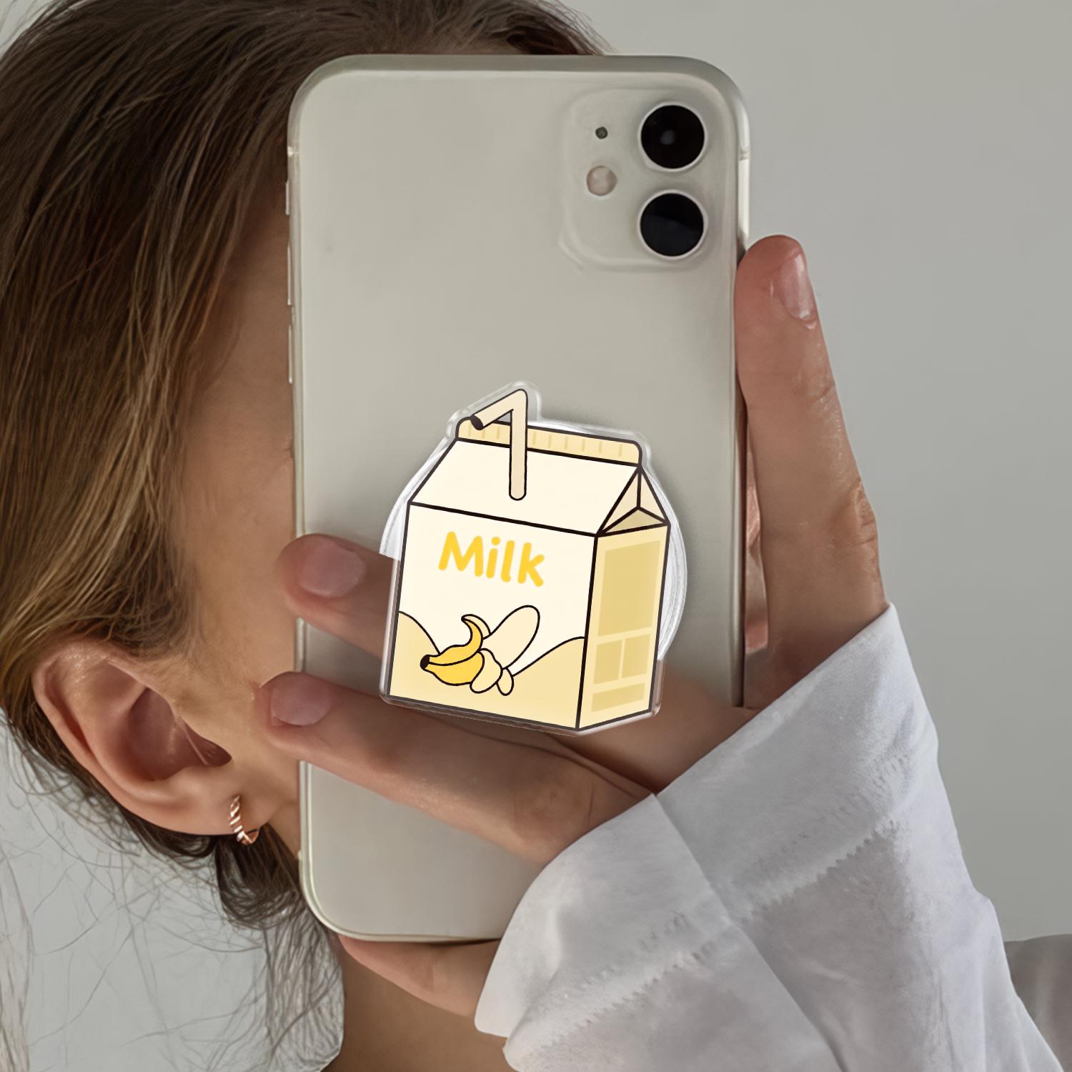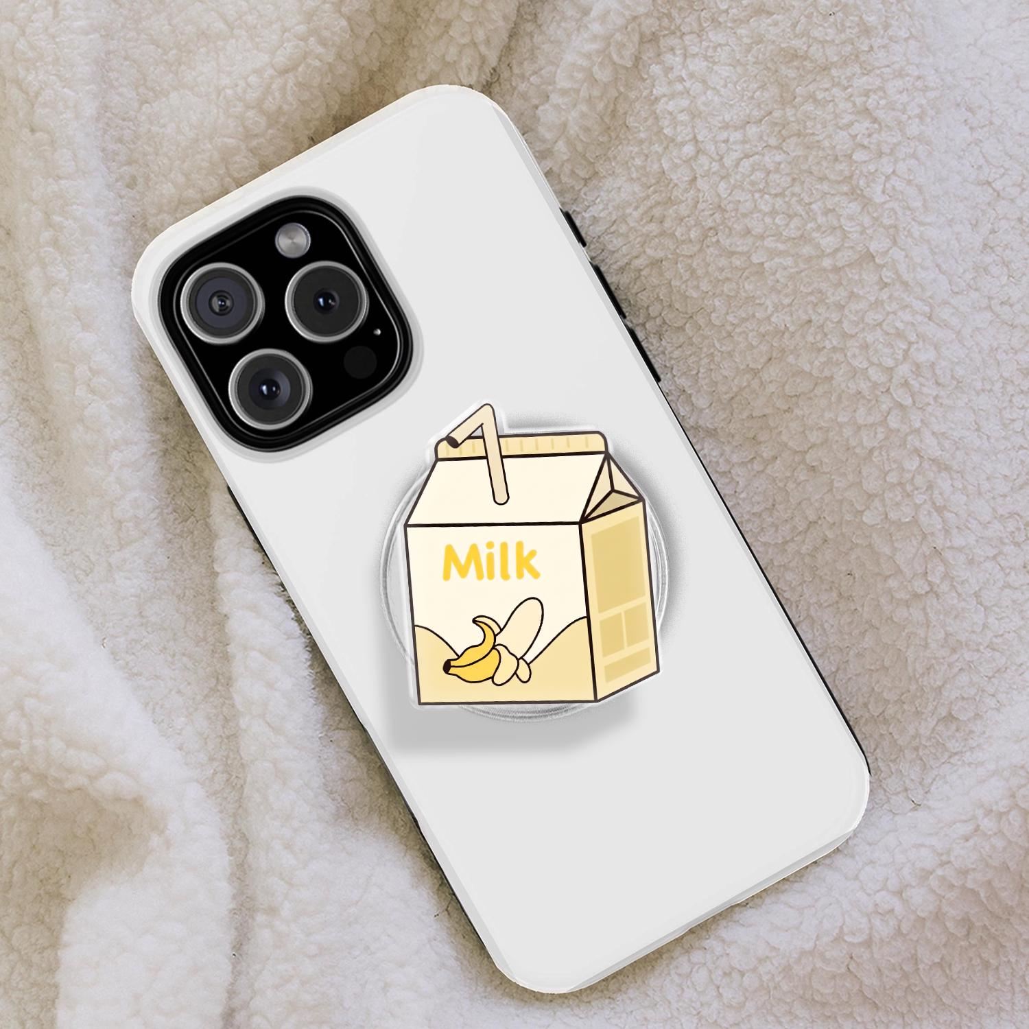 Charming Kawaii Design: This phone grip features a high-definition illustration of a classic mini milk carton, complete with a tiny straw and a cheerful banana graphic.
