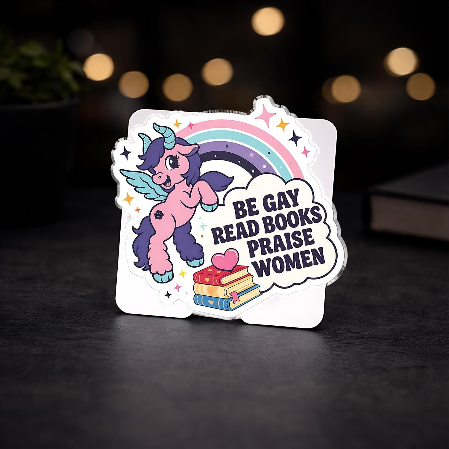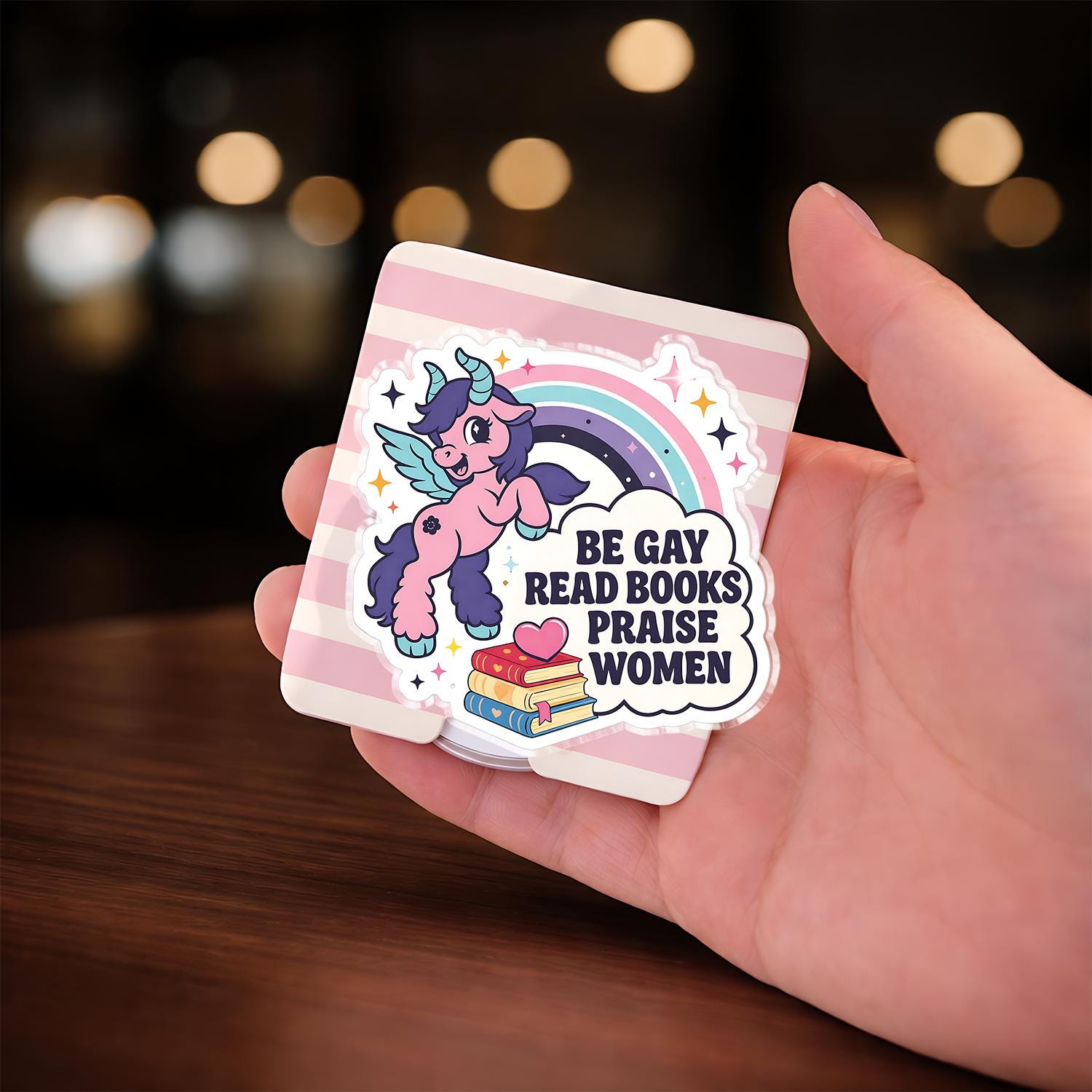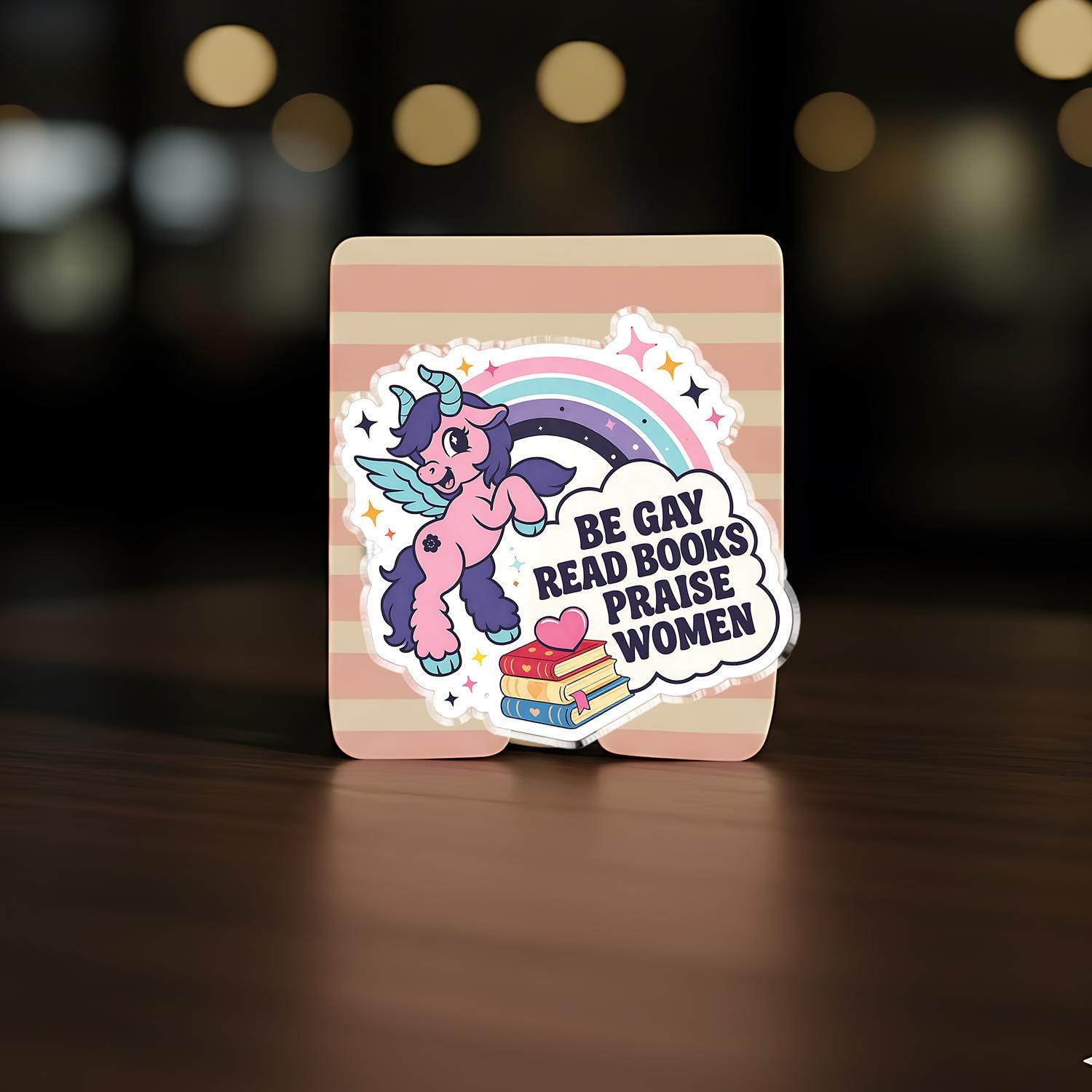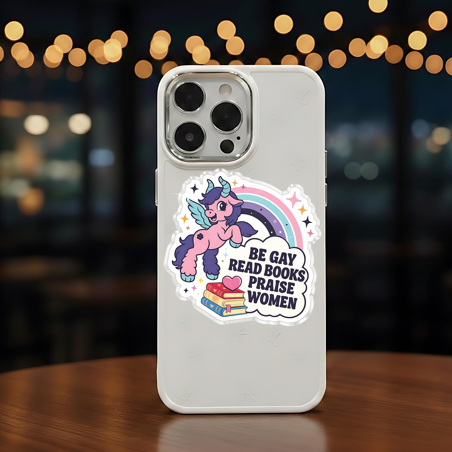 Be Gay Read Books Praise Women Phone Grip is a cute and empowering phone holder featuring a pastel unicorn, rainbow pride colors, and a book lover feminist message.