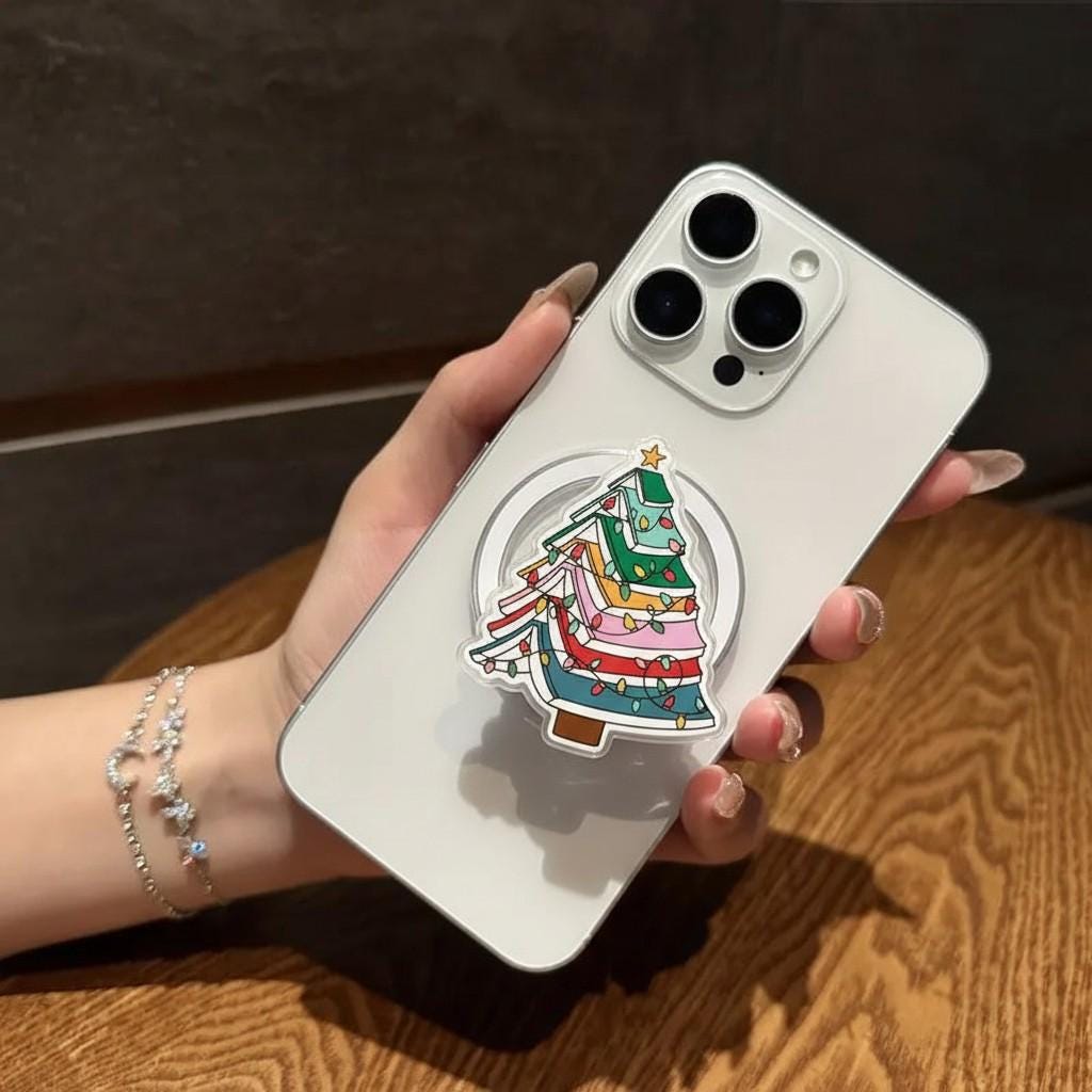 Featuring a cute and creative Christmas tree design made out of stacked books with colorful lights and a star on top, this phone grip is perfect for book lovers who want to show off their festive spirit in a unique way. It’s a fun, playful accessory for your phone that combines the love for books and the holiday season.