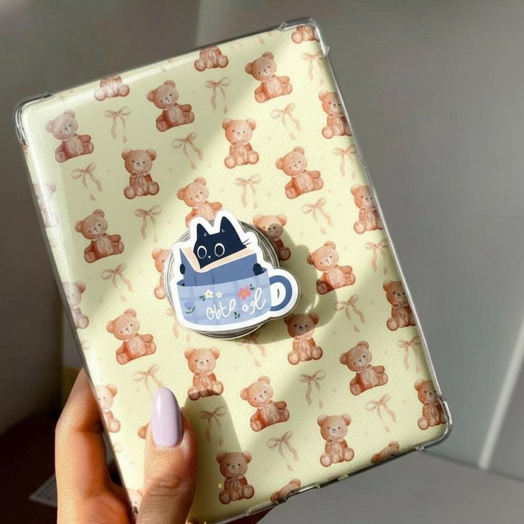 🐱 Cat in Teacup MagSafe Phone Grip – Kawaii Black Kitty Reading Magnetic Holder for Phones & E-Readers