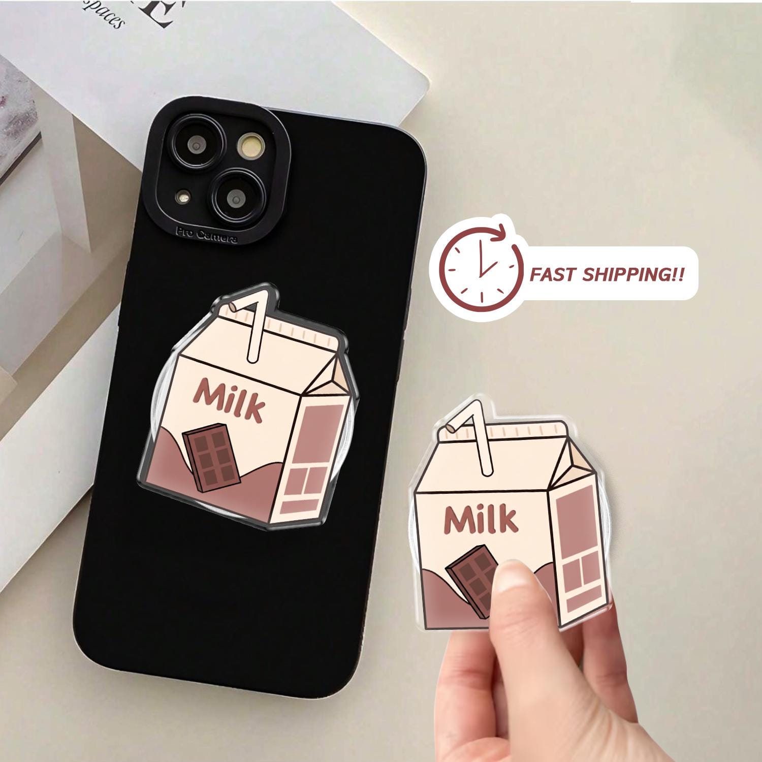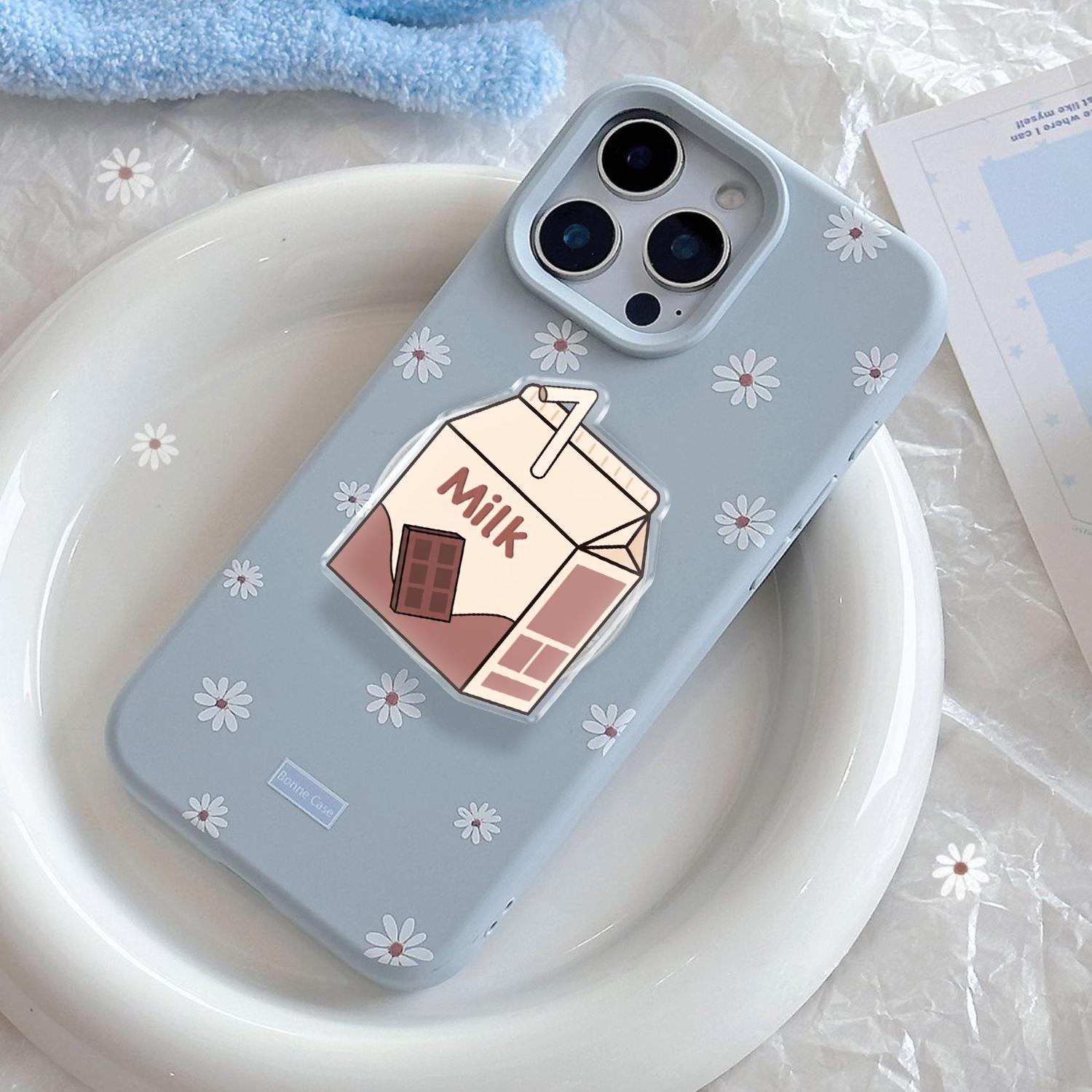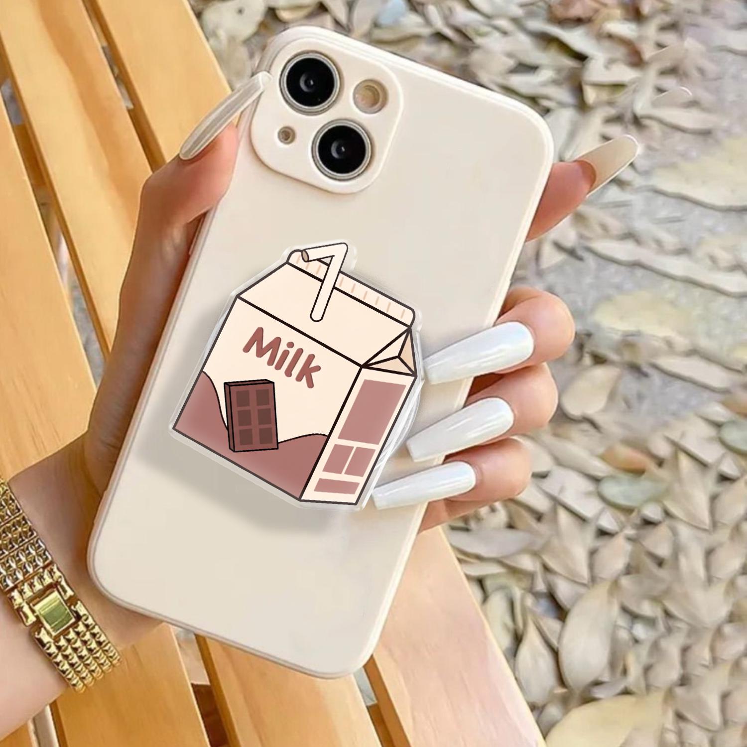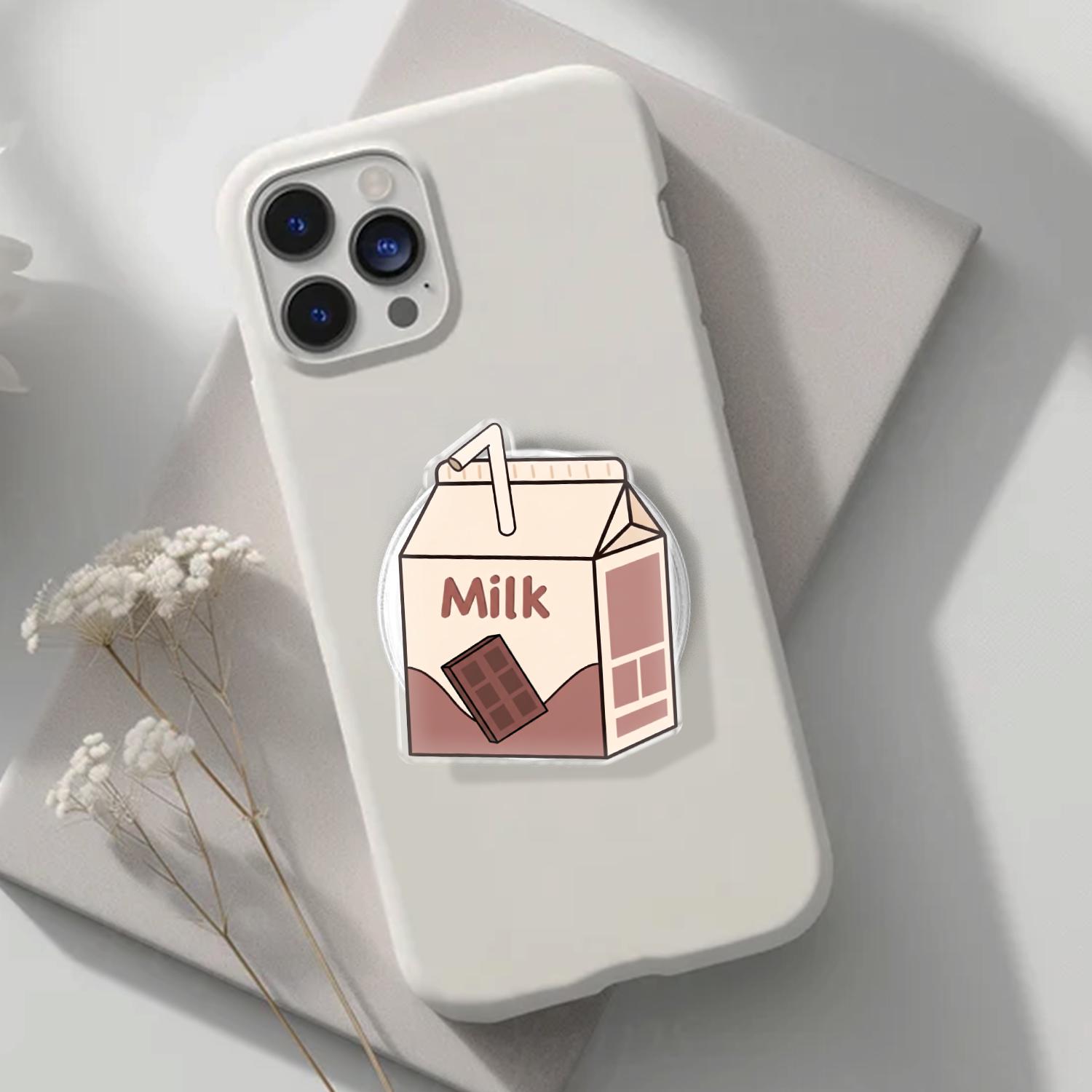 Charming Kawaii Design: This phone grip features a high-definition illustration of a classic mini milk carton, complete with a tiny straw and a delicious chocolate bar graphic.