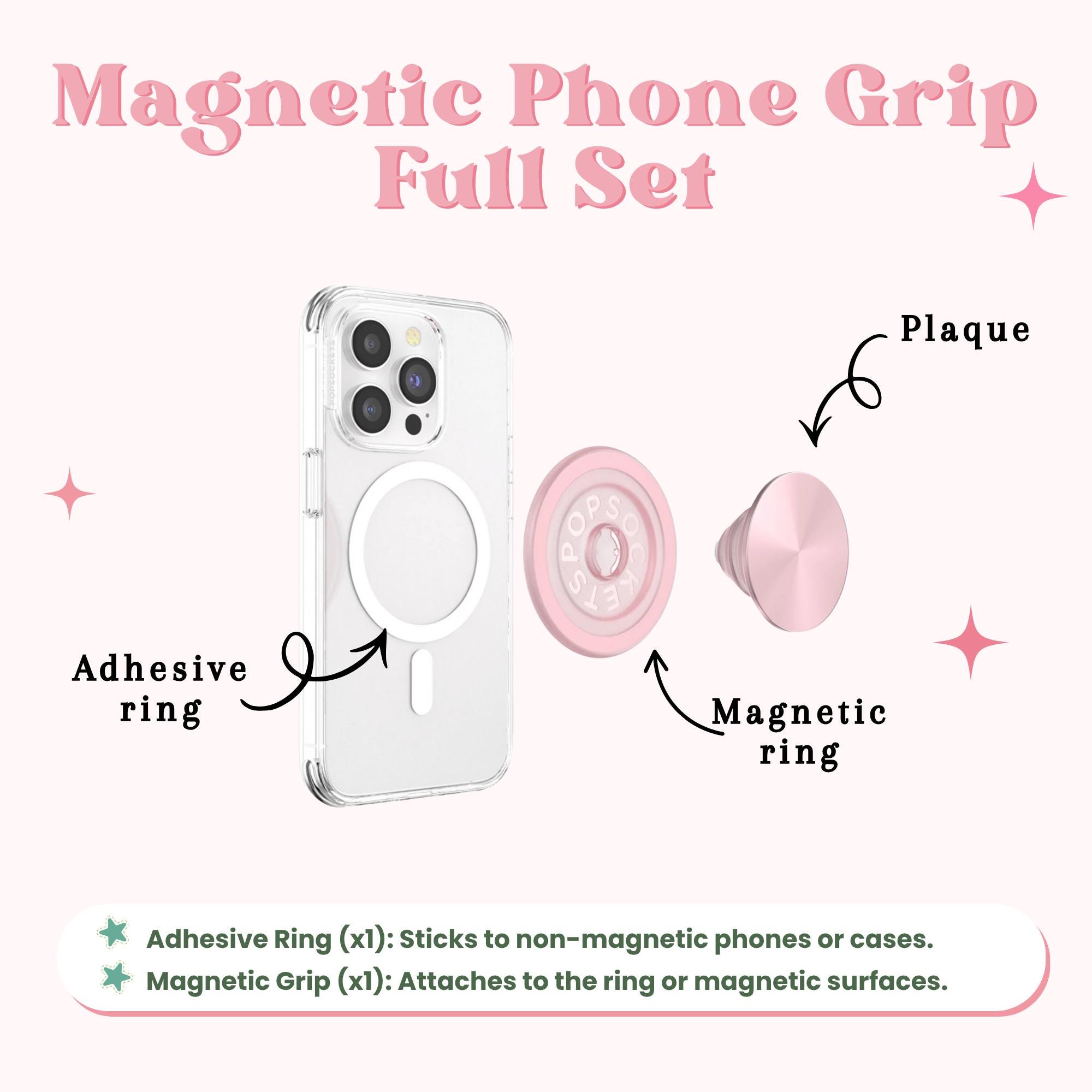 ✨ Adhesive Grip – No magnetic ring included. Designed to stick securely to any smooth, hard phone case using strong adhesive.