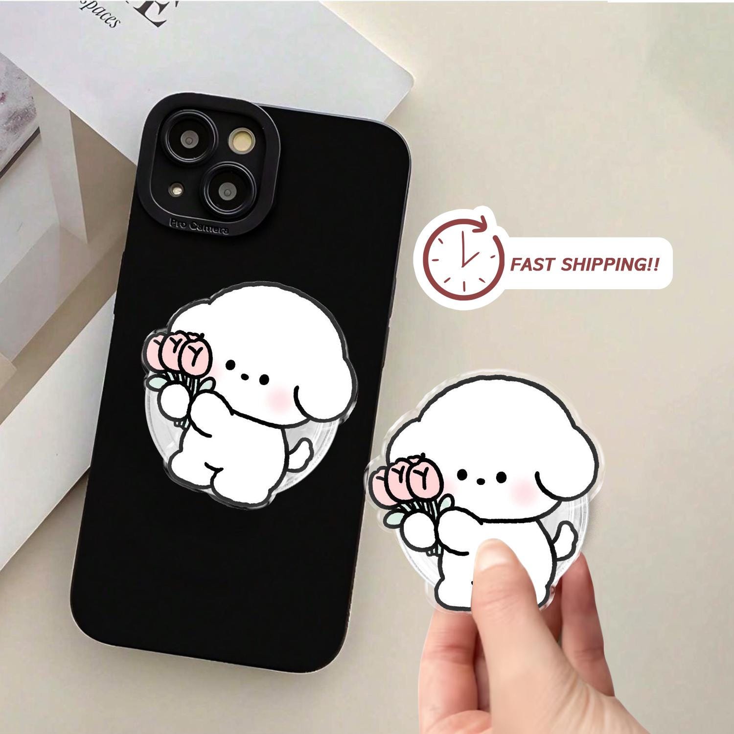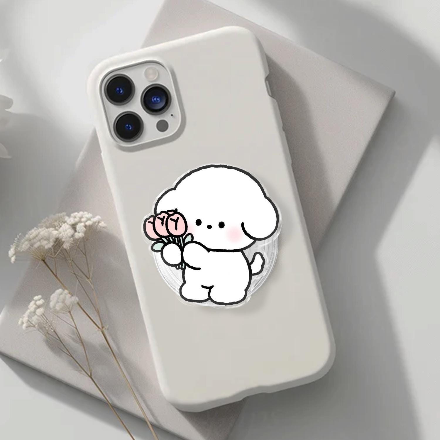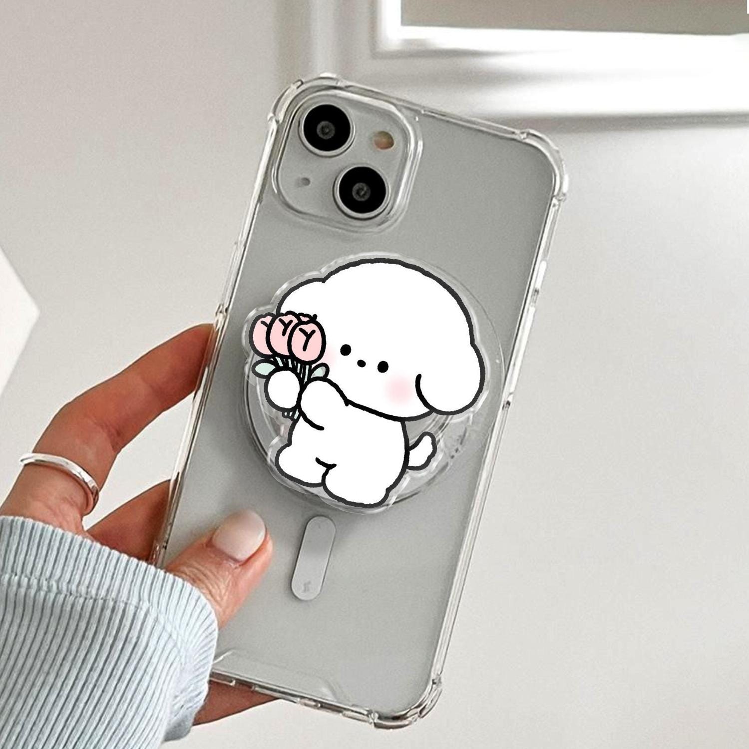 Aesthetic White Puppy holding Pink Tulip Bouquet, Kawaii Cartoon Character Illustration, Universal Magnetic & Adhesive Phone Stand