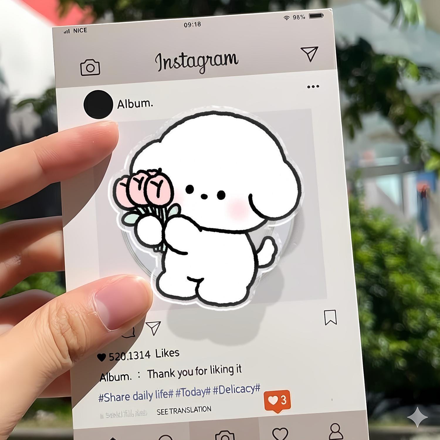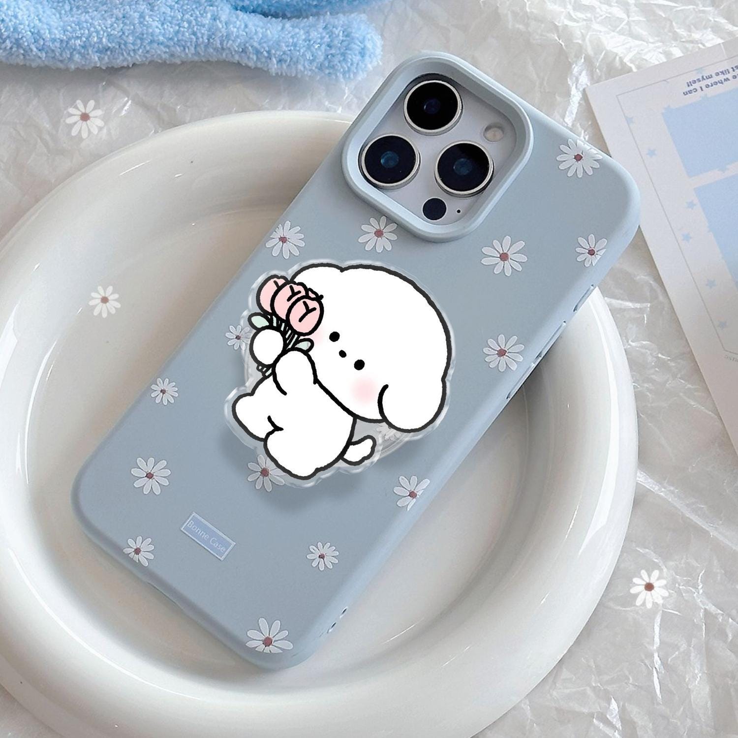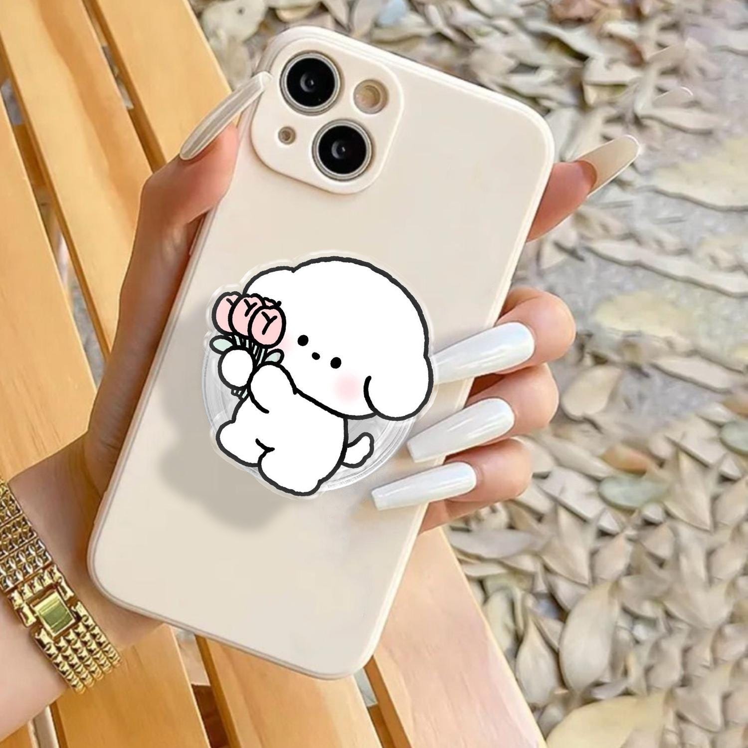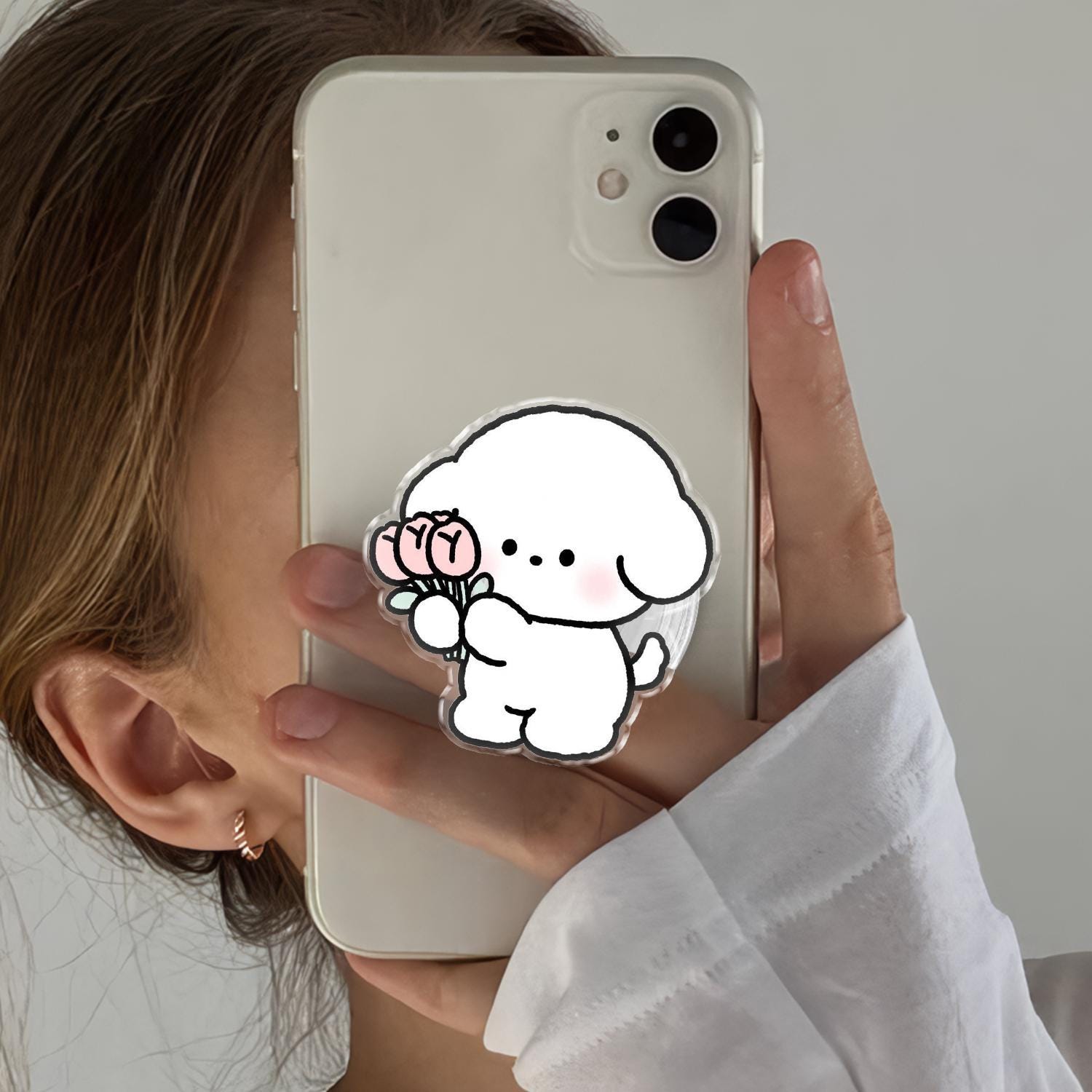 Aesthetic White Puppy holding Pink Tulip Bouquet, Kawaii Cartoon Character Illustration, Universal Magnetic & Adhesive Phone Stand