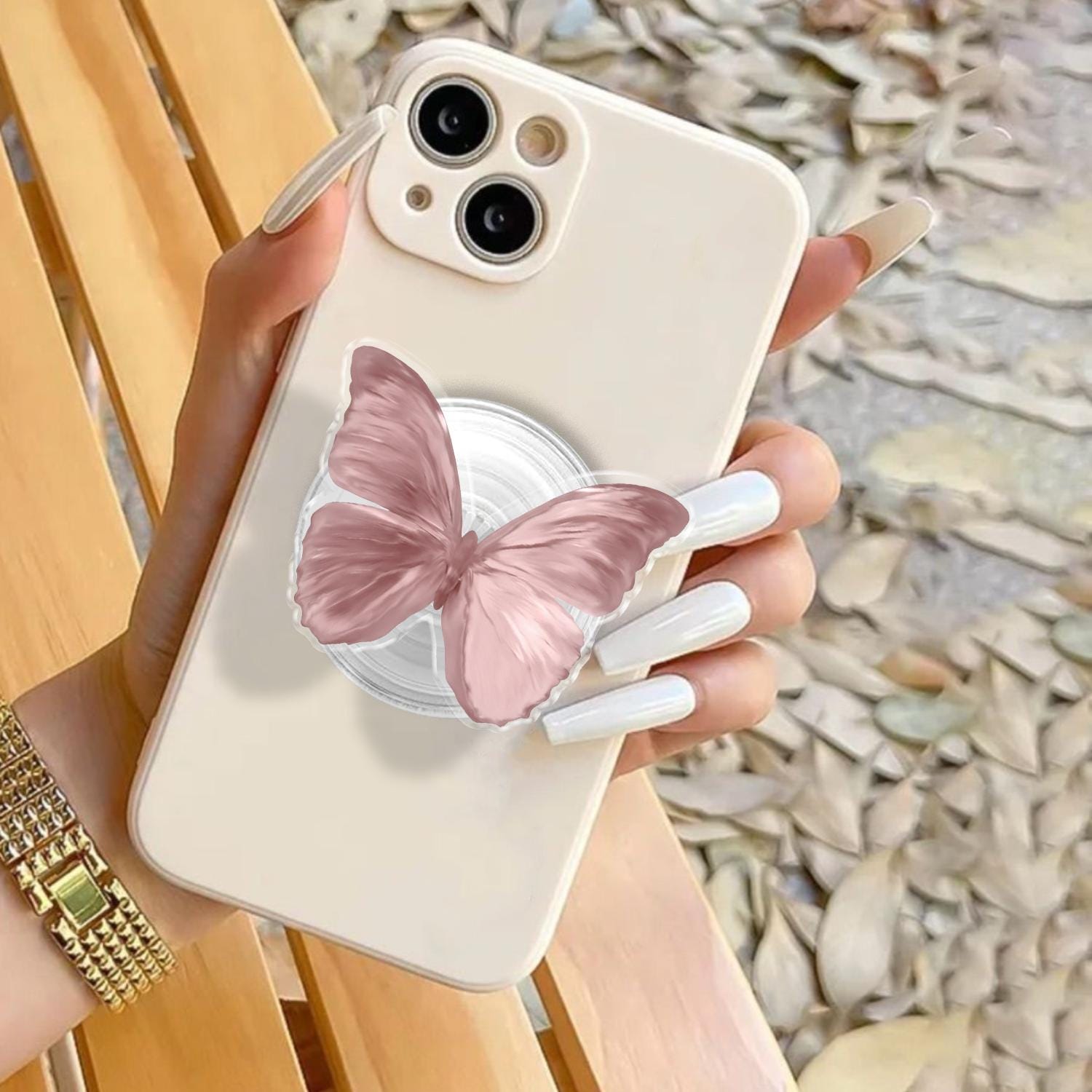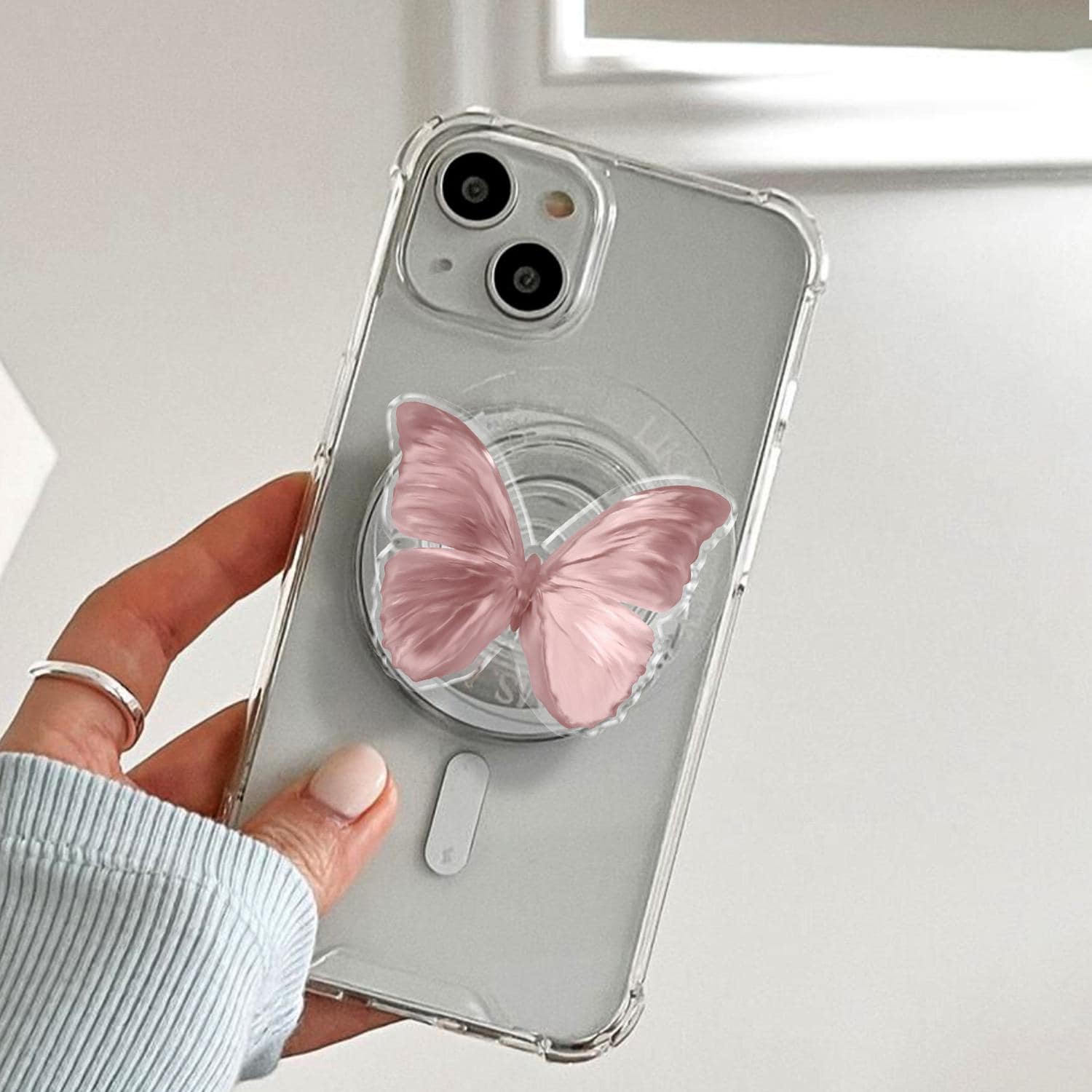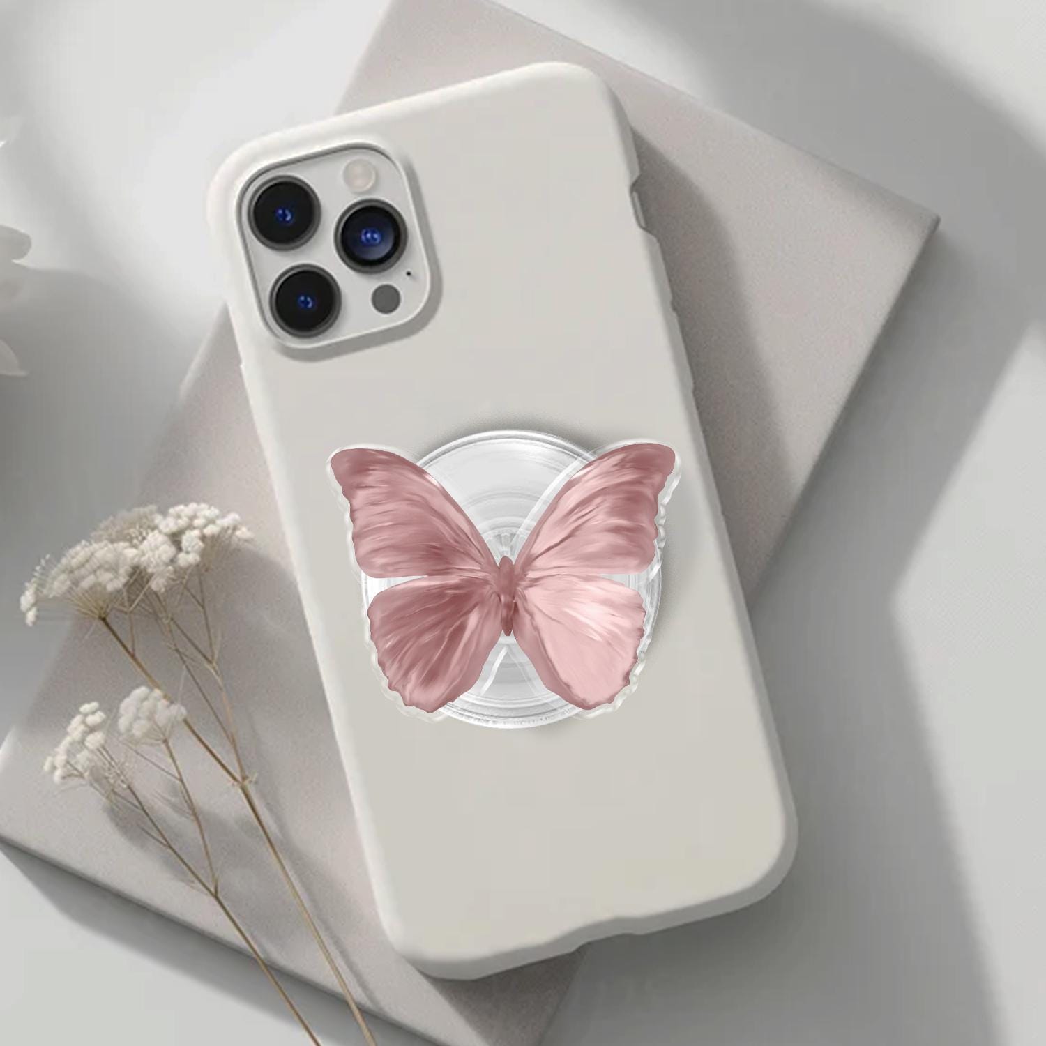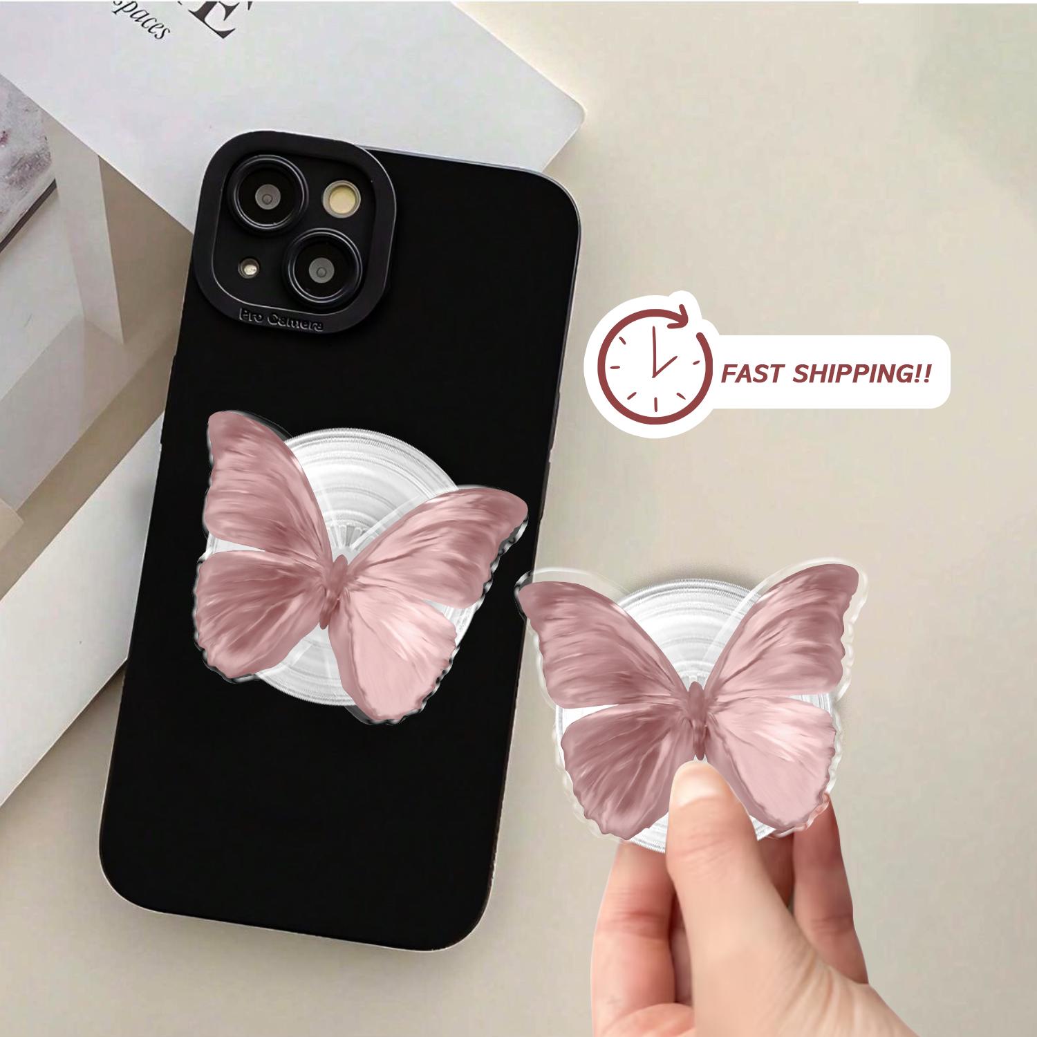 Detailed Butterfly Artistry: This phone grip features a high-definition illustration of a delicate butterfly in a soft dusty pink hue, capturing the intricate textures and elegant curves of natural wings.