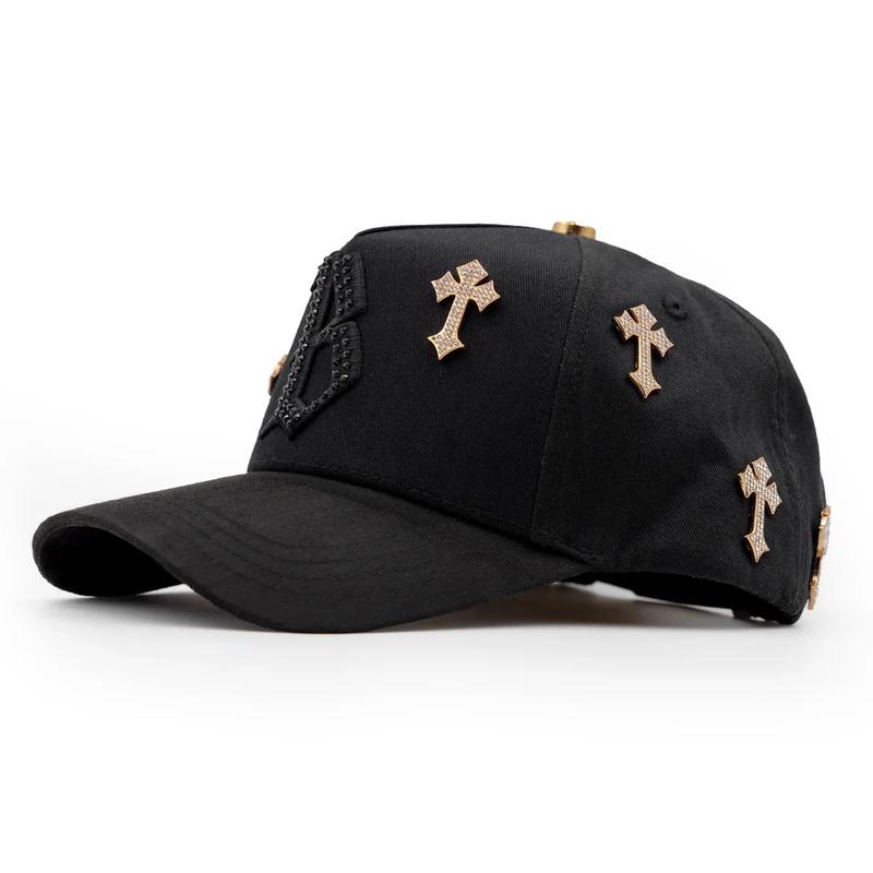 ✝️ Gold-tone cross embellishments that create a striking contrast against the dark base