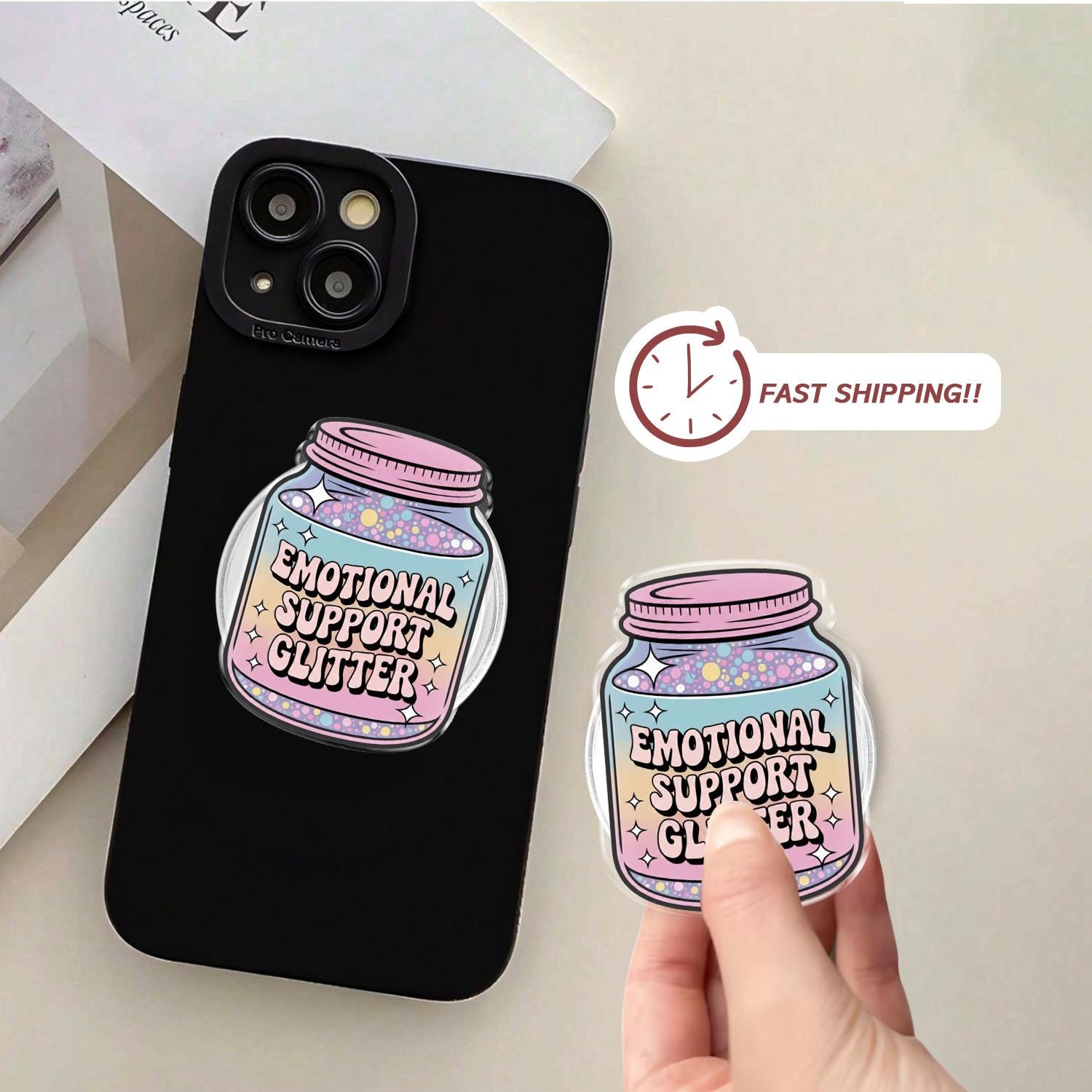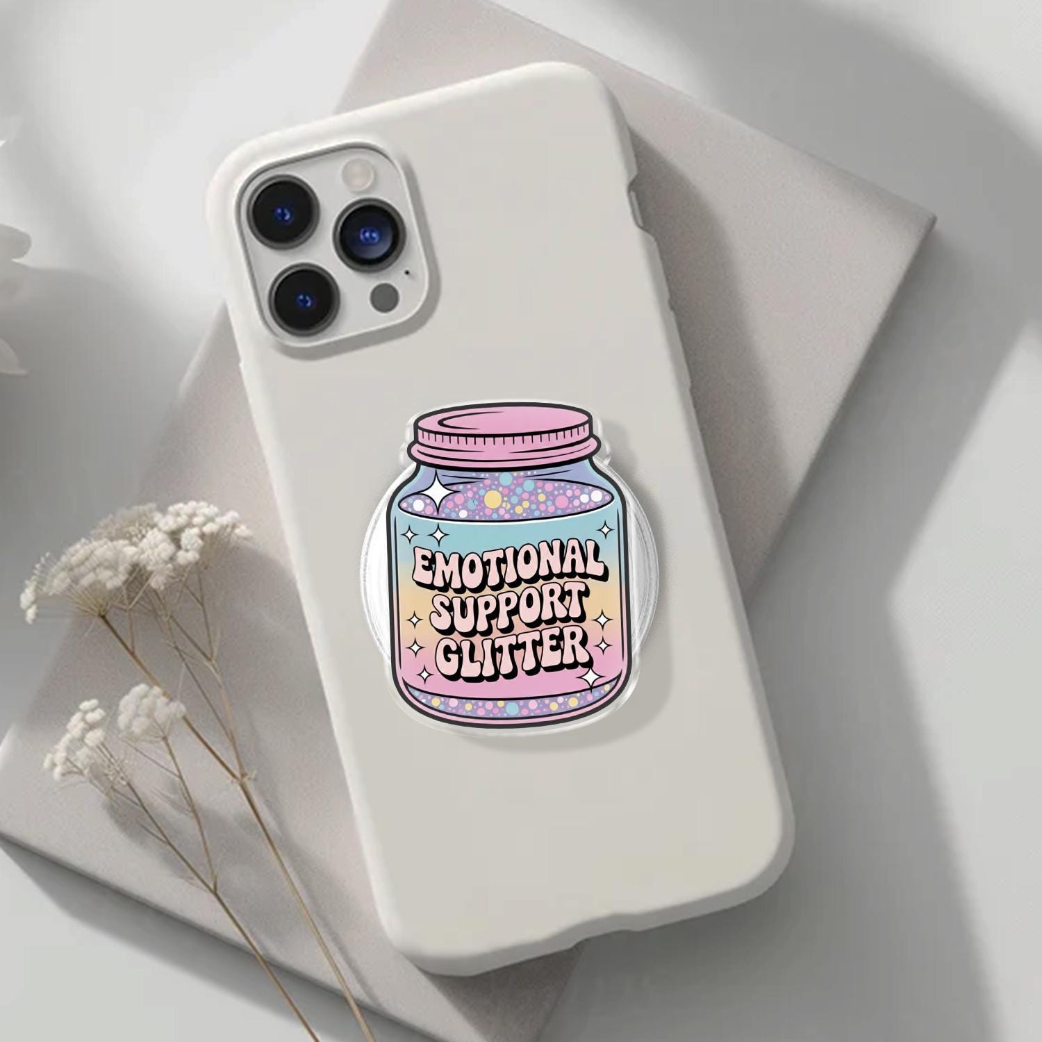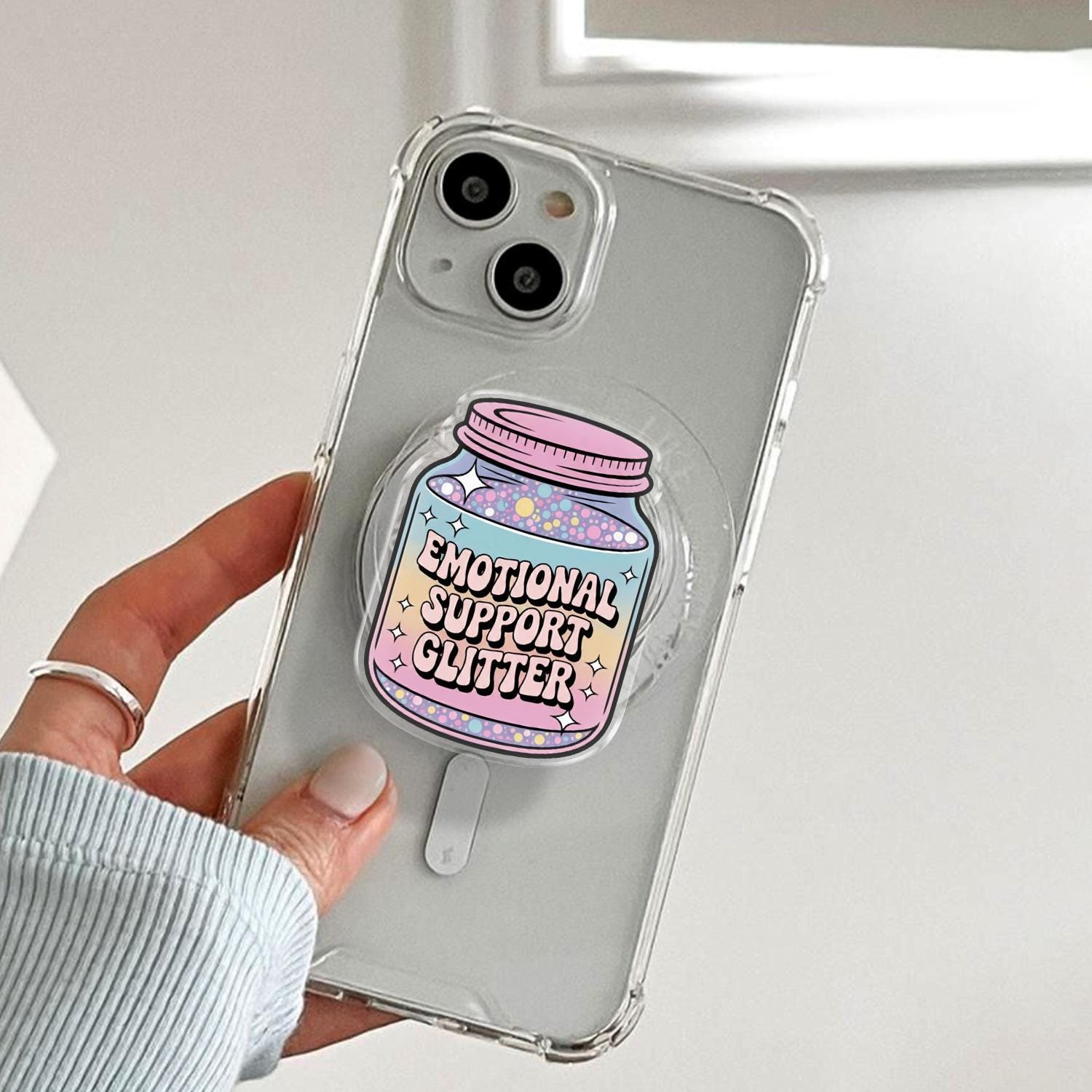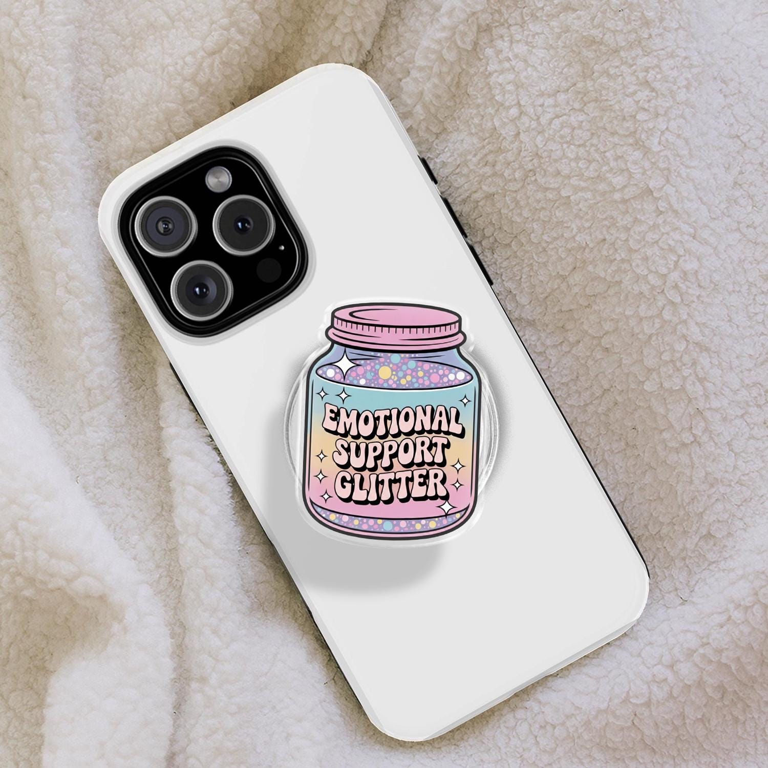 Whimsical Artistry: This phone holder features a charming glass jar filled with a magical pastel rainbow gradient and colorful "glitter" dots, labeled with the sweet "Emotional Support Glitter" slogan.