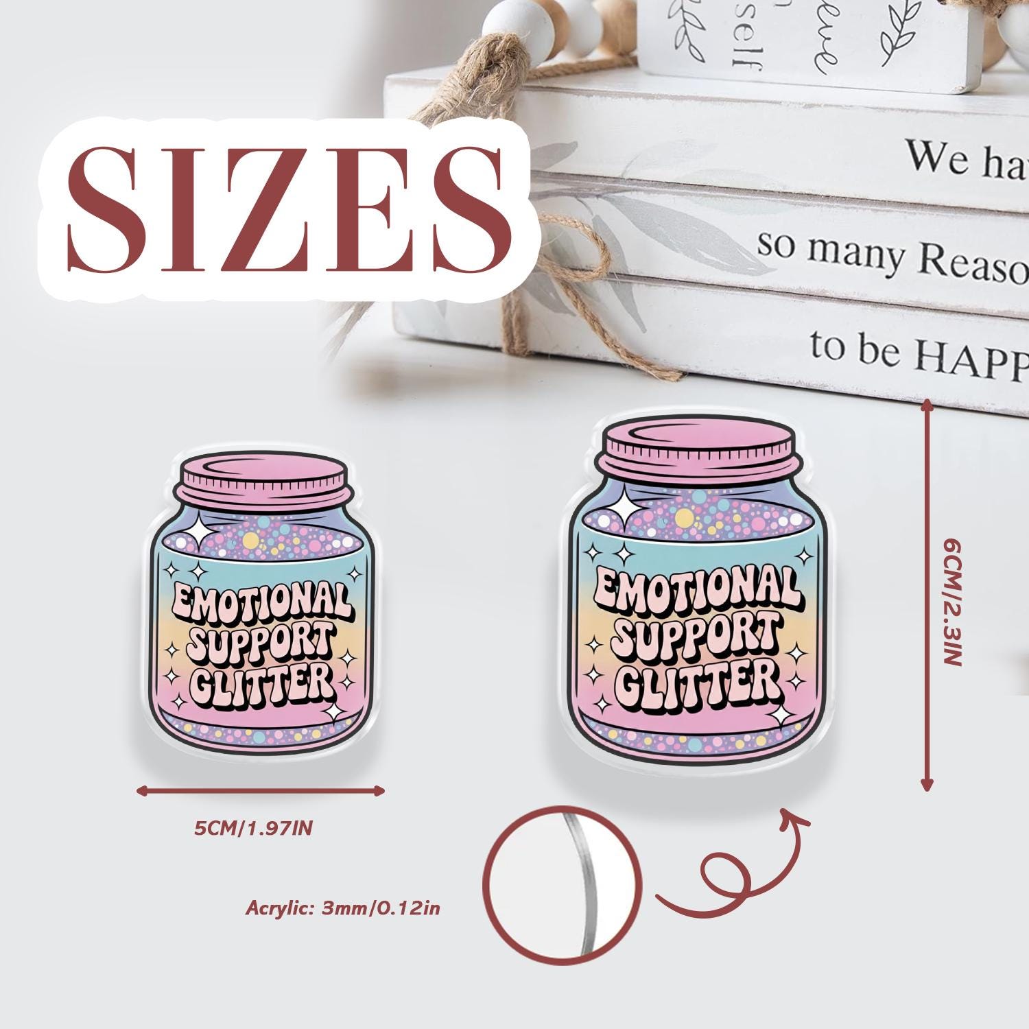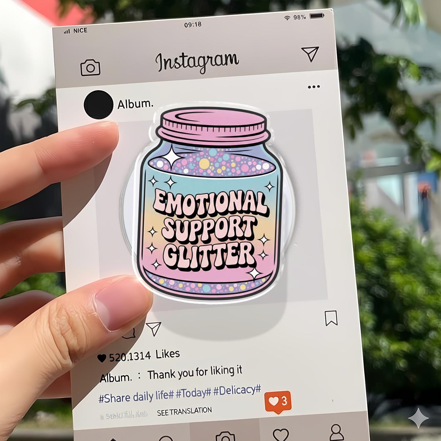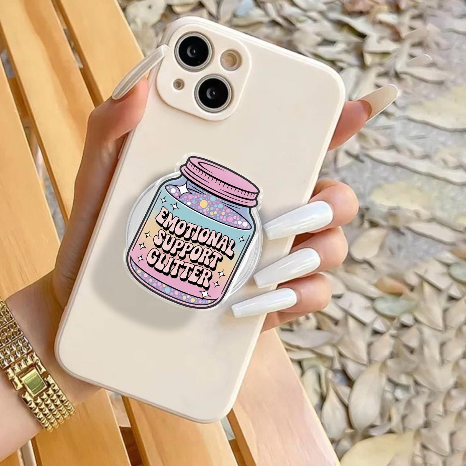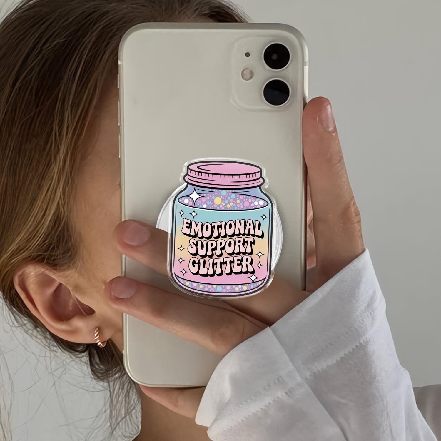 Whimsical Artistry: This phone holder features a charming glass jar filled with a magical pastel rainbow gradient and colorful "glitter" dots, labeled with the sweet "Emotional Support Glitter" slogan.
