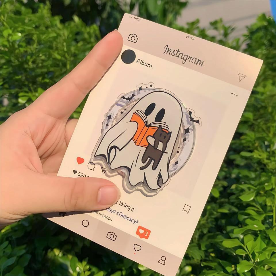 👻📚🐱 Ghost Holding Book and Cat MagSafe Phone Grip – Cute Spooky E-reader Stand Gift for Cat Lovers