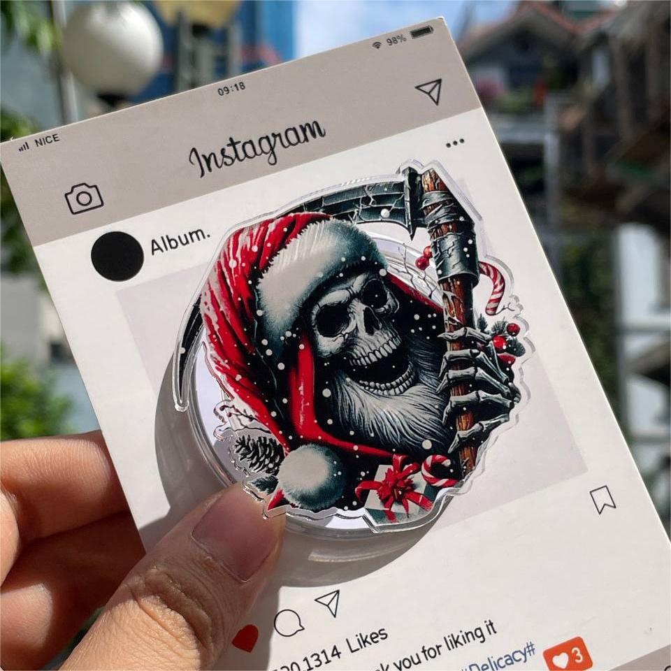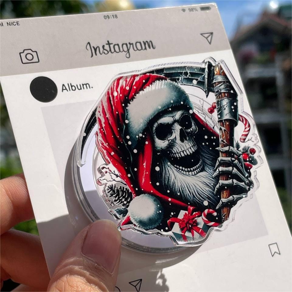 A bold seasonal accessory that blends dark aesthetic with holiday cheer. This Gothic Skull Santa MagSafe Phone Grip features a grinning skeleton wearing a tattered Santa hat and clutching a candy‑cane scythe, printed under a glossy finish and built on a MagSafe‑compatible magnetic base. It’s a striking statement piece that functions as a secure grip and hands‑free stand while adding macabre charm to your device.