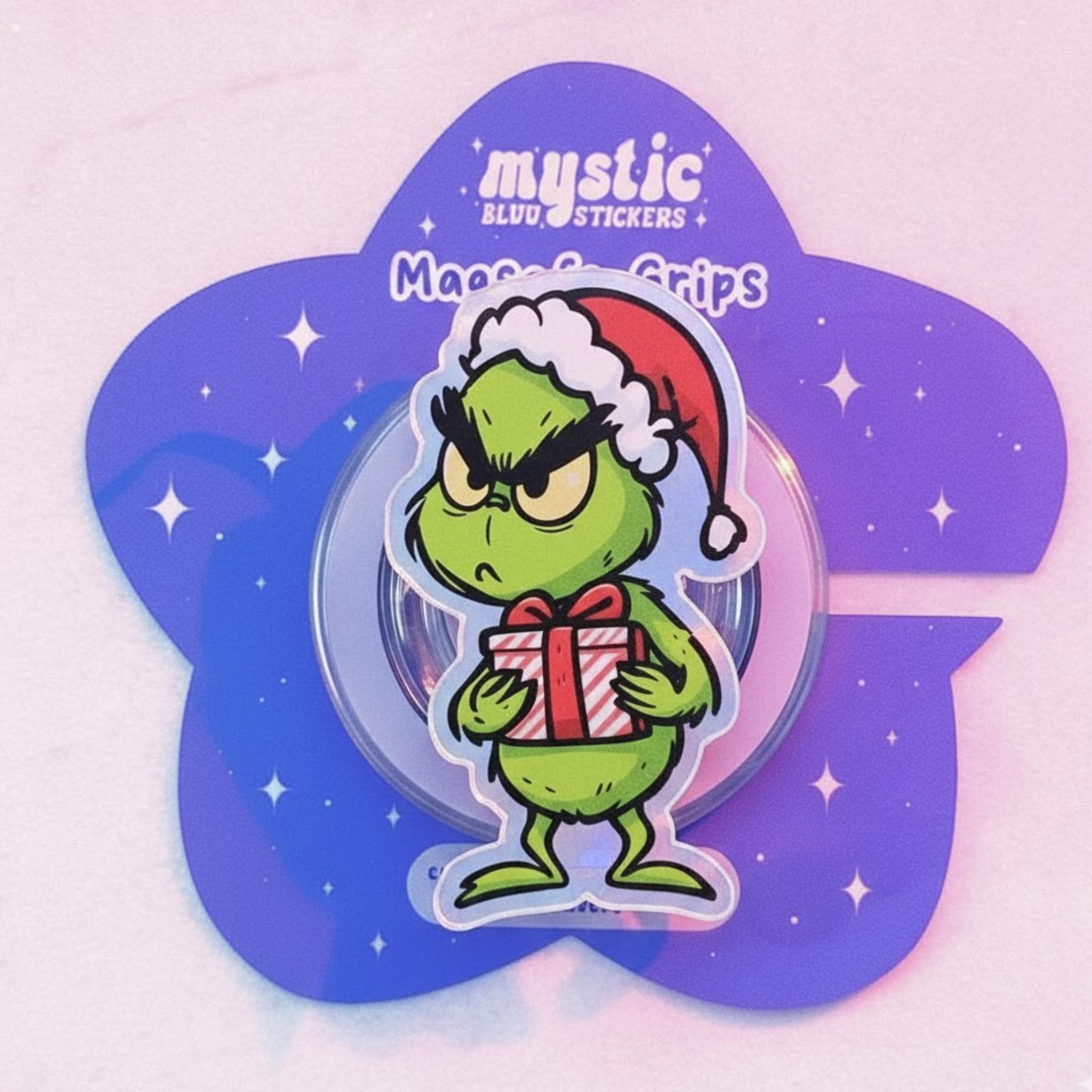 🎄🎁 Add some holiday mischief to your phone with this Grinch Christmas Phone Grip! Featuring a cute illustration of the iconic Grinch in a Santa hat holding a gift, this MagSafe Kindle Grip is perfect for the holiday season.
