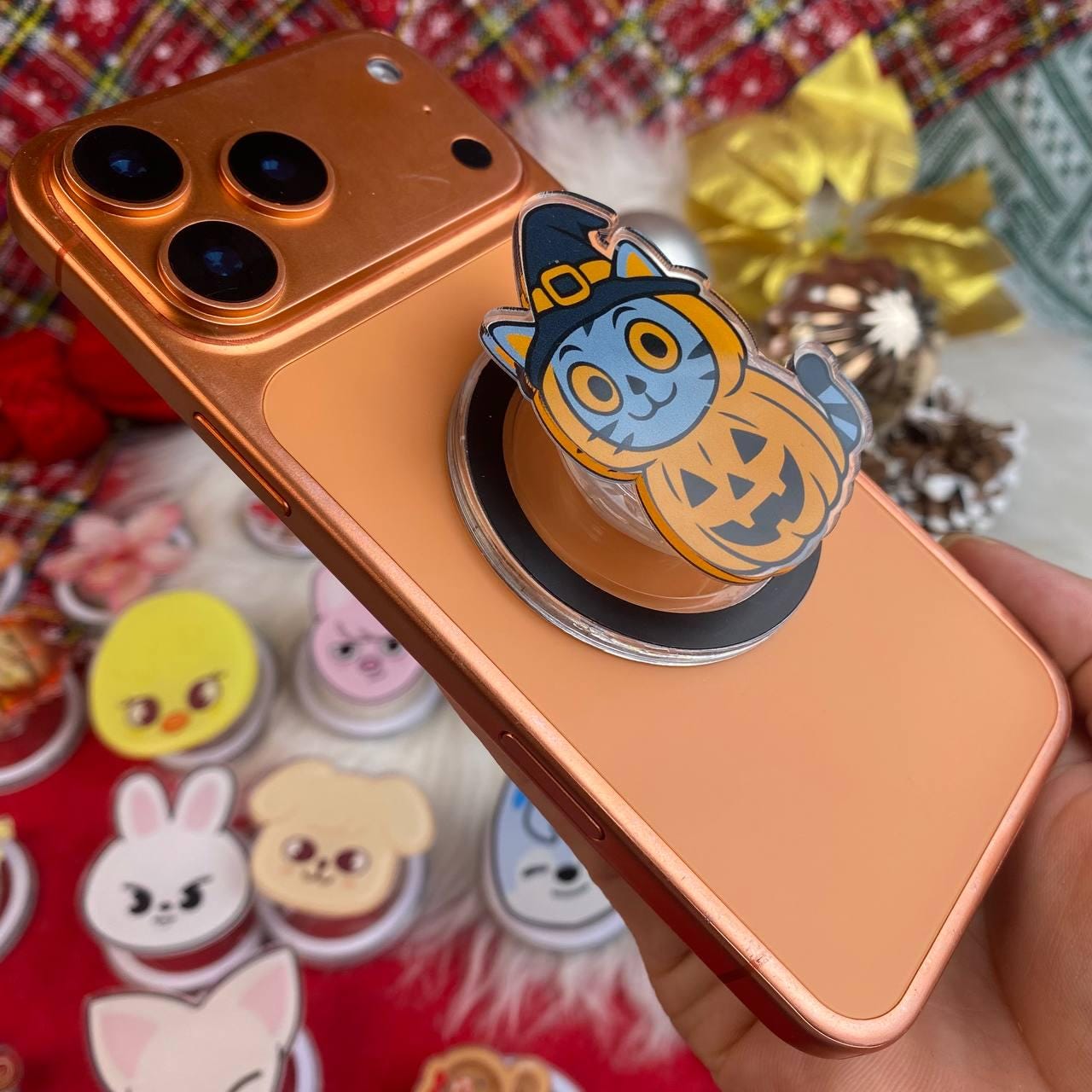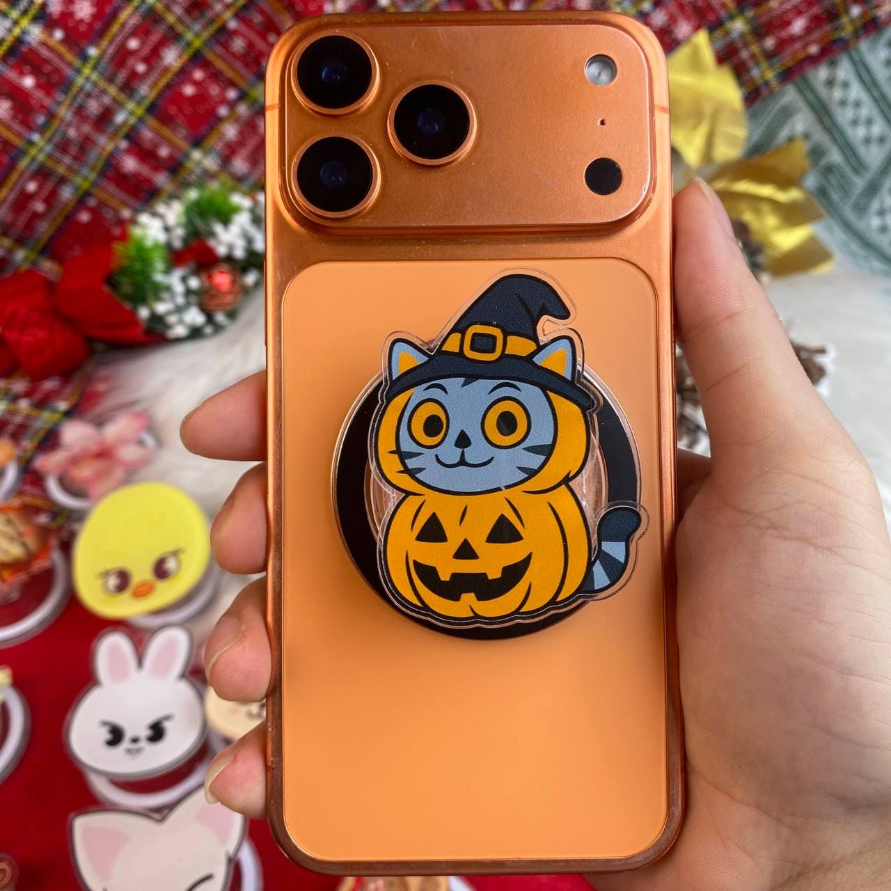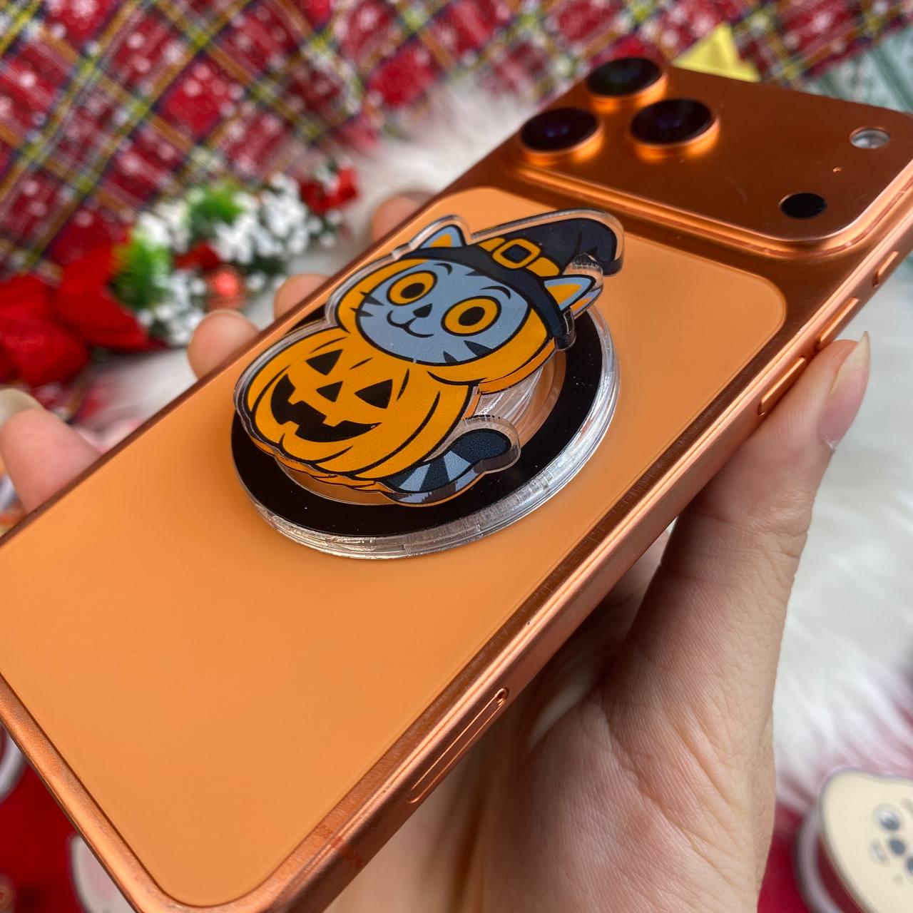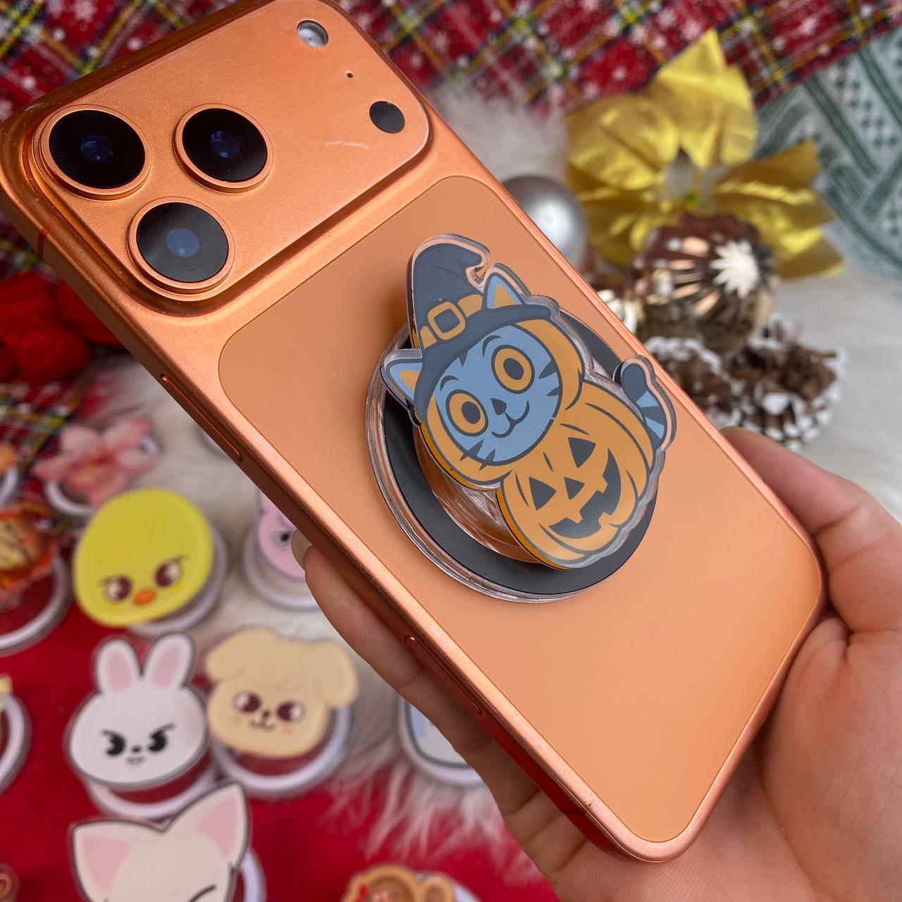 Featuring an adorable cat dressed in a pumpkin costume and wearing a witch's hat, this cute phone stand will bring the Halloween spirit to your device. Whether you're using it for Halloween phone accessories, as a fall phone stand, or simply as a fun decoration, this phone grip will be sure to turn heads and put a smile on your face.