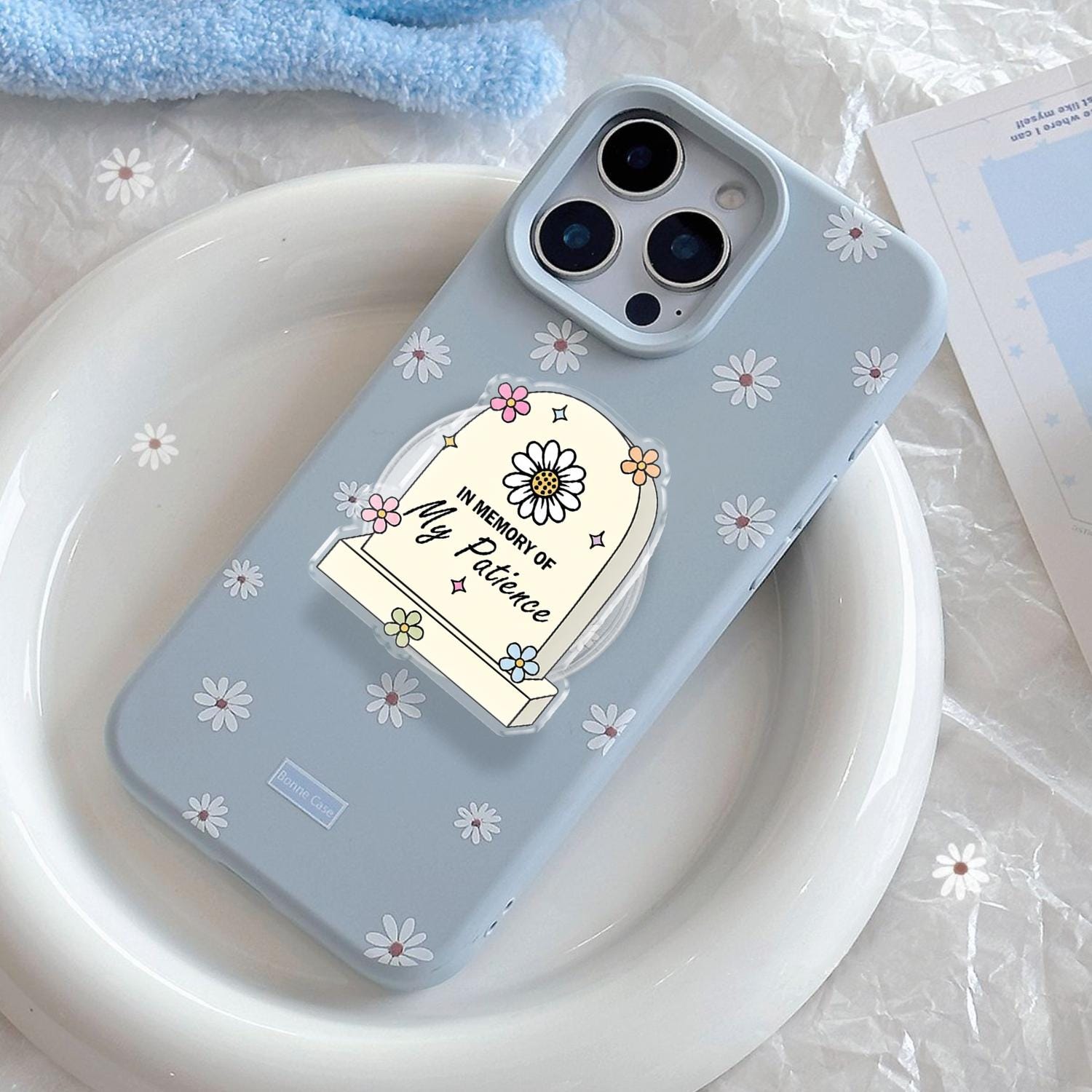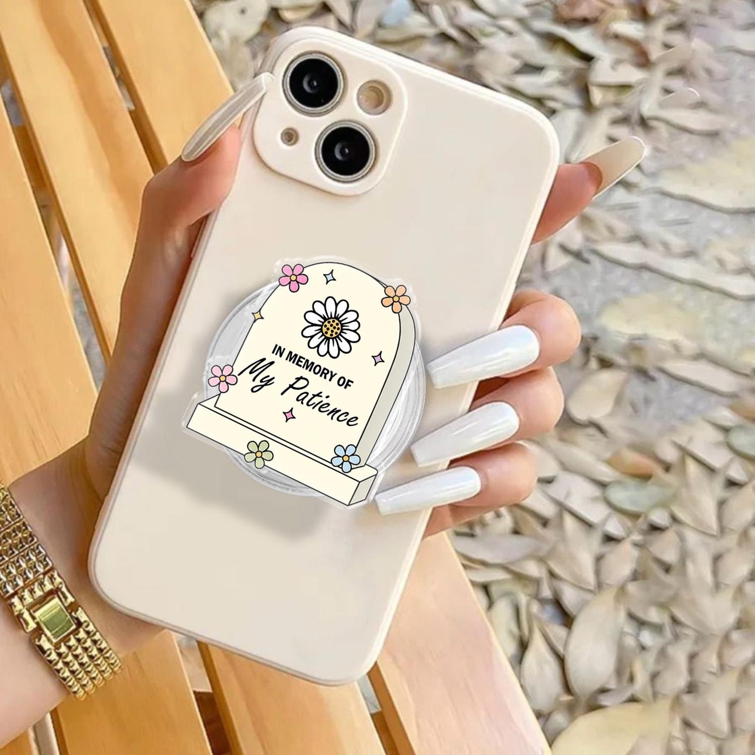 Witty & Relatable Artistry: This phone holder features a cute pastel tombstone adorned with colorful daisies and stars, dedicated to the final resting place of your patience.