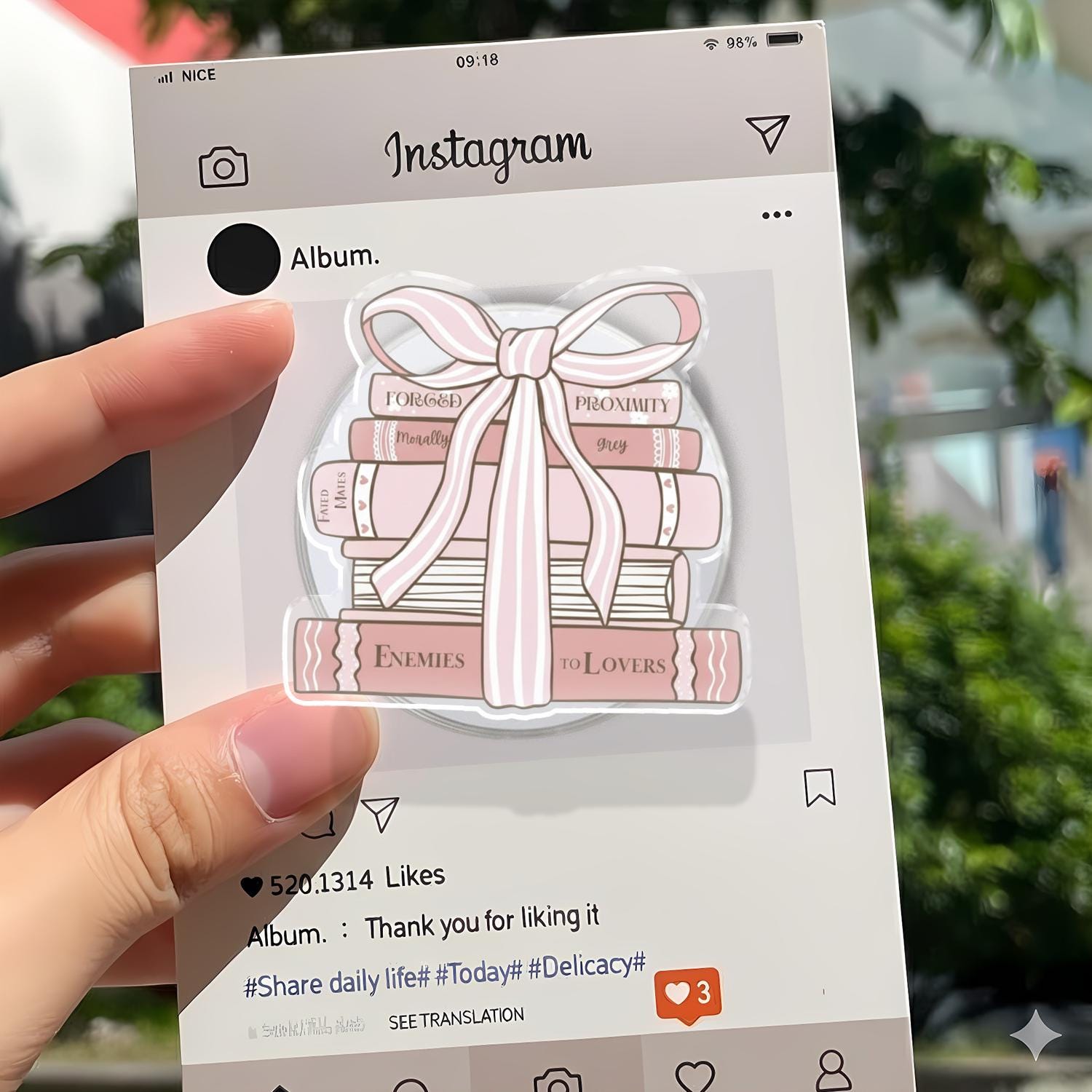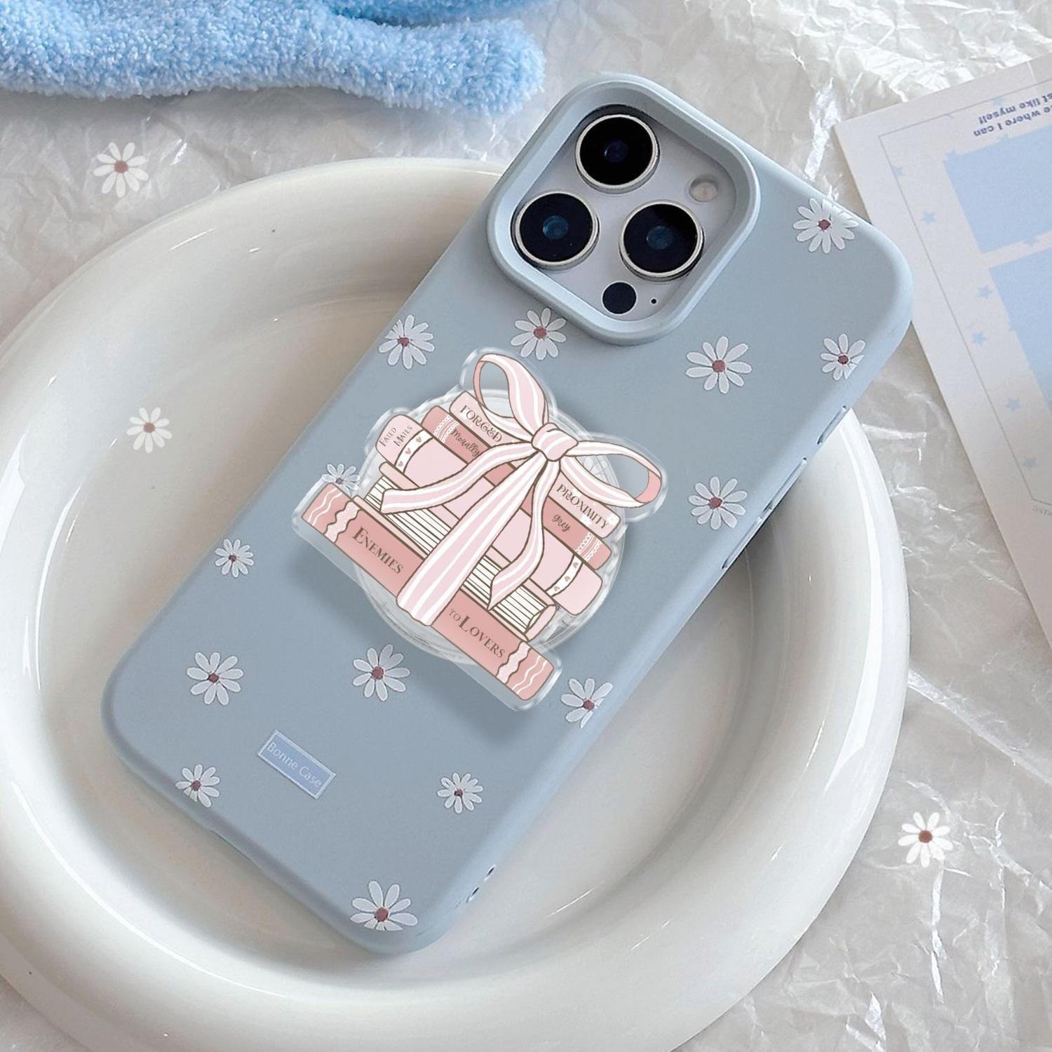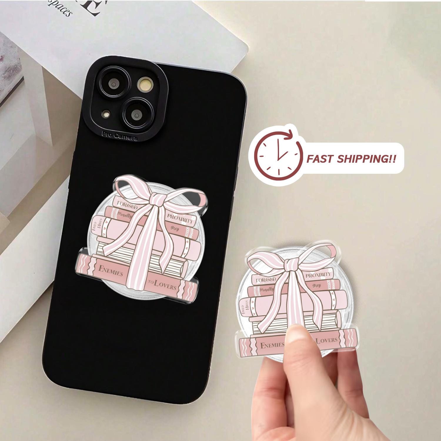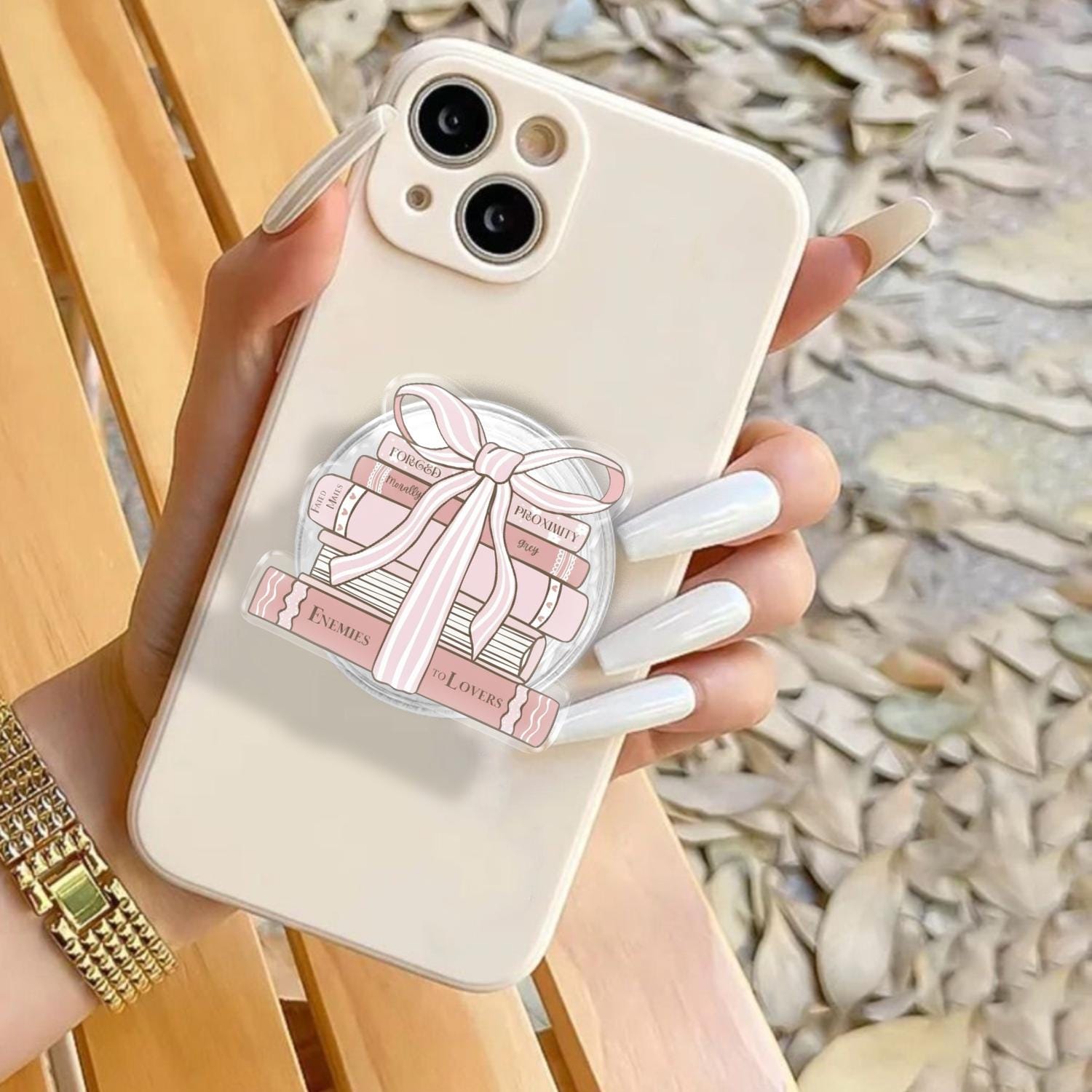 Aesthetic Pink Bow & Book Stack Phone Grip, "Enemies to Lovers" Tropes Design, Universal Magnetic & Adhesive Phone Stand