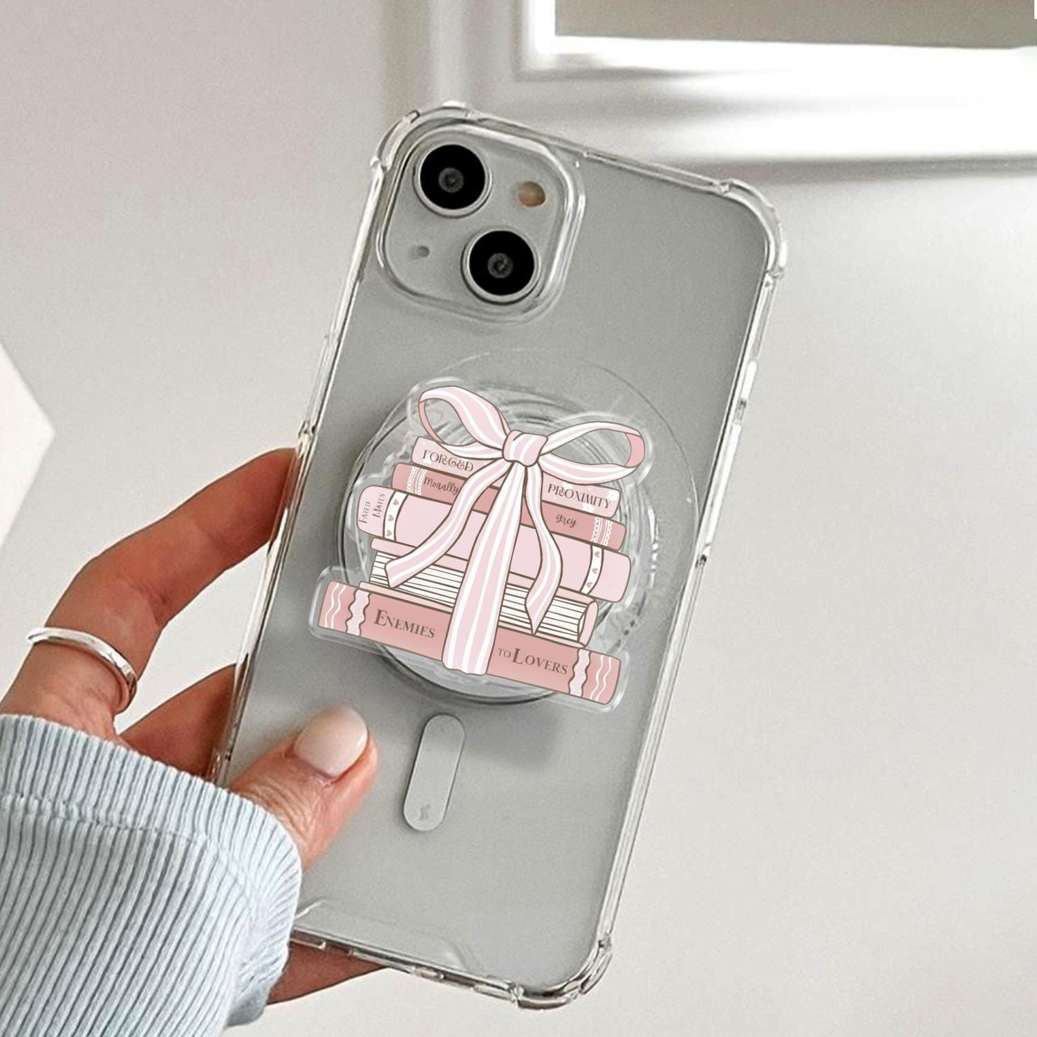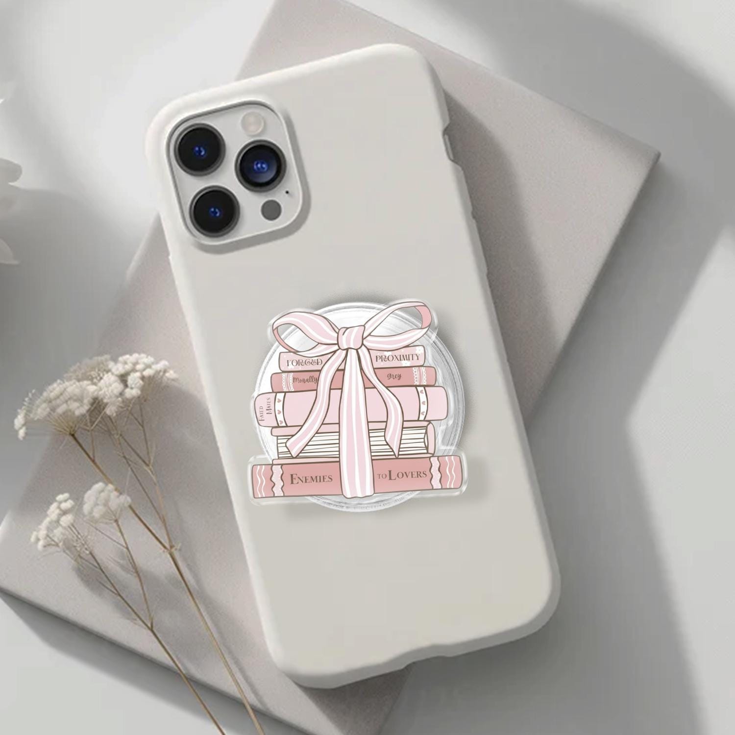 Pink Bow Book Stack Phone Grip, Aesthetic Bibliophile MagSafe Socket, Romantic Enemies to Lovers Gift, Cute Coquette Bookish Mobile Stand