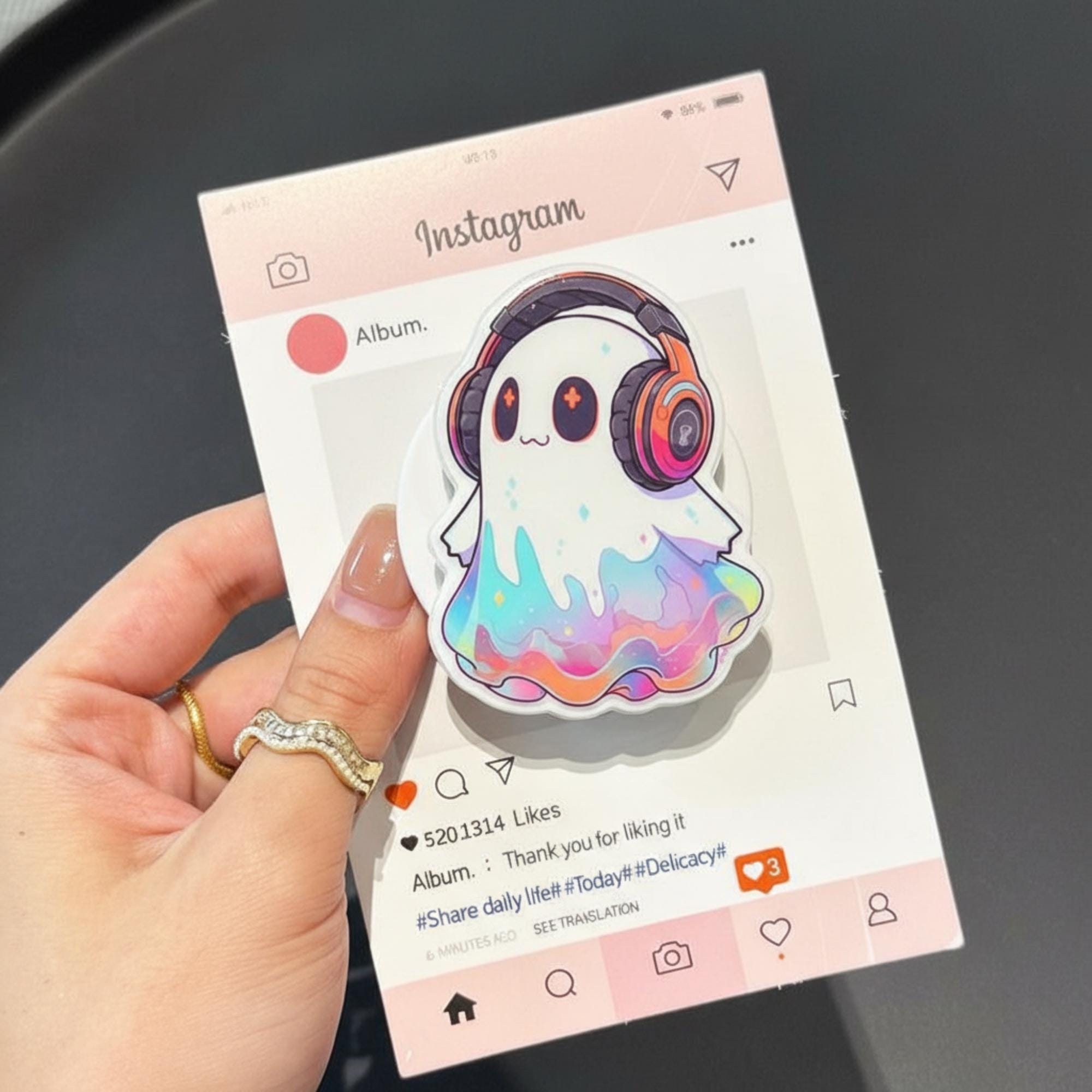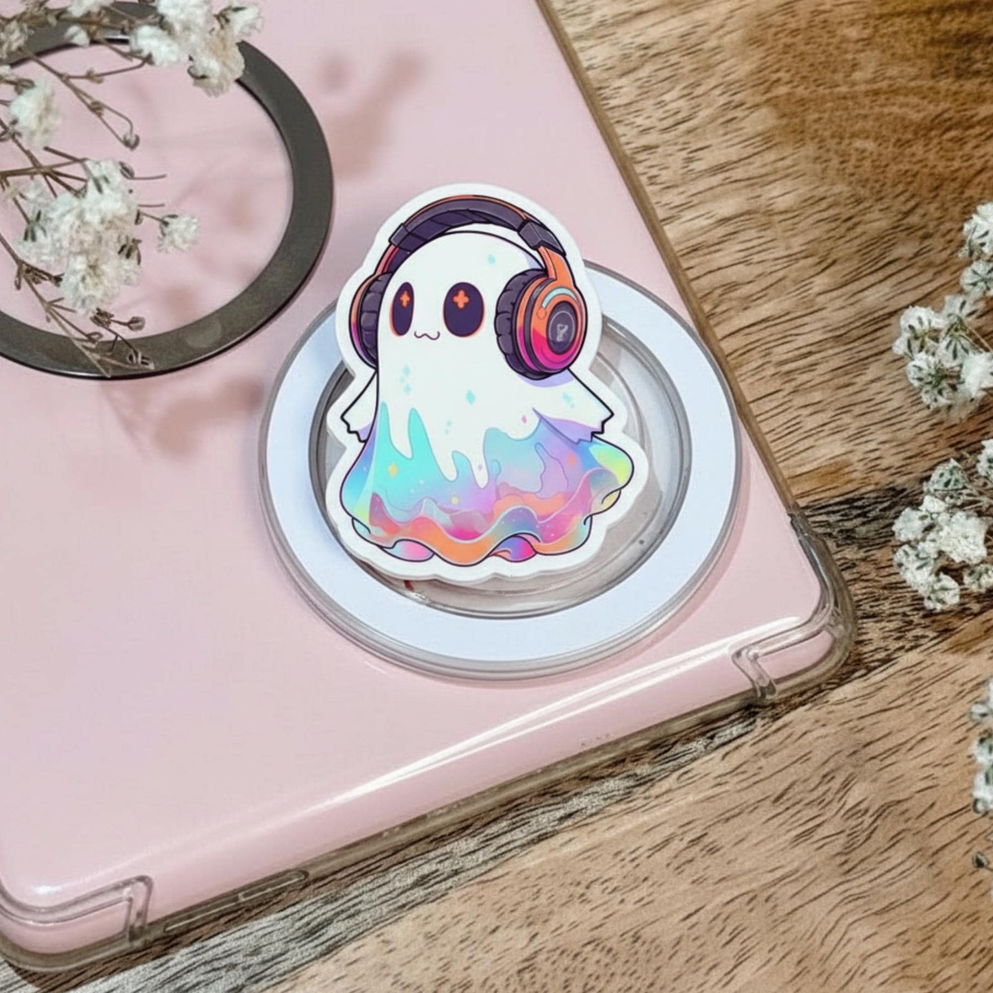 ⭐ Add a fun and colorful vibe to your phone with this Rainbow Ghost Headphones MagSafe Phone Grip! Featuring an adorable kawaii ghost wearing oversized headphones with a glowing rainbow gradient, this design is perfect for music lovers, spooky-cute fans, and anyone who loves aesthetic phone accessories.