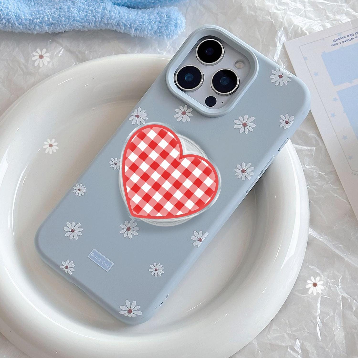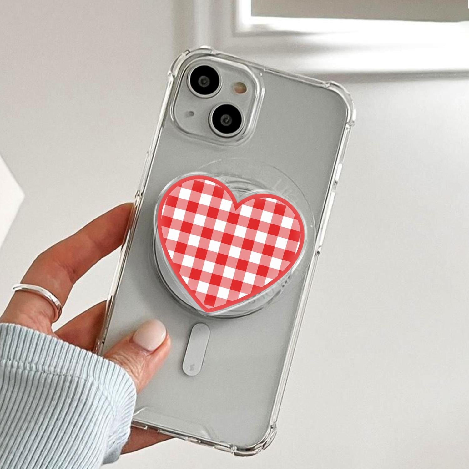 Red Gingham Heart Phone Grip, Aesthetic Coquette MagSafe Pop Socket, Cute Picnic Party Gift, Vintage Plaid Valentine Mobile Stand