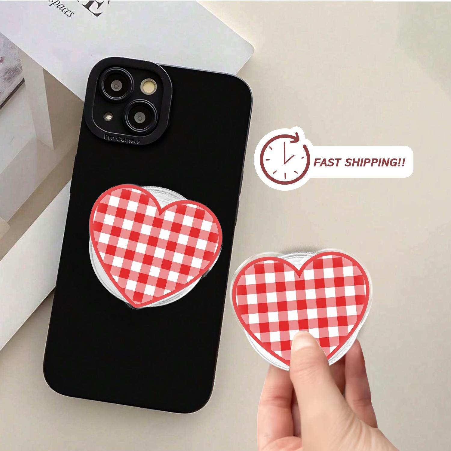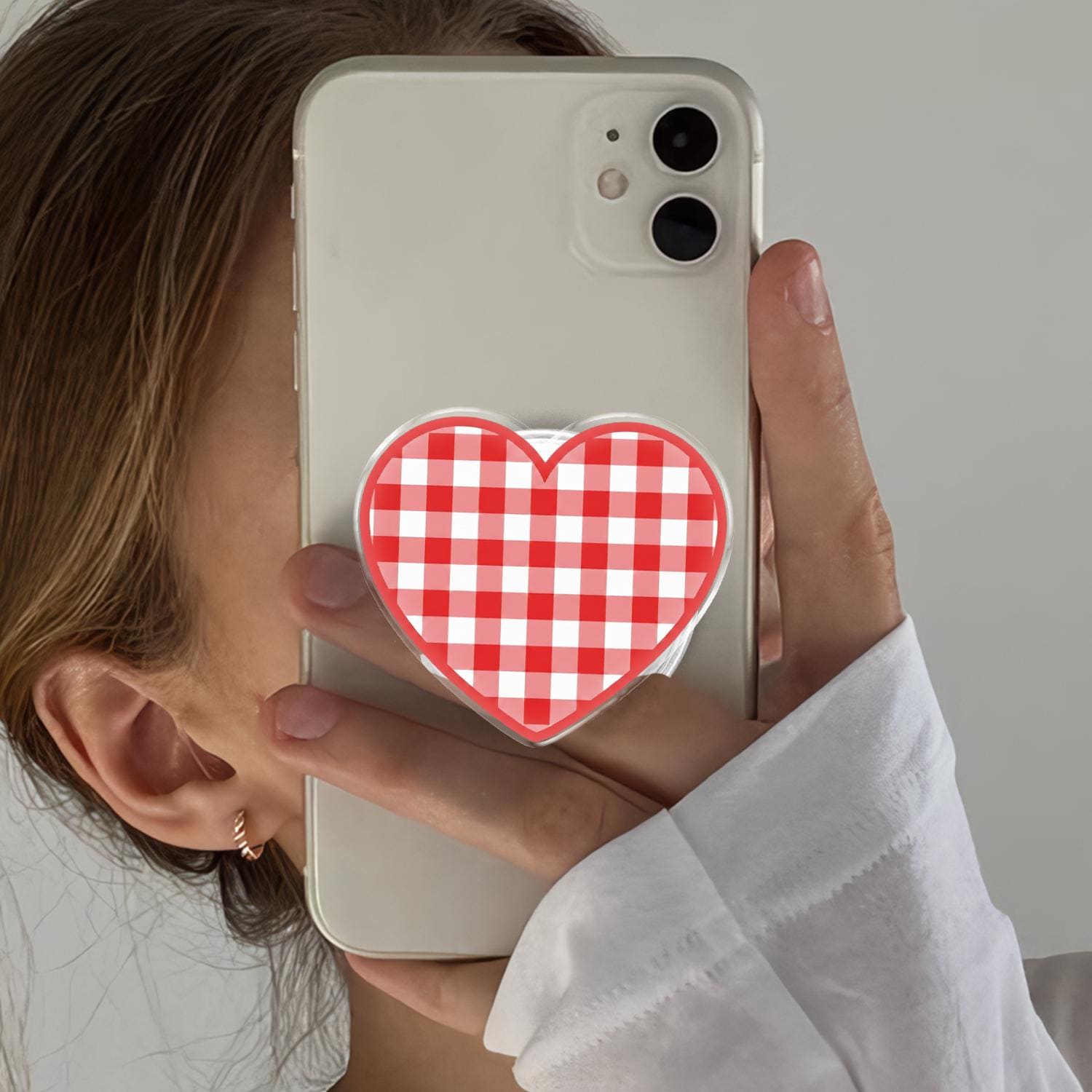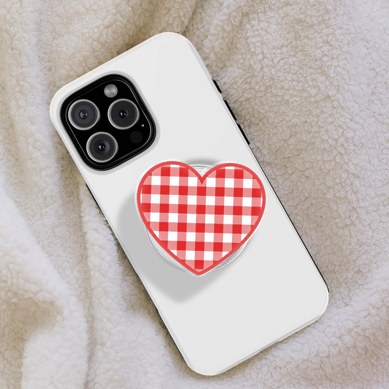 Timeless Gingham Design: This phone grip features a high-definition red and white checkered pattern set within a charming heart silhouette.