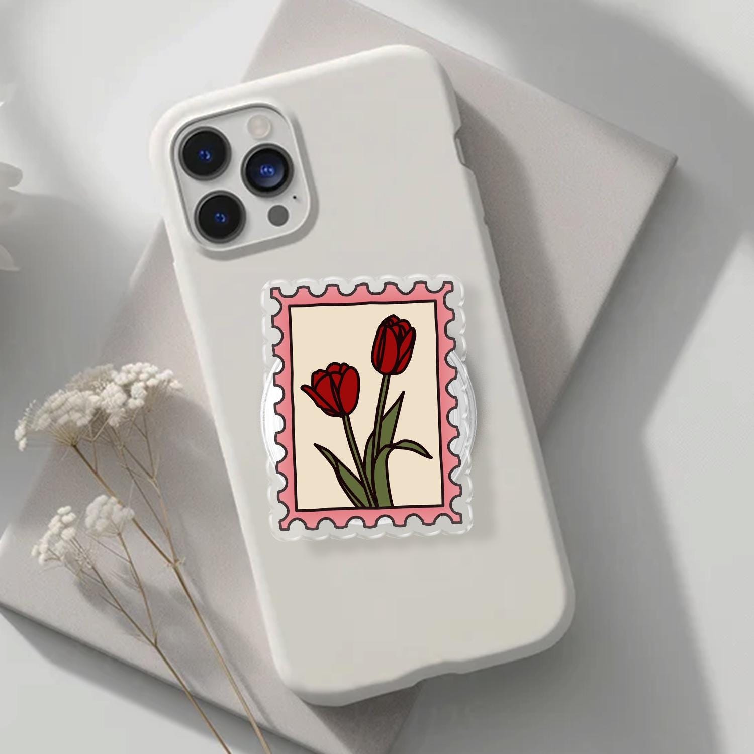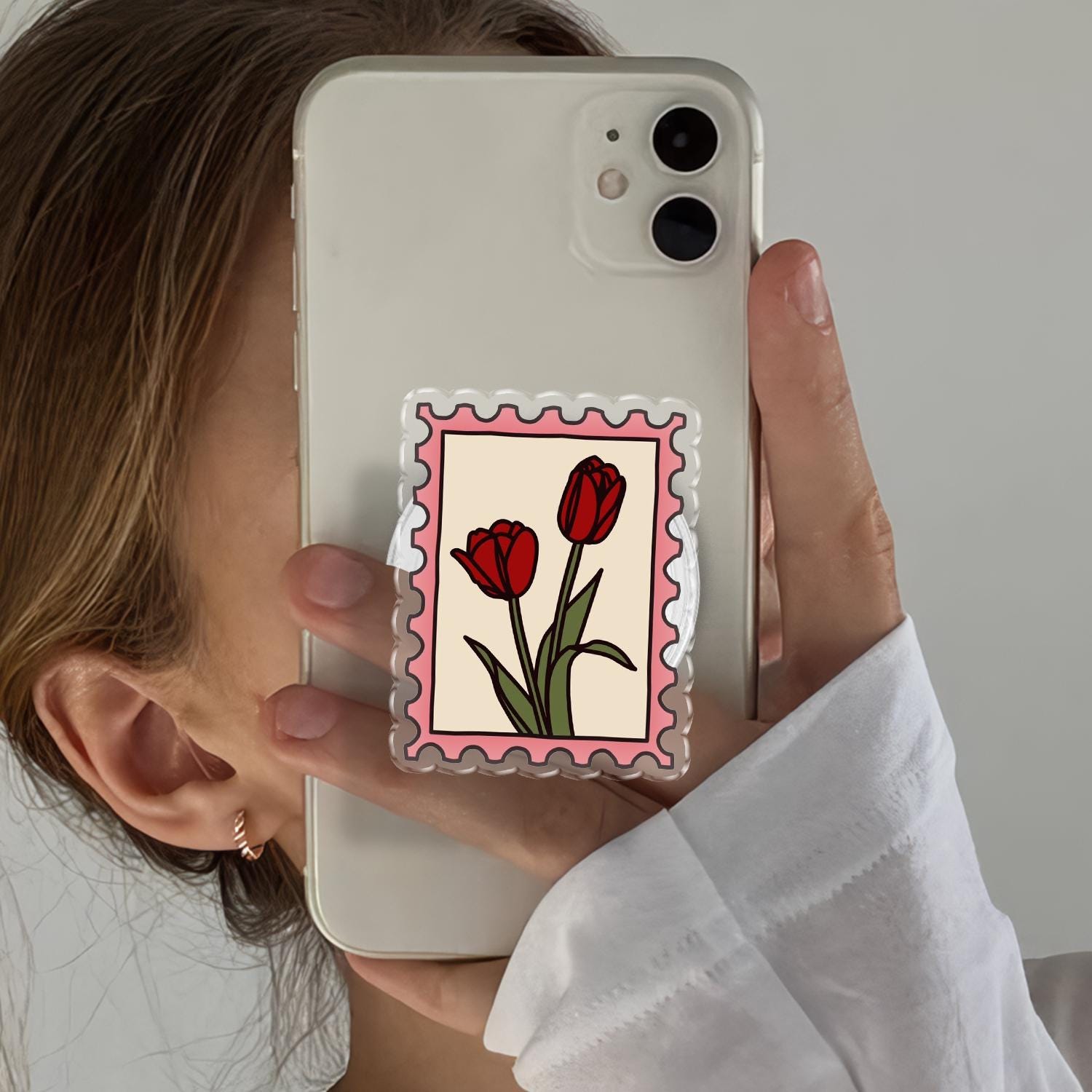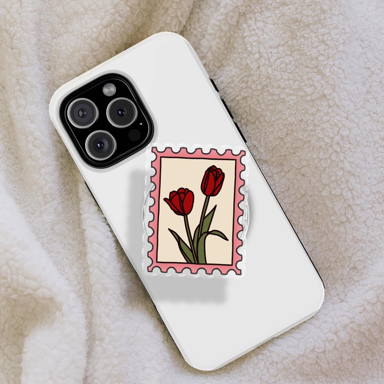 Red Tulip Stamp Phone Holder, Vintage Floral Postage Grip, Aesthetic Flower Stationery Phone Stand, Retro Botanical Gift, Cute Kindle Socket