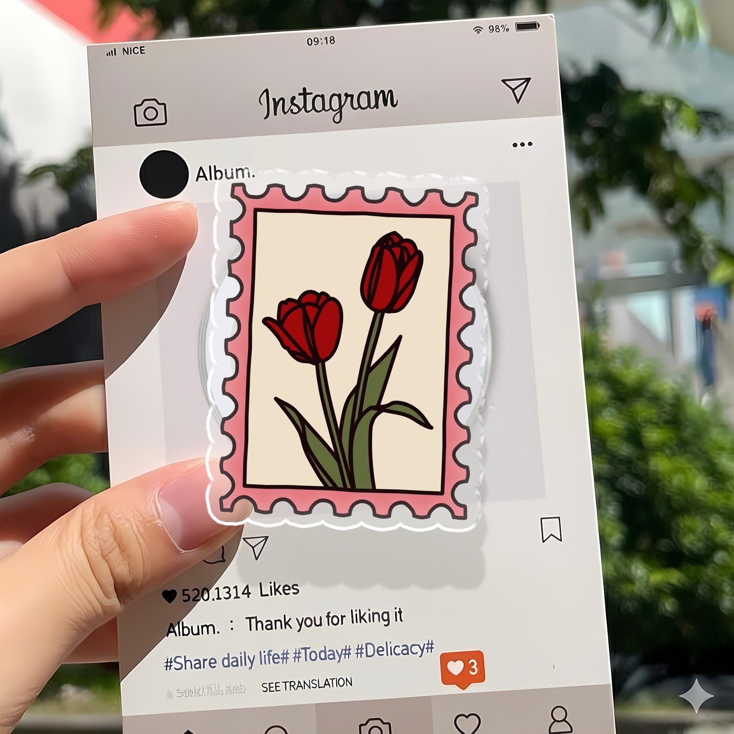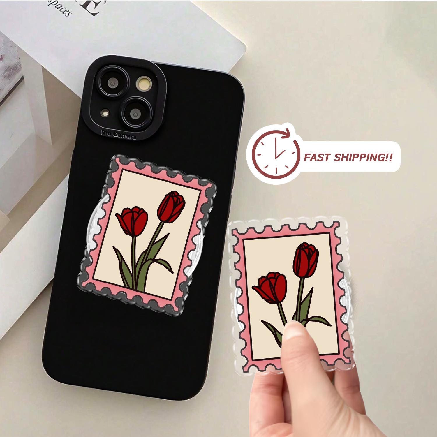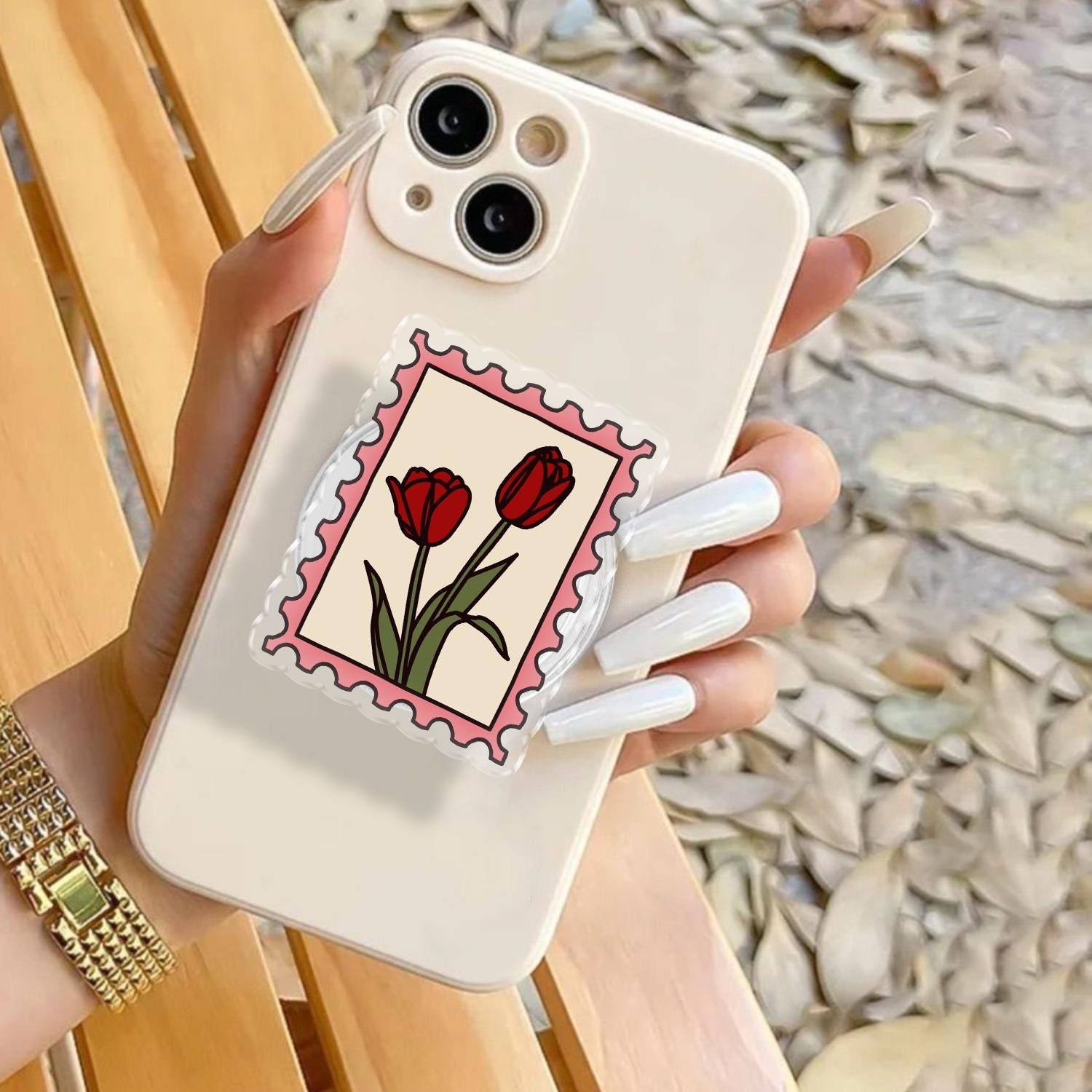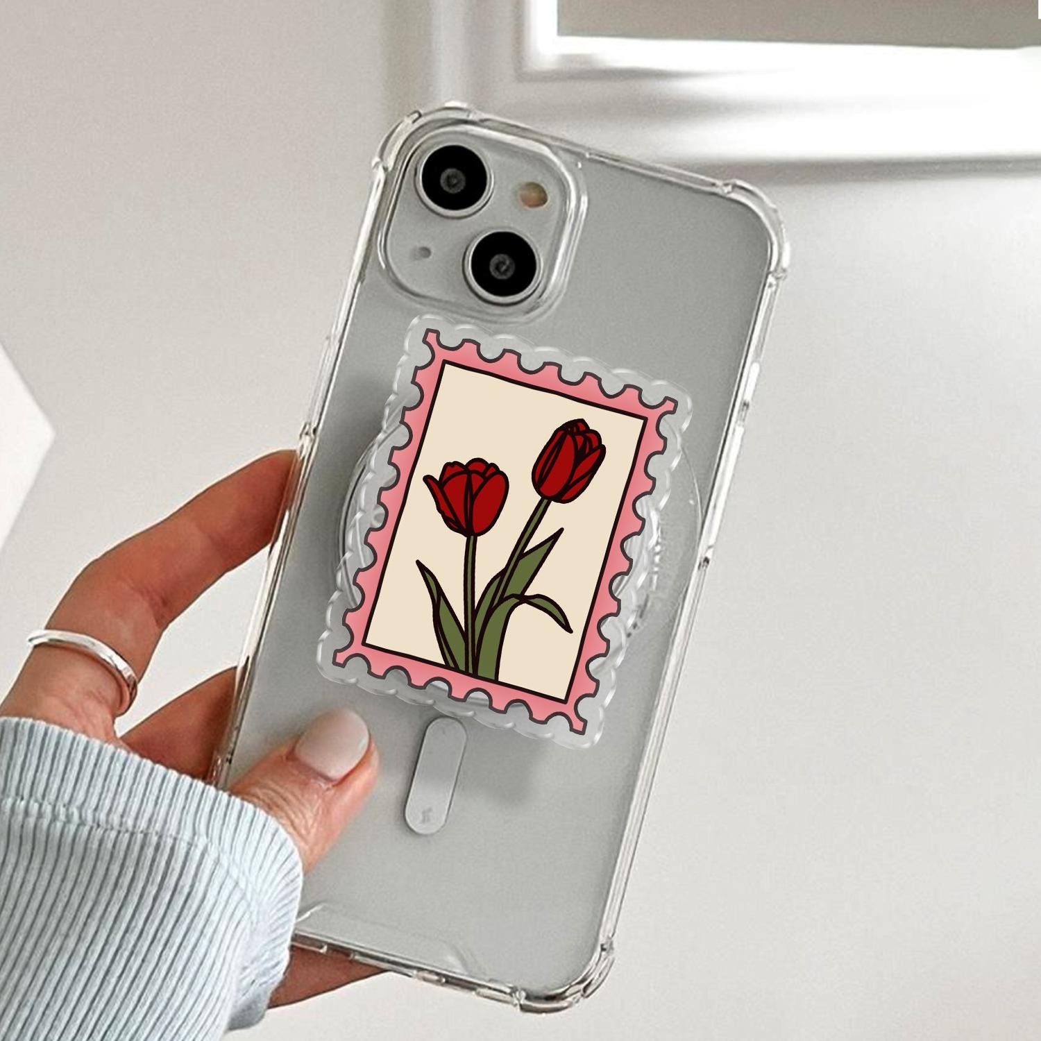 Red Tulip Stamp Phone Holder, Vintage Floral Postage Grip, Aesthetic Flower Stationery Phone Stand, Retro Botanical Gift, Cute Kindle Socket