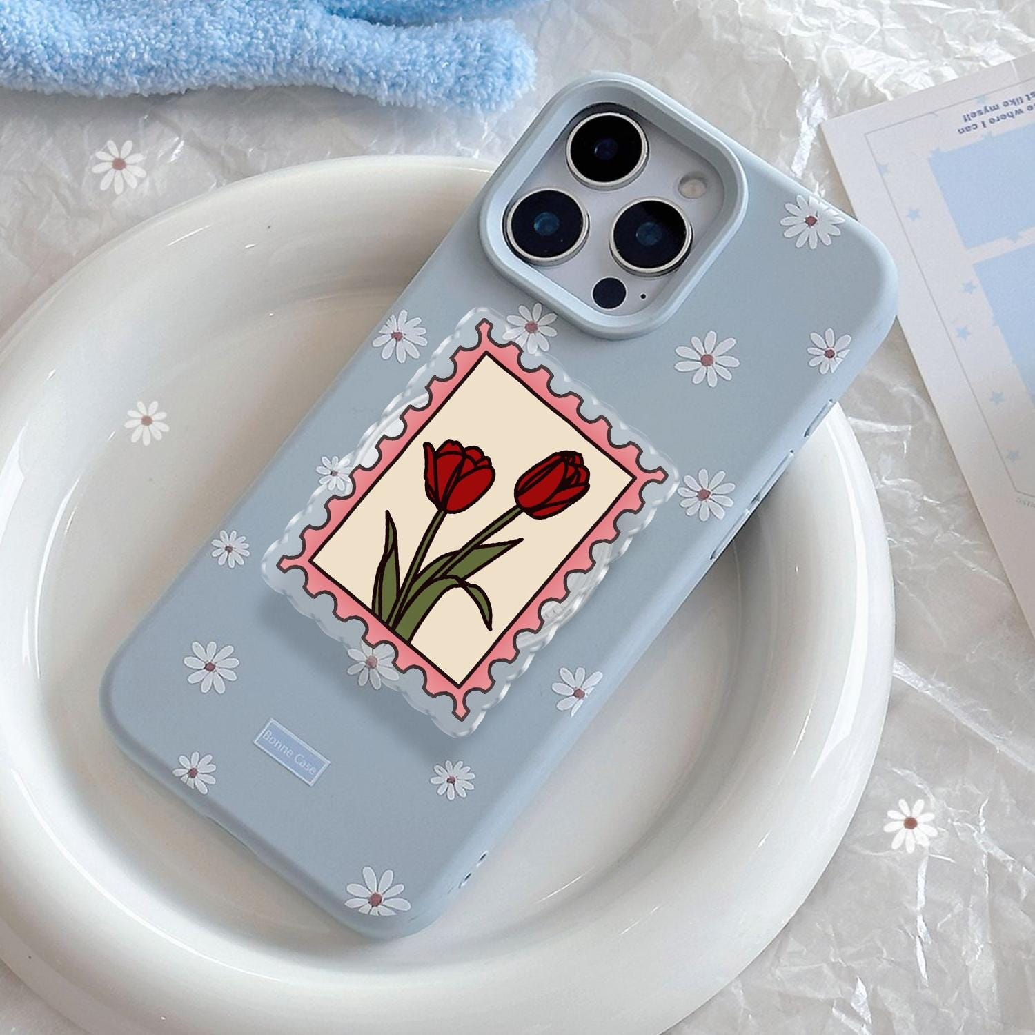 Vintage Stationery Artistry: This phone holder features a charming hand-drawn pair of red tulips set within a classic pink scalloped postage stamp border for a nostalgic, cottagecore feel.