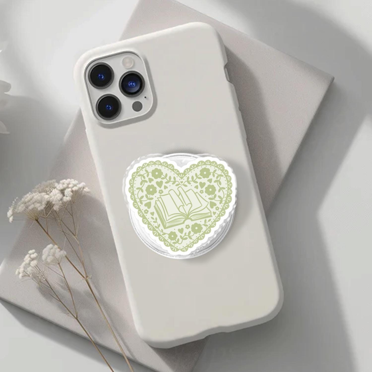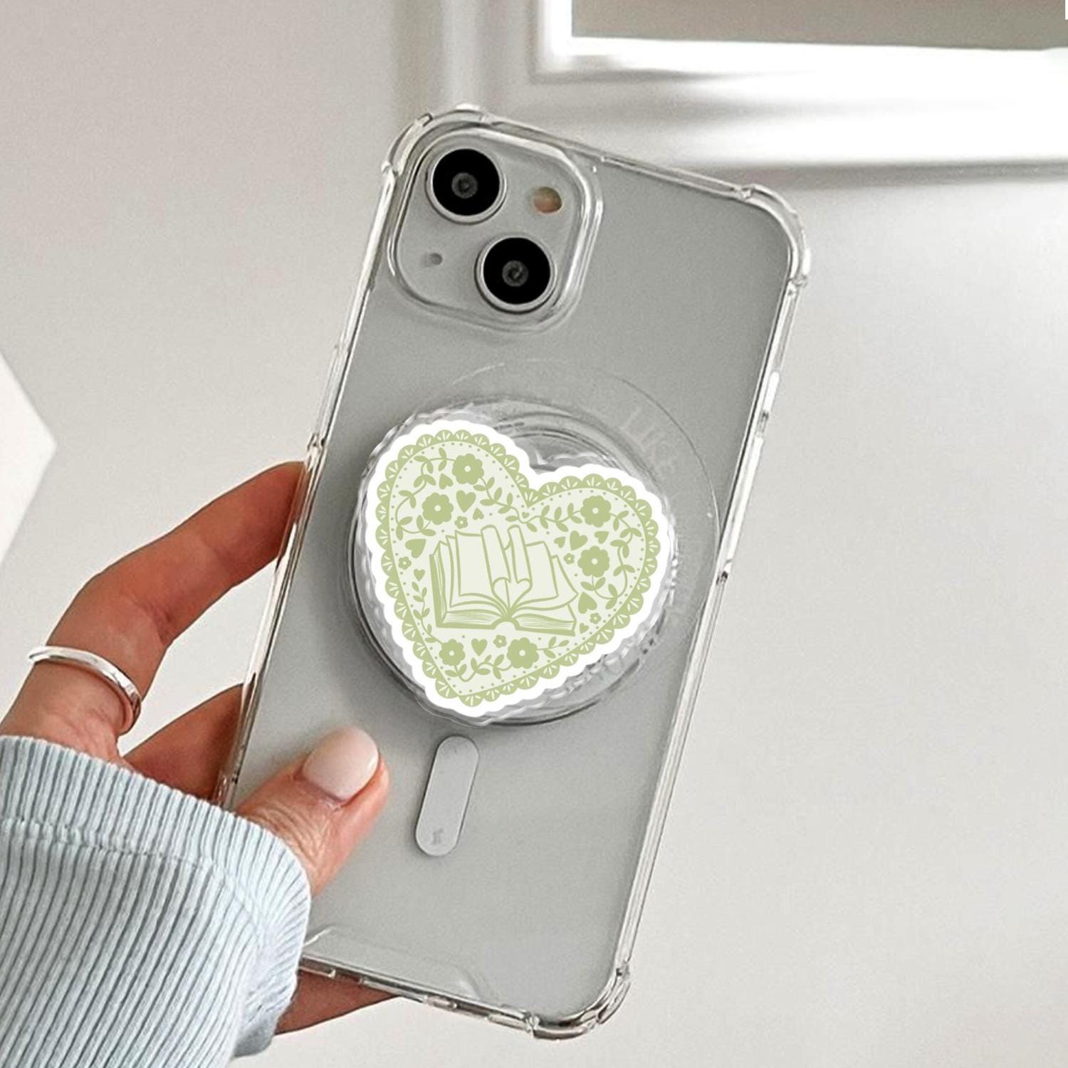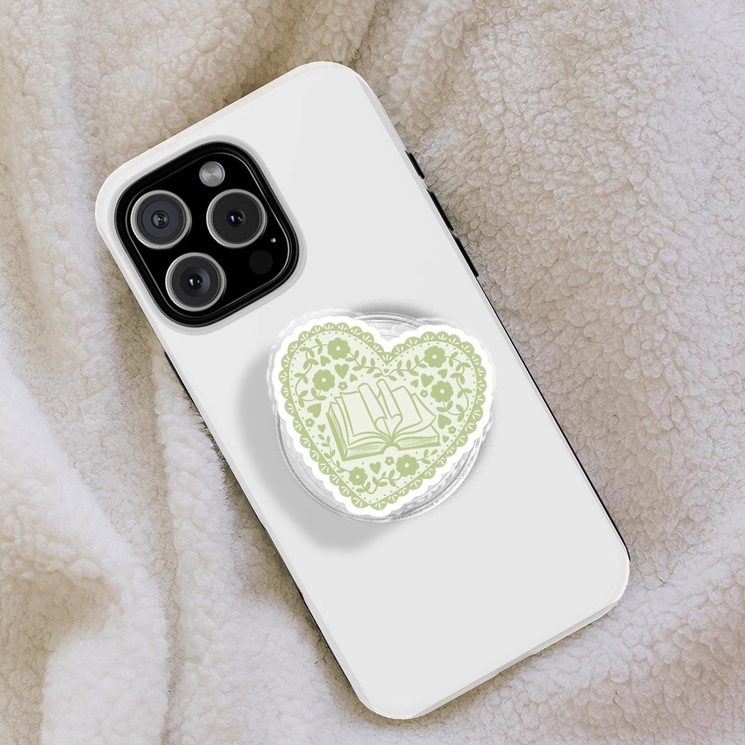Aesthetic Sage Green Heart Phone Holder with Floral Book Illustration, Cute Cottagecore Stand, Universal Magnetic & Adhesive Phone Grip