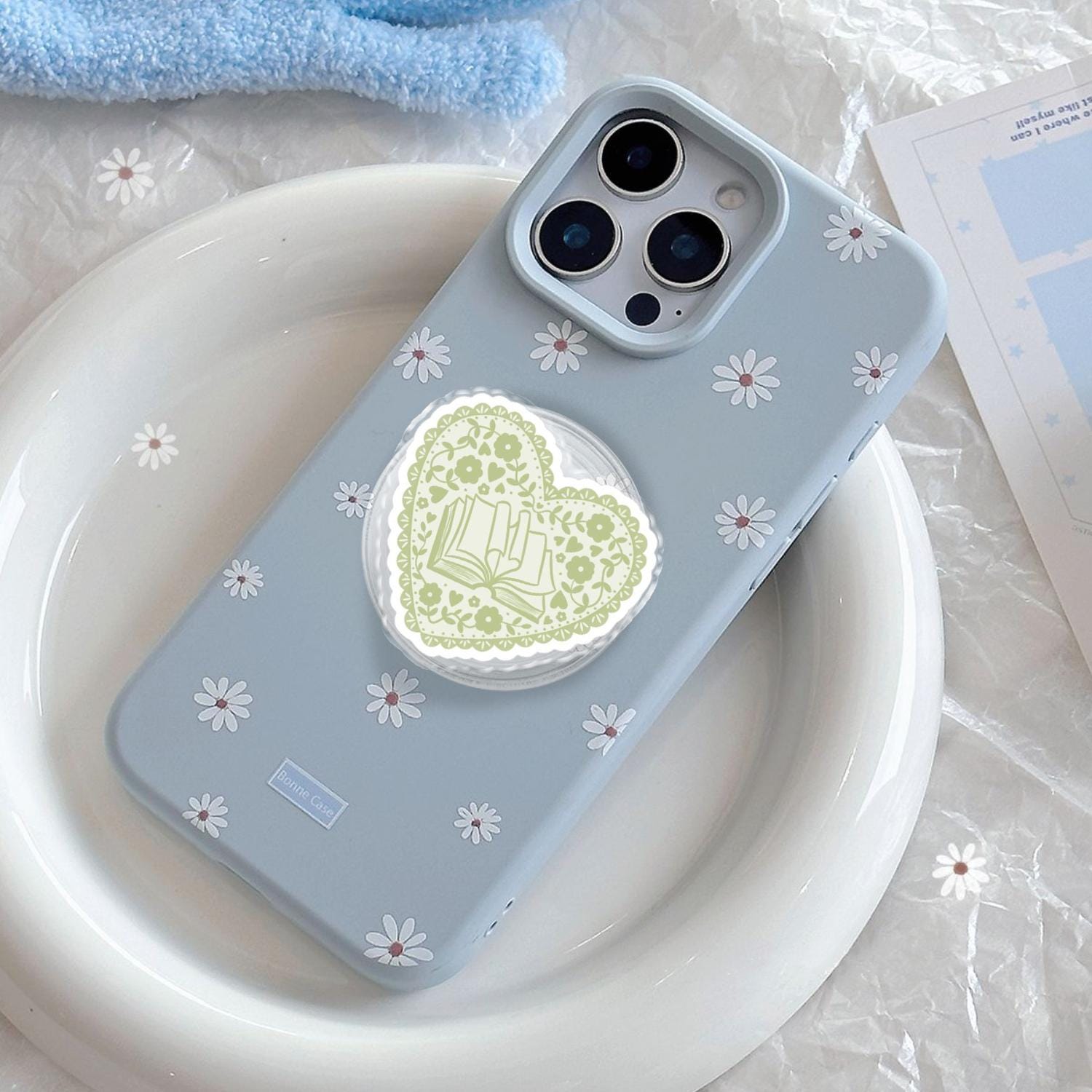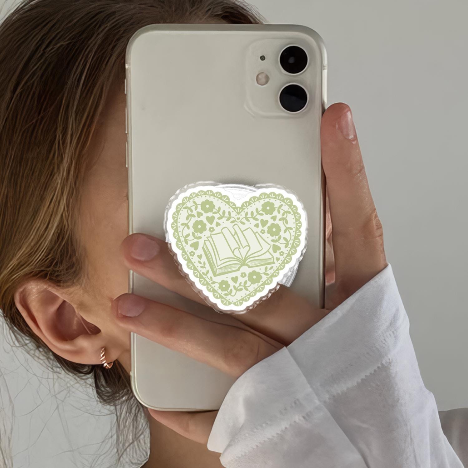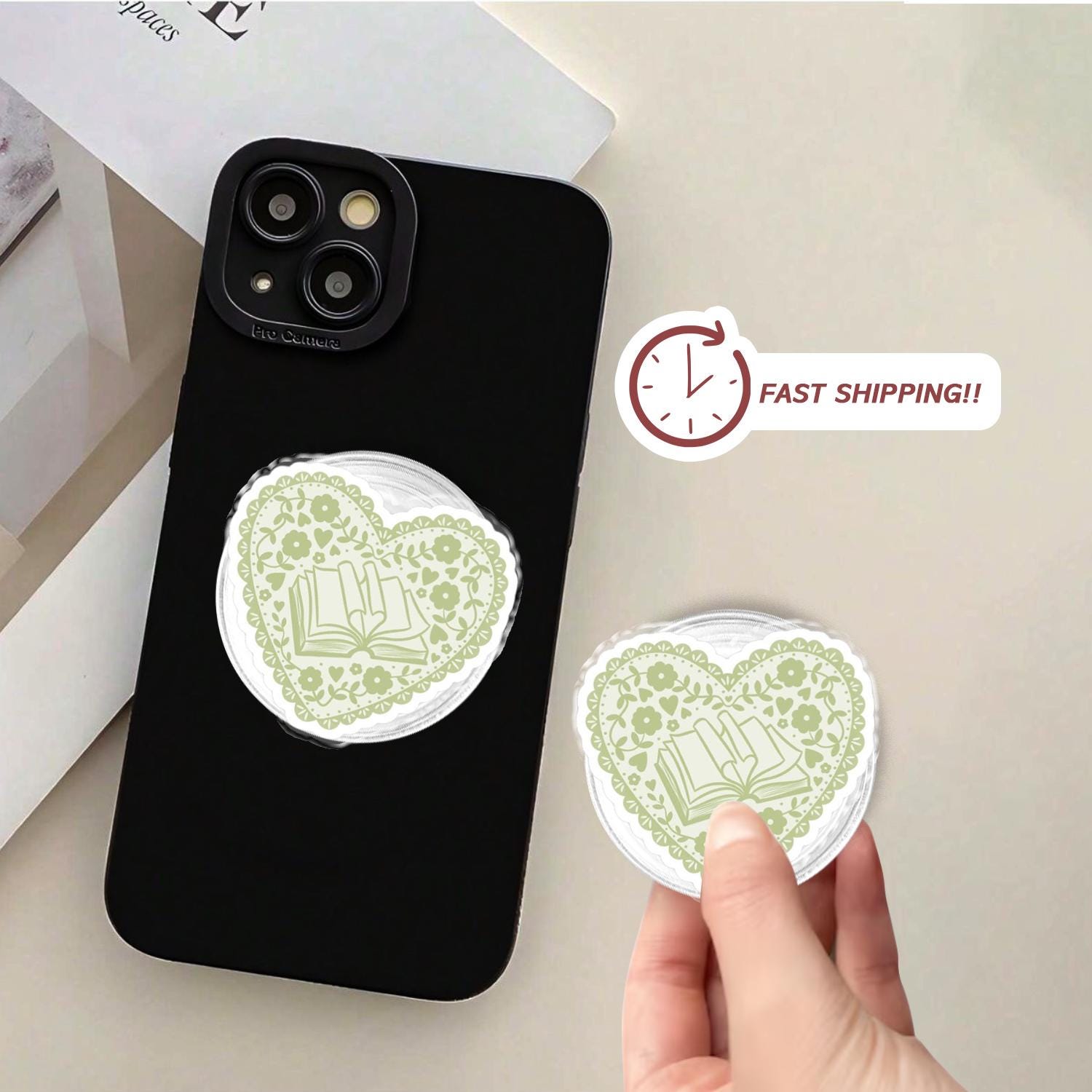 Aesthetic Sage Green Heart Phone Holder with Floral Book Illustration, Cute Cottagecore Stand, Universal Magnetic & Adhesive Phone Grip
