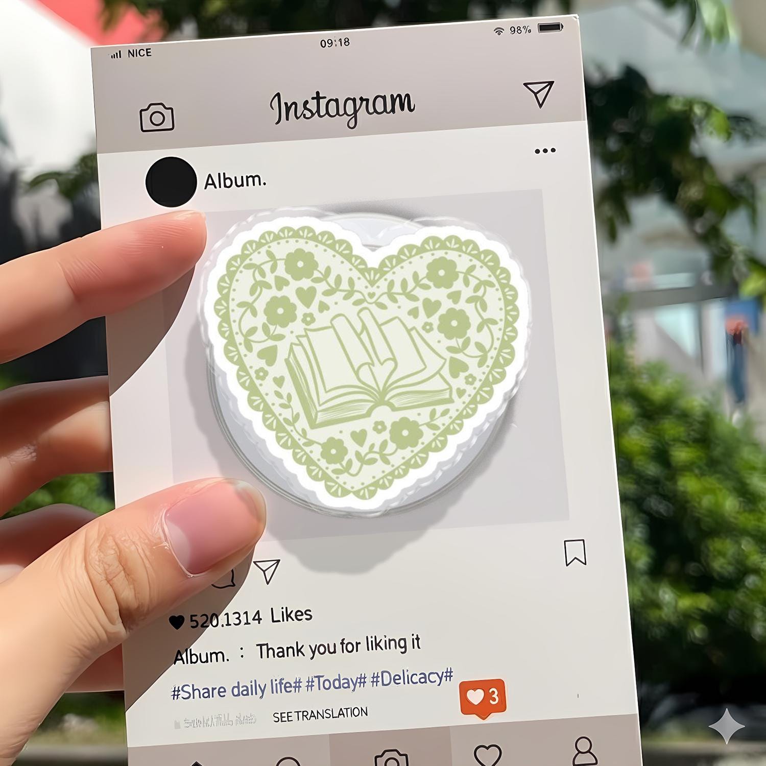 Whimsical Literary Artistry: This phone holder features a delicate sage green heart with a scalloped lace border, centered with a hand-drawn open book surrounded by dainty flowers and leaves.