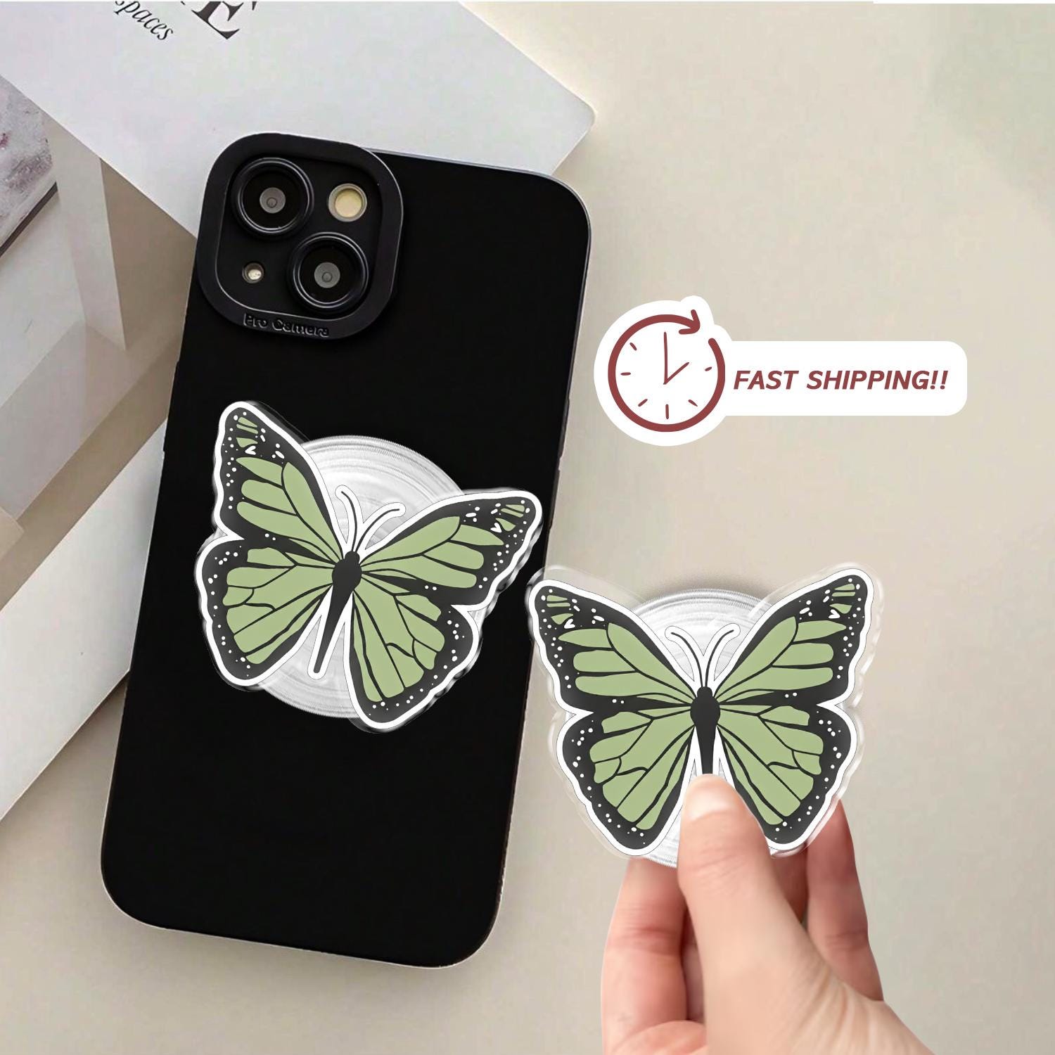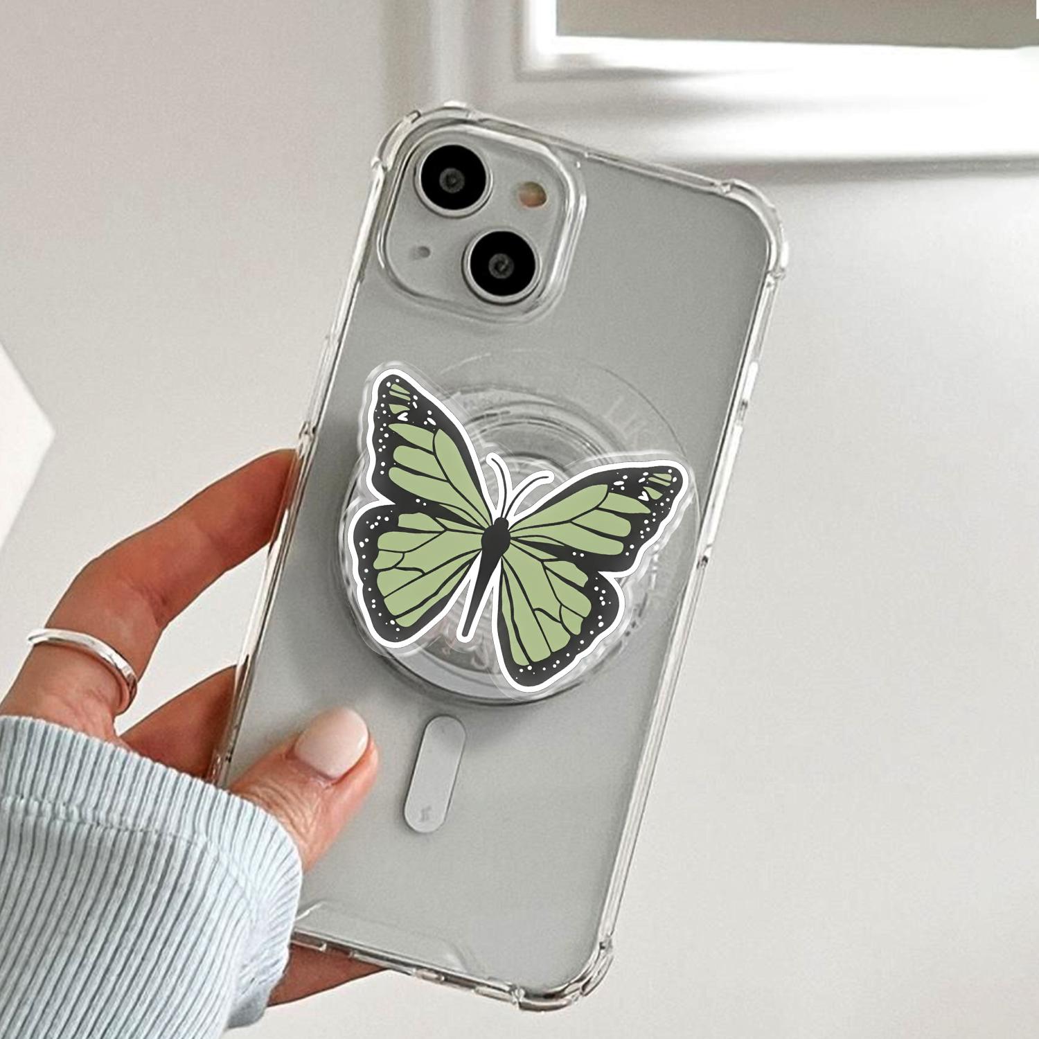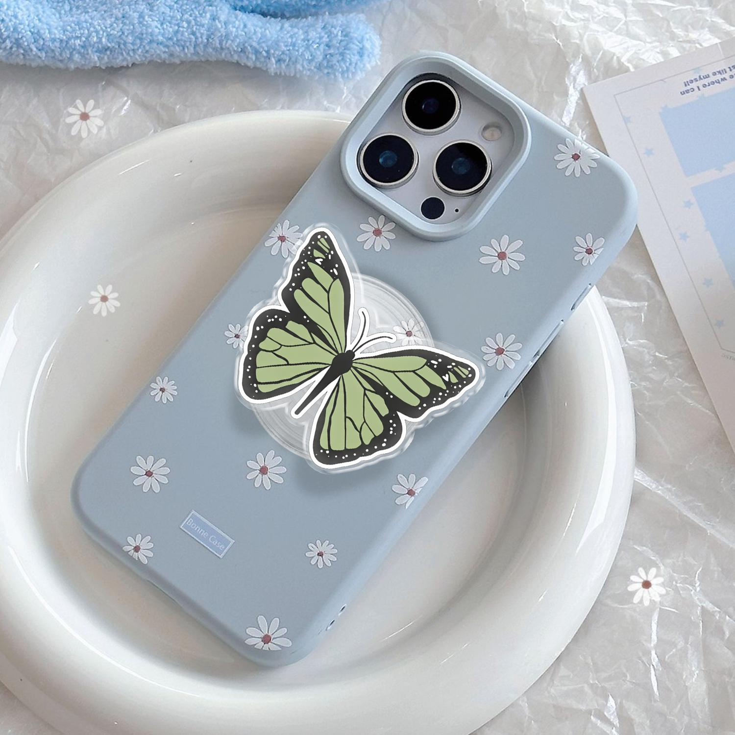 Detailed Butterfly Artistry: This phone grip features a high-definition illustration of a delicate butterfly in a calming sage green hue, capturing the intricate patterns and elegant curves of natural wings.