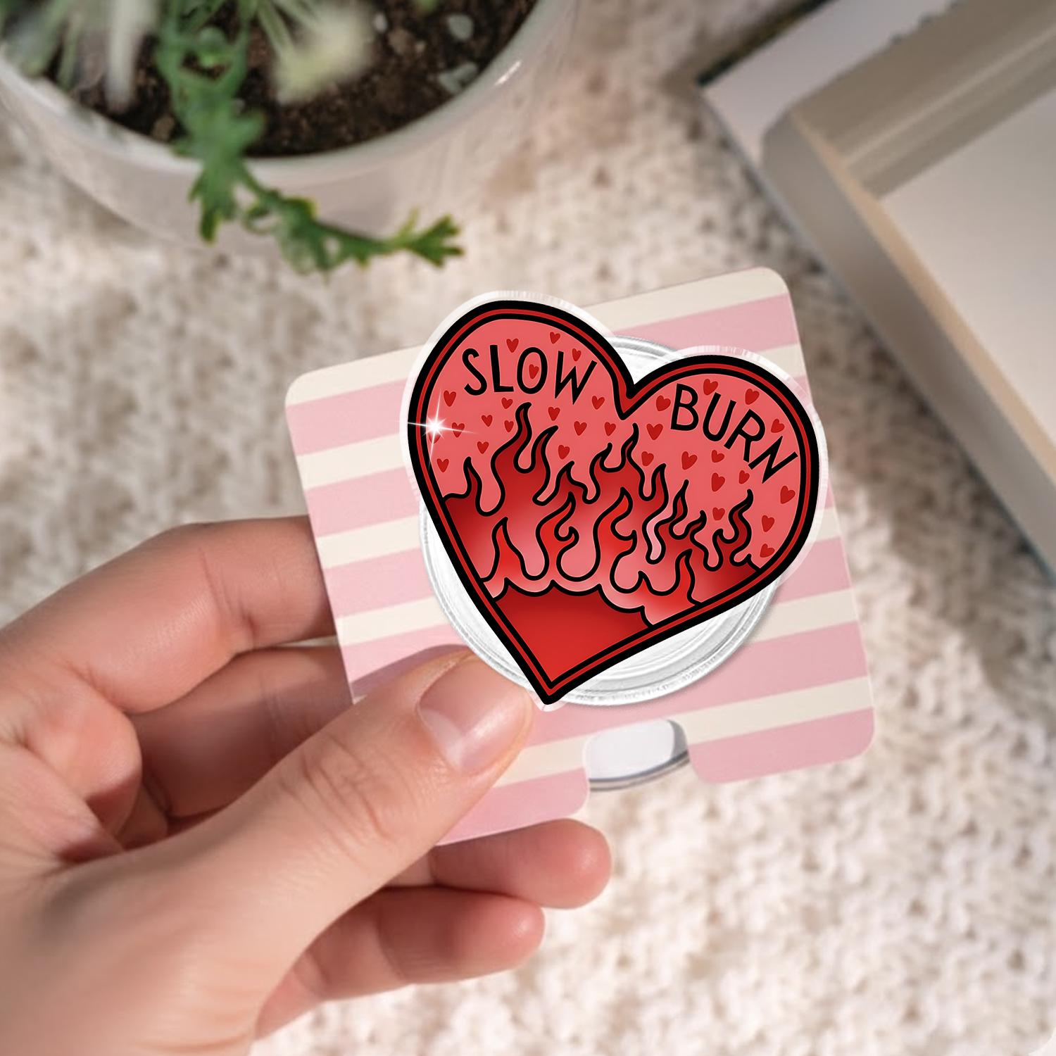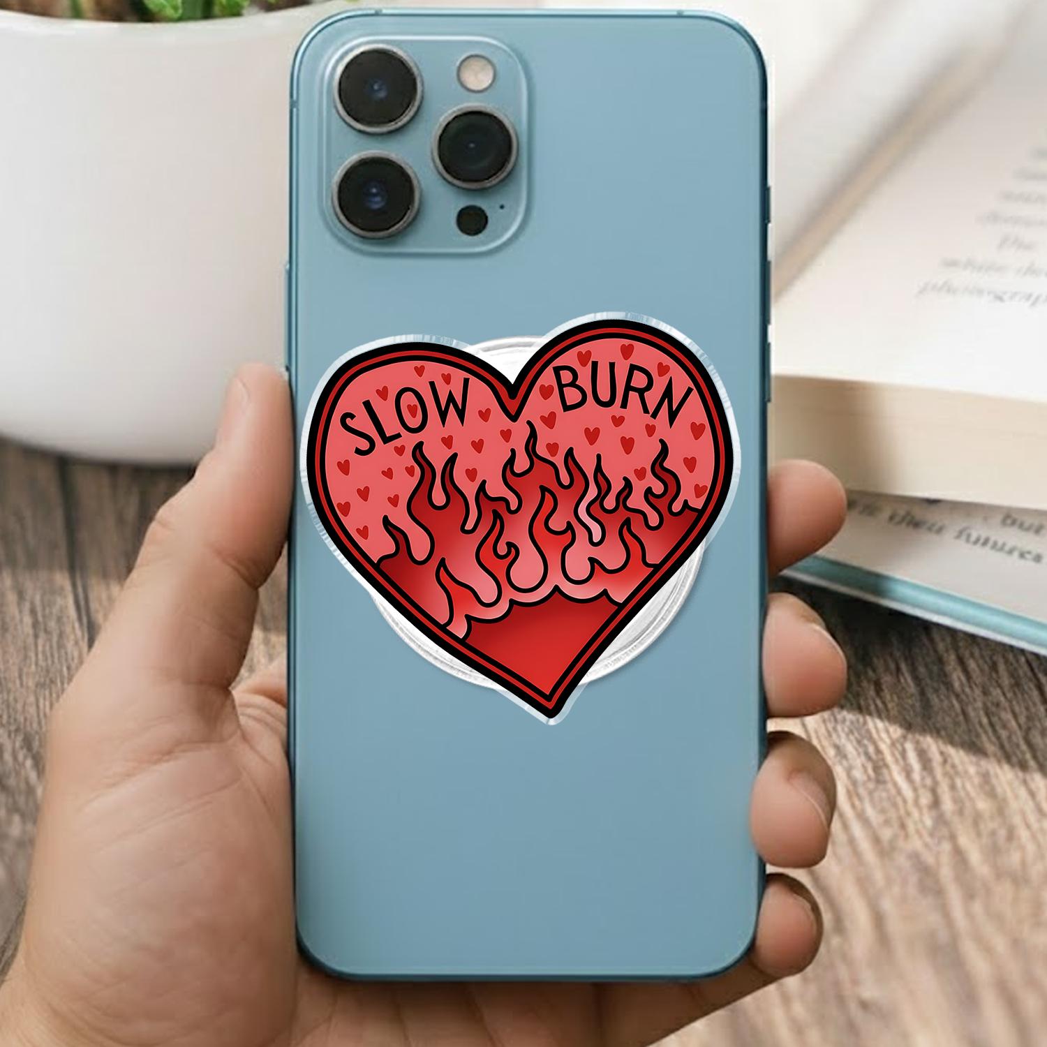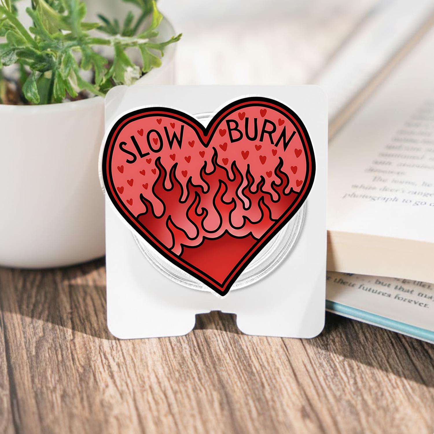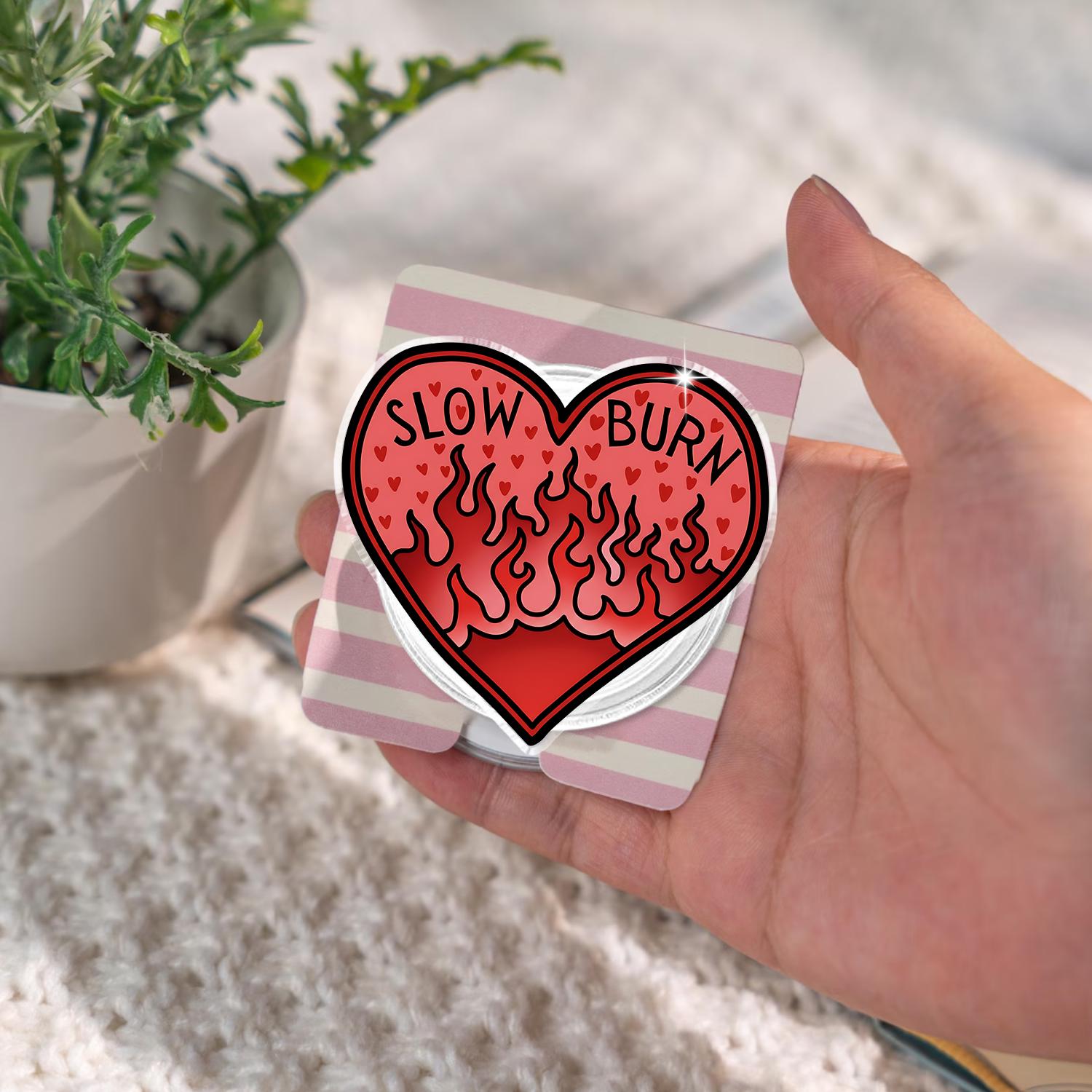 Featuring a bold and fiery heart design with the text "SLOW BURN" and flames, this magnetic phone grip is perfect for those who love spicy romance and want to add some fun and personality to their phone accessories.