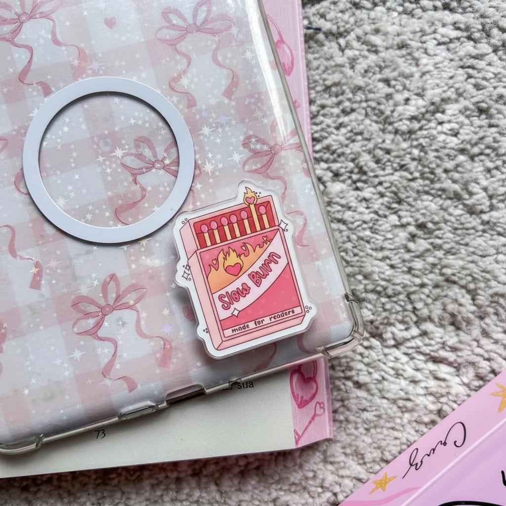 Turn up the heat on your reading routine with this Slow Burn Romance MagSafe Phone Grip, designed like a vintage matchbox with pink and red tones, glowing matchsticks, and a heart-shaped flame. Perfect for romance readers and cozy introverts, this magnetic grip adds a flirty spark to your phone, Kindle, or tablet. Whether you're deep into a slow-burn love story or scrolling through BookTok, this popgrip is your perfect companion.