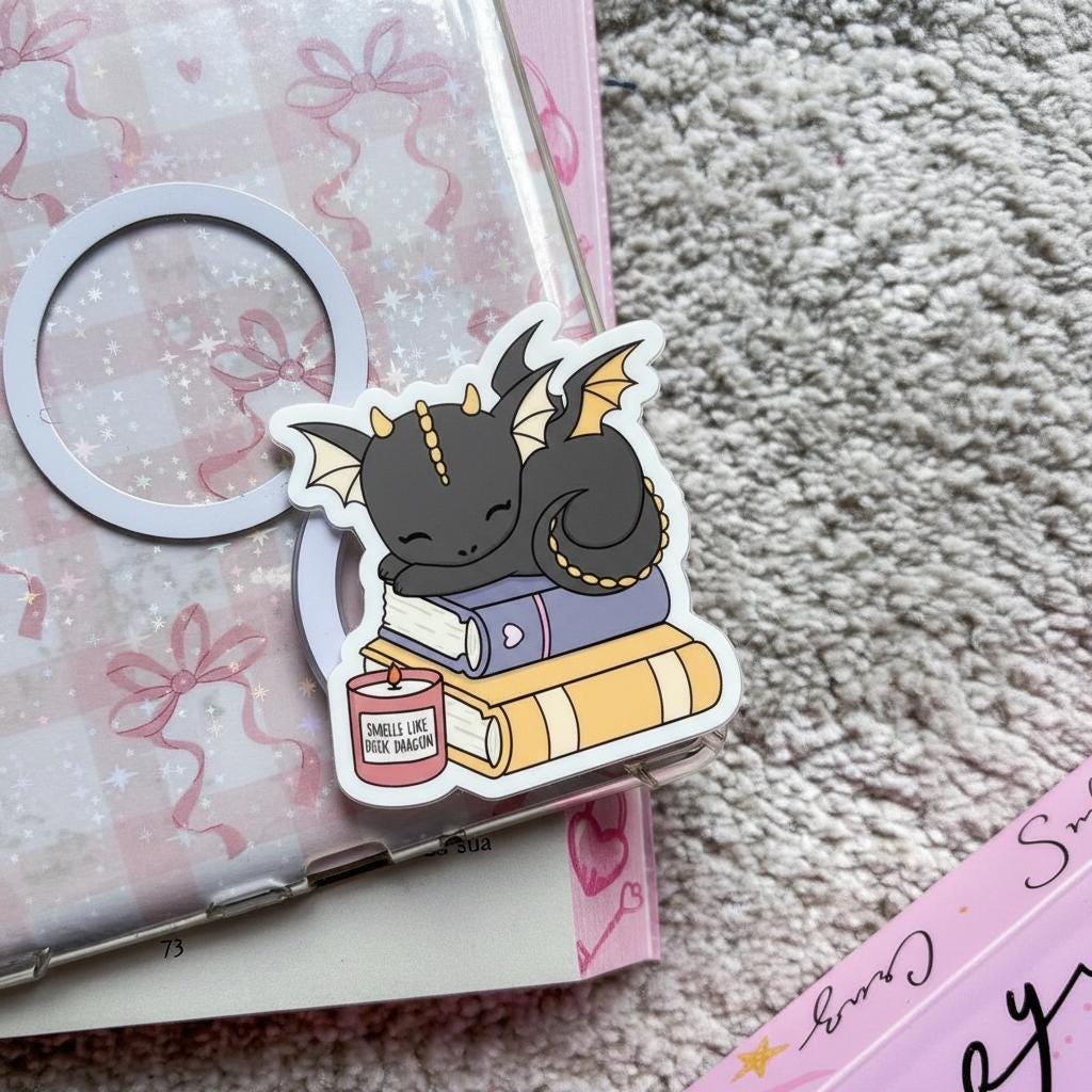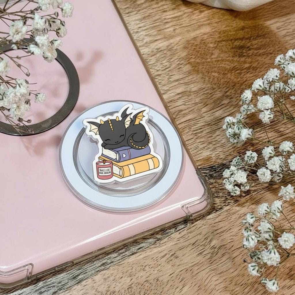 Add a touch of magic to your everyday tech with this whimsical Smells Like Real Dragon MagSafe Phone Grip. Featuring a sleepy black dragon curled up on a stack of books beside a candle labeled “Smells Like Real Dragon”, this fantasy-themed grip is perfect for readers who love cozy vibes and mythical creatures. Whether you're reading on your Kindle or relaxing with your favorite fantasy novel, this popgrip brings charm, comfort, and a spark of imagination to your device.