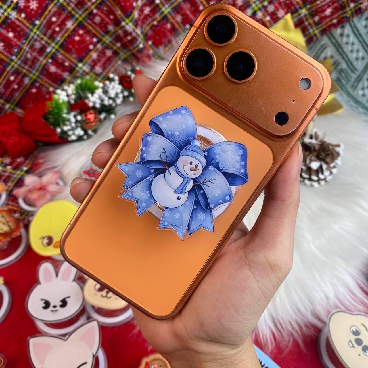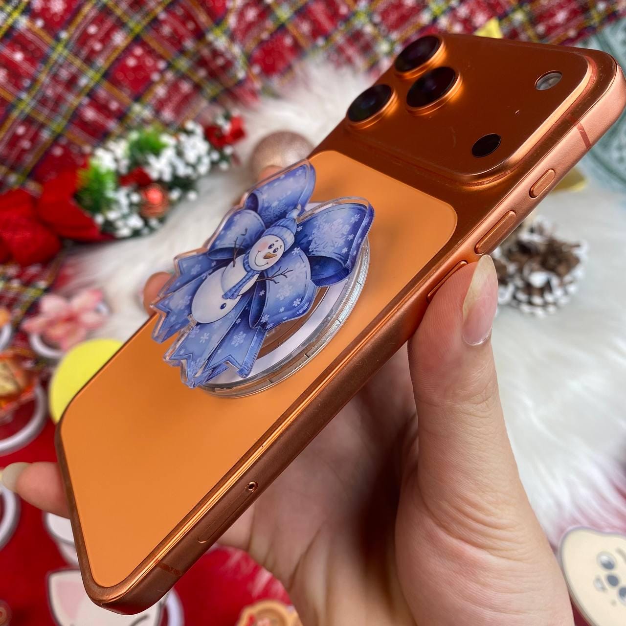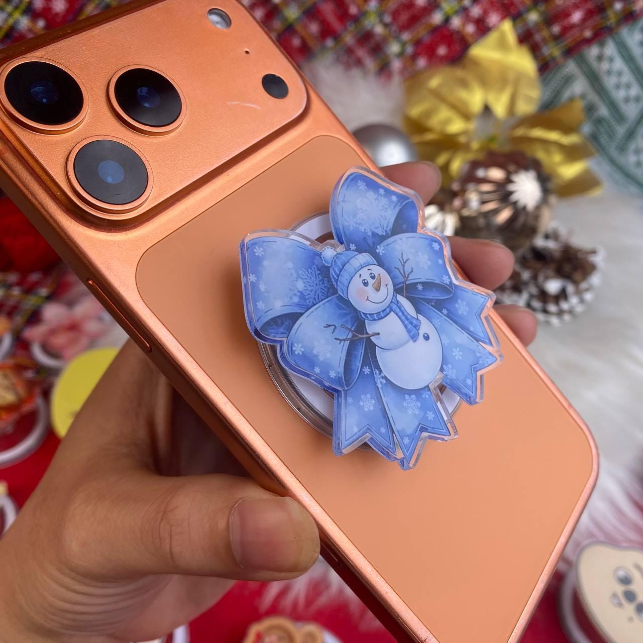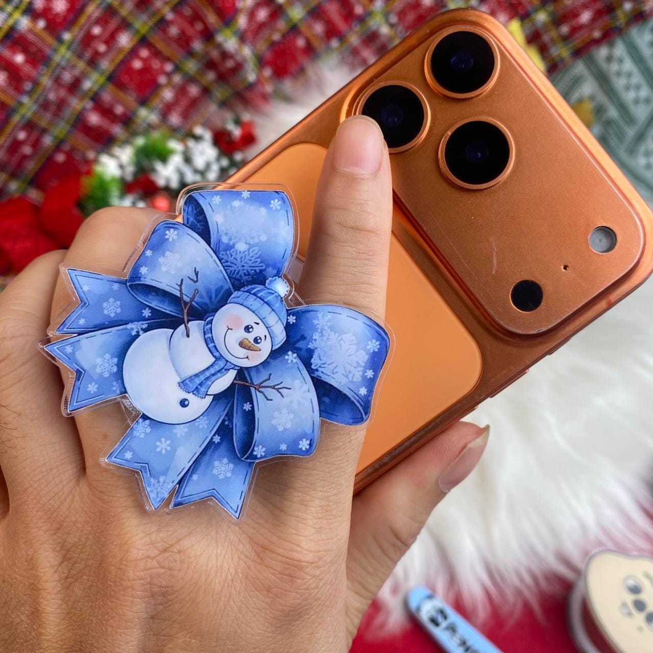 Snowman Phone Grip, Holiday Christmas Phone Stand, Blue Bow