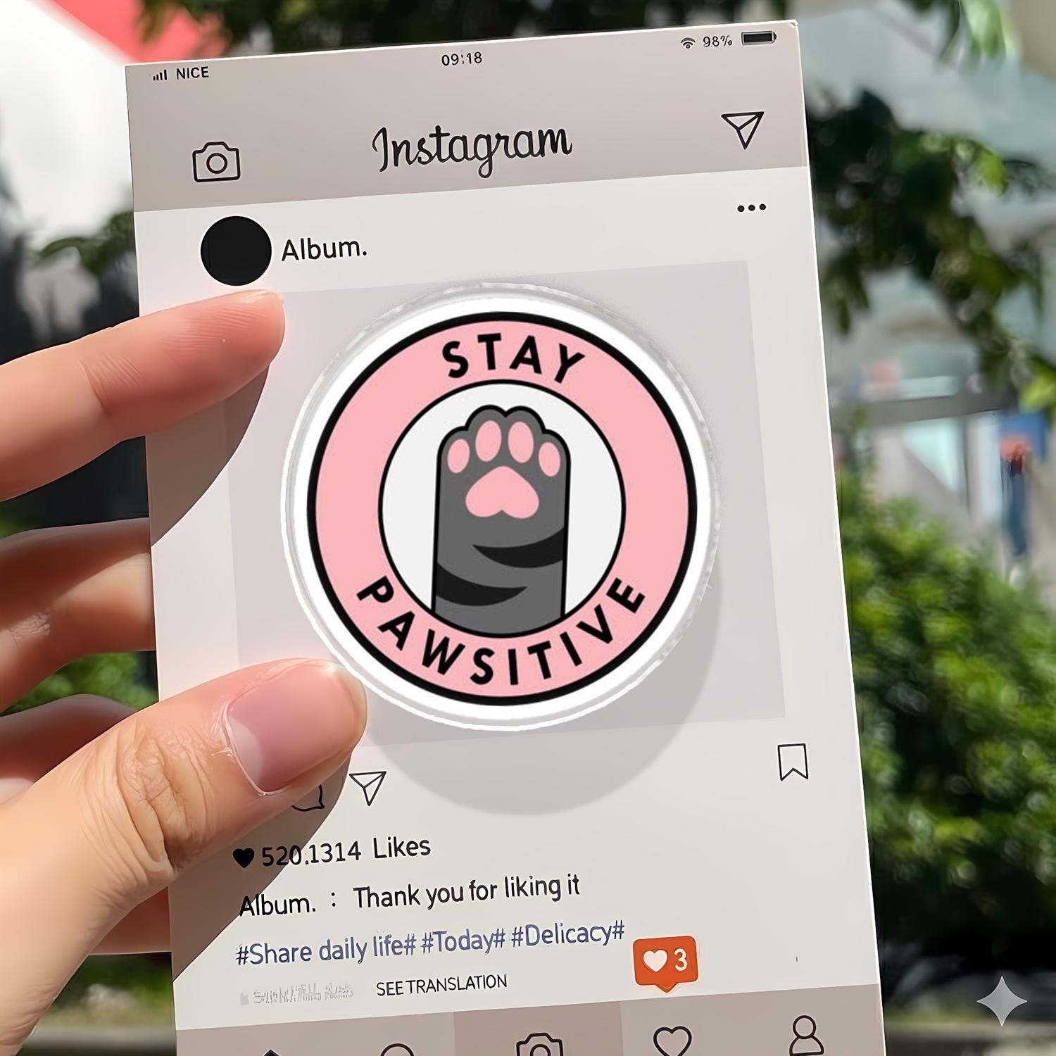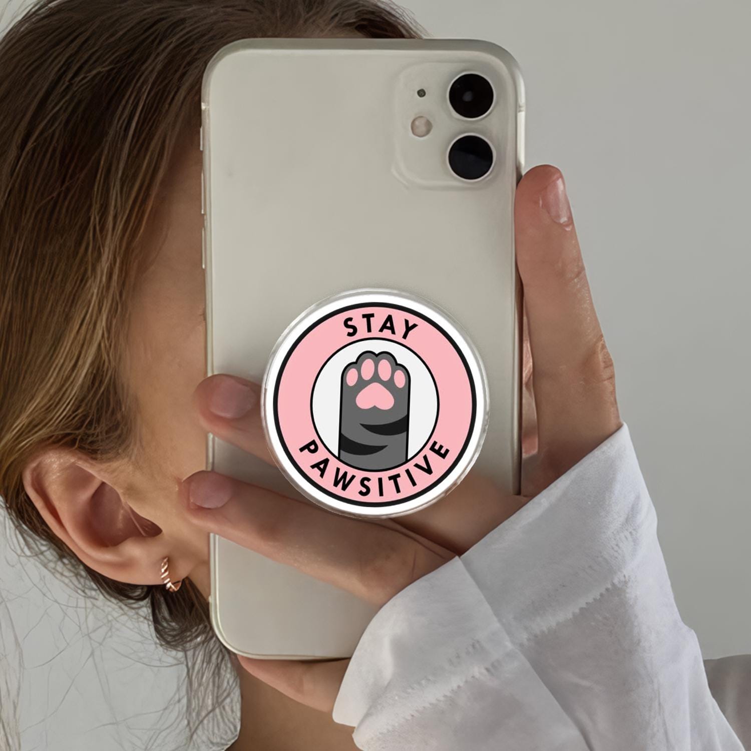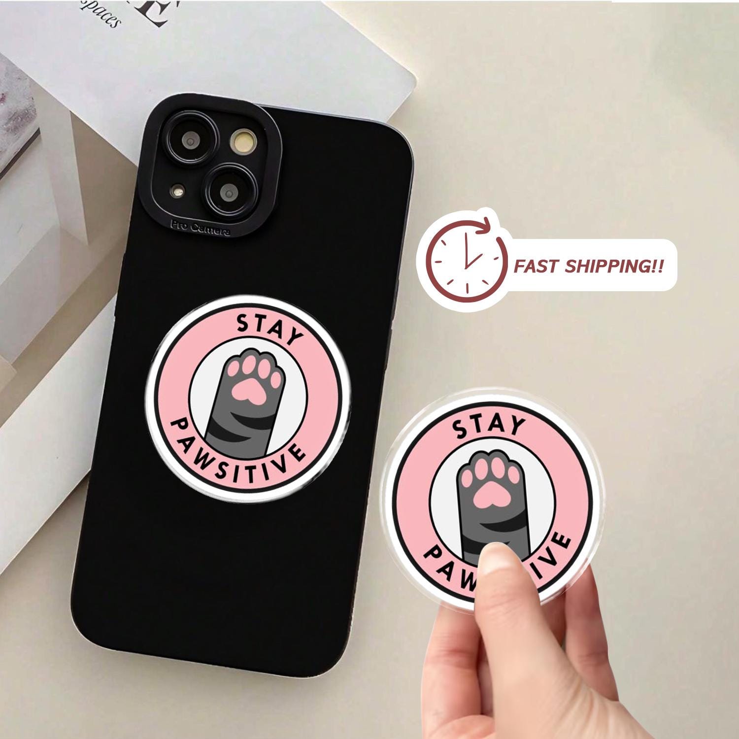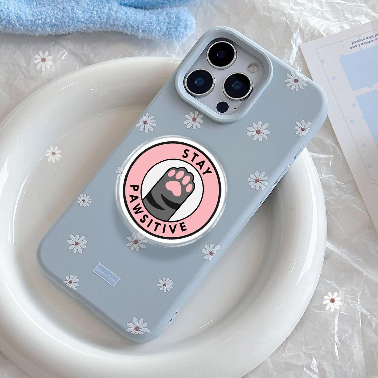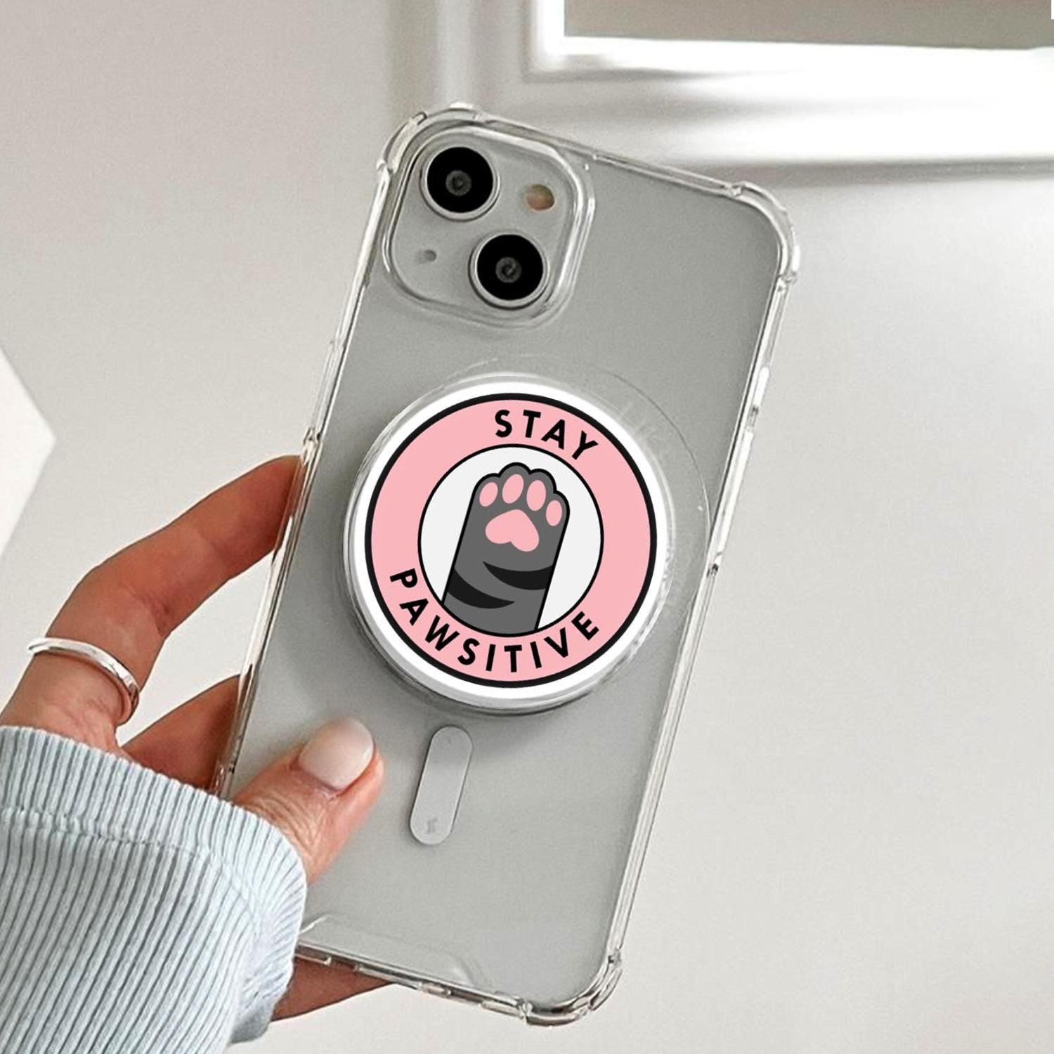 Aesthetic "Stay Pawsitive" Cat Paw Phone Holder, Cute Kitten Pun Illustration, Universal Magnetic & Adhesive Phone Stand