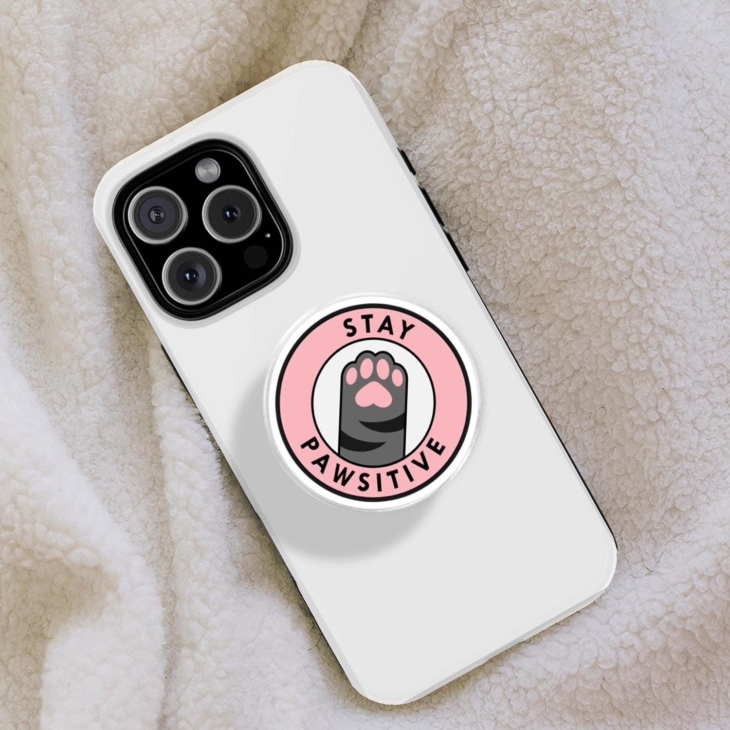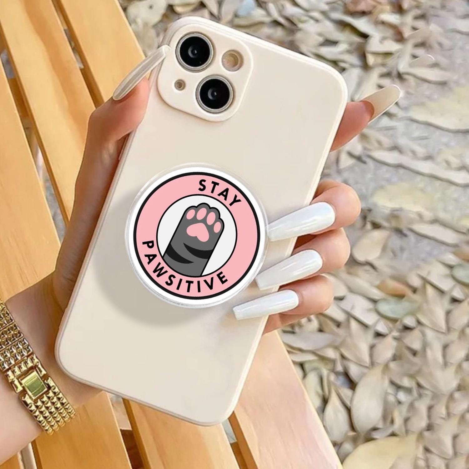 Witty Pun Artistry: This phone holder features a grey striped cat paw with adorable pink toe beans, encircled by the motivational and punny "Stay Pawsitive" slogan.