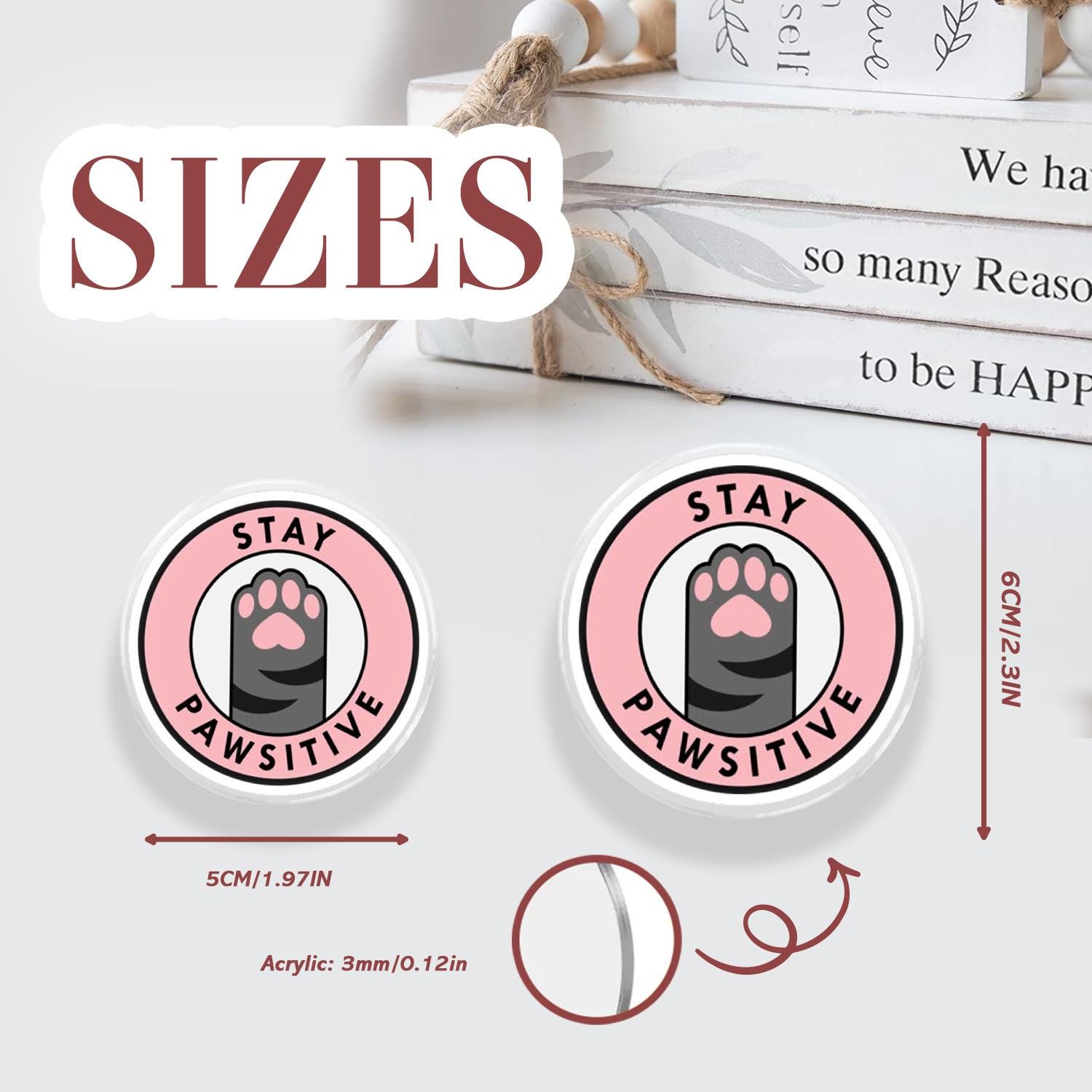 Design: Classic circular shape featuring a high-contrast graphic of a cat paw and motivational text.