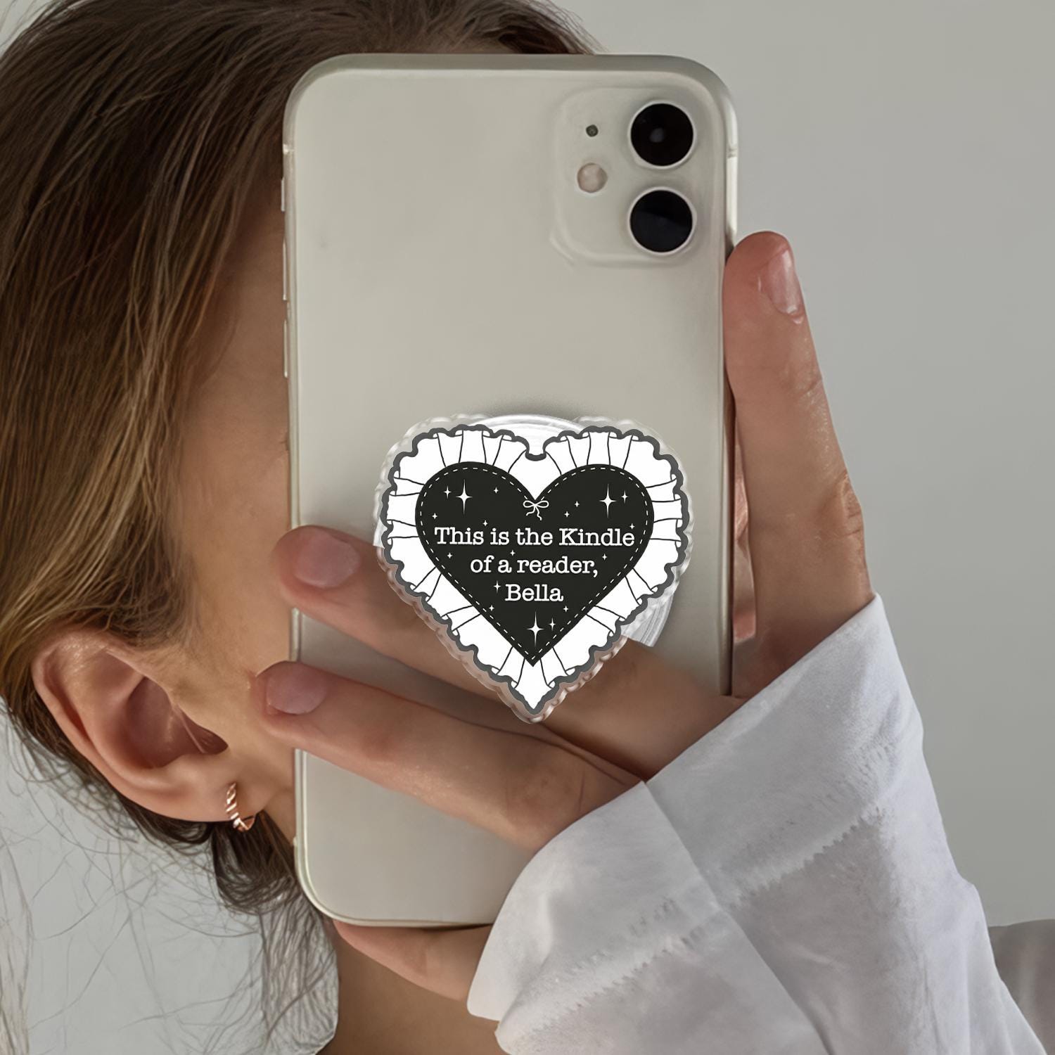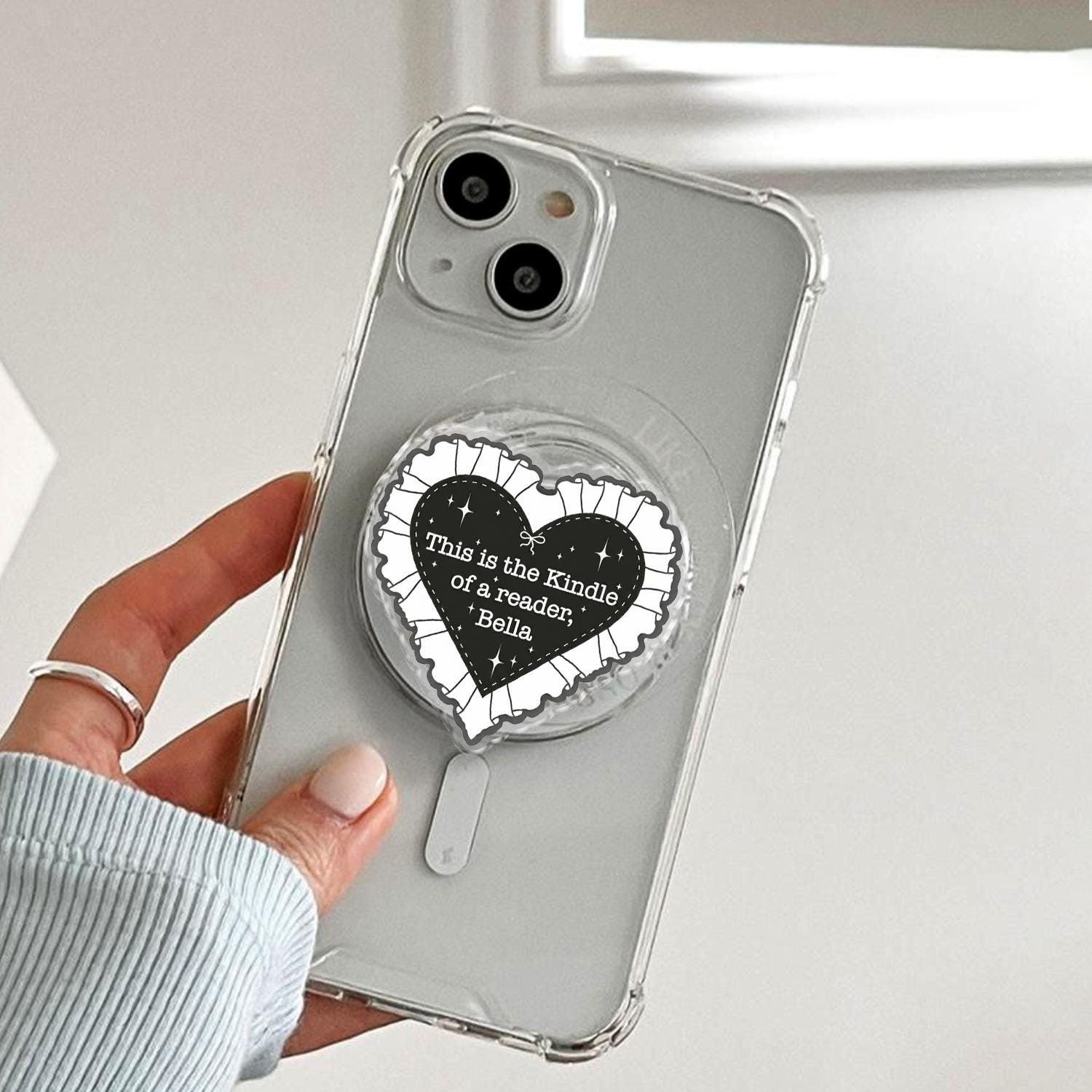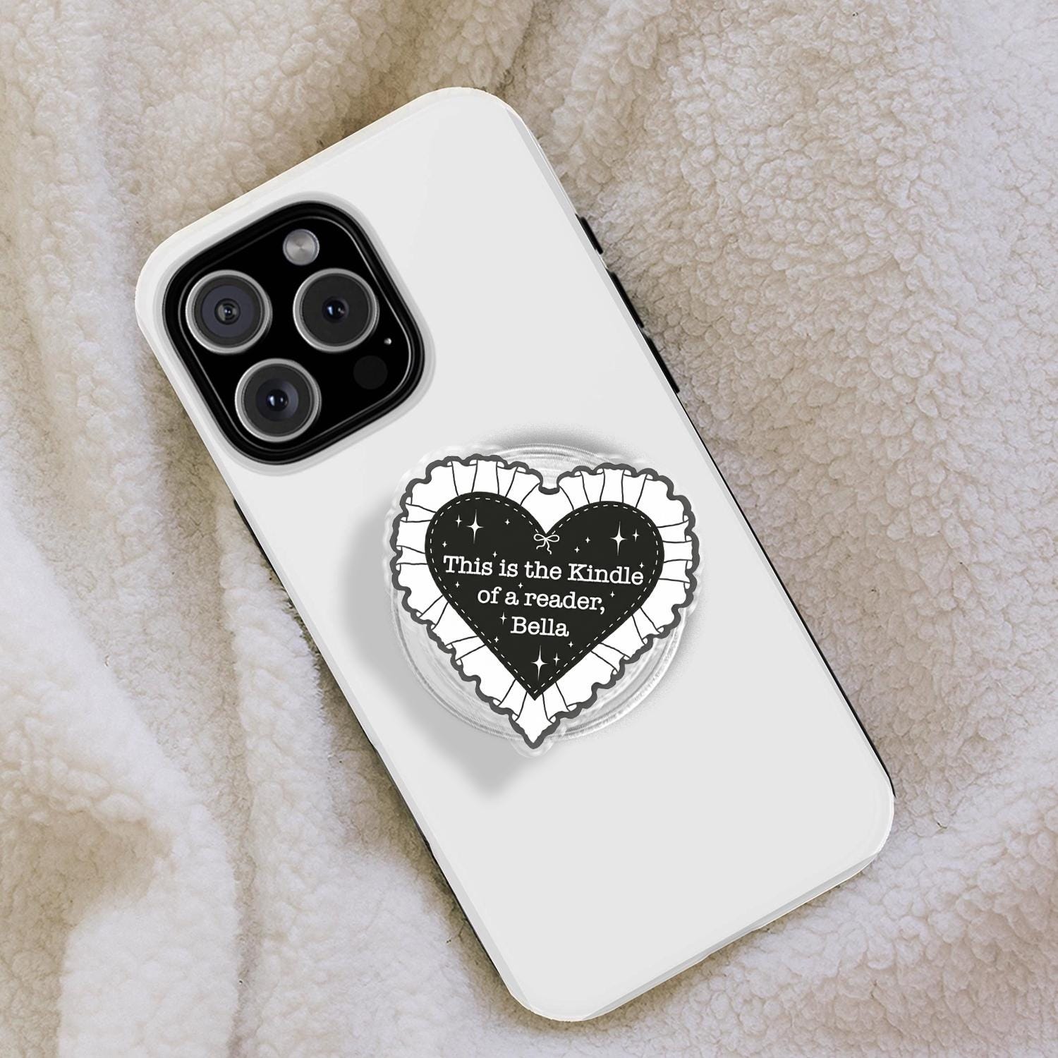 Iconic Reader Artistry: This phone holder features a bold black heart with a delicate white ruffled lace border, showcasing the famous "This is the Kindle of a reader, Bella" quote inspired by literary memes.