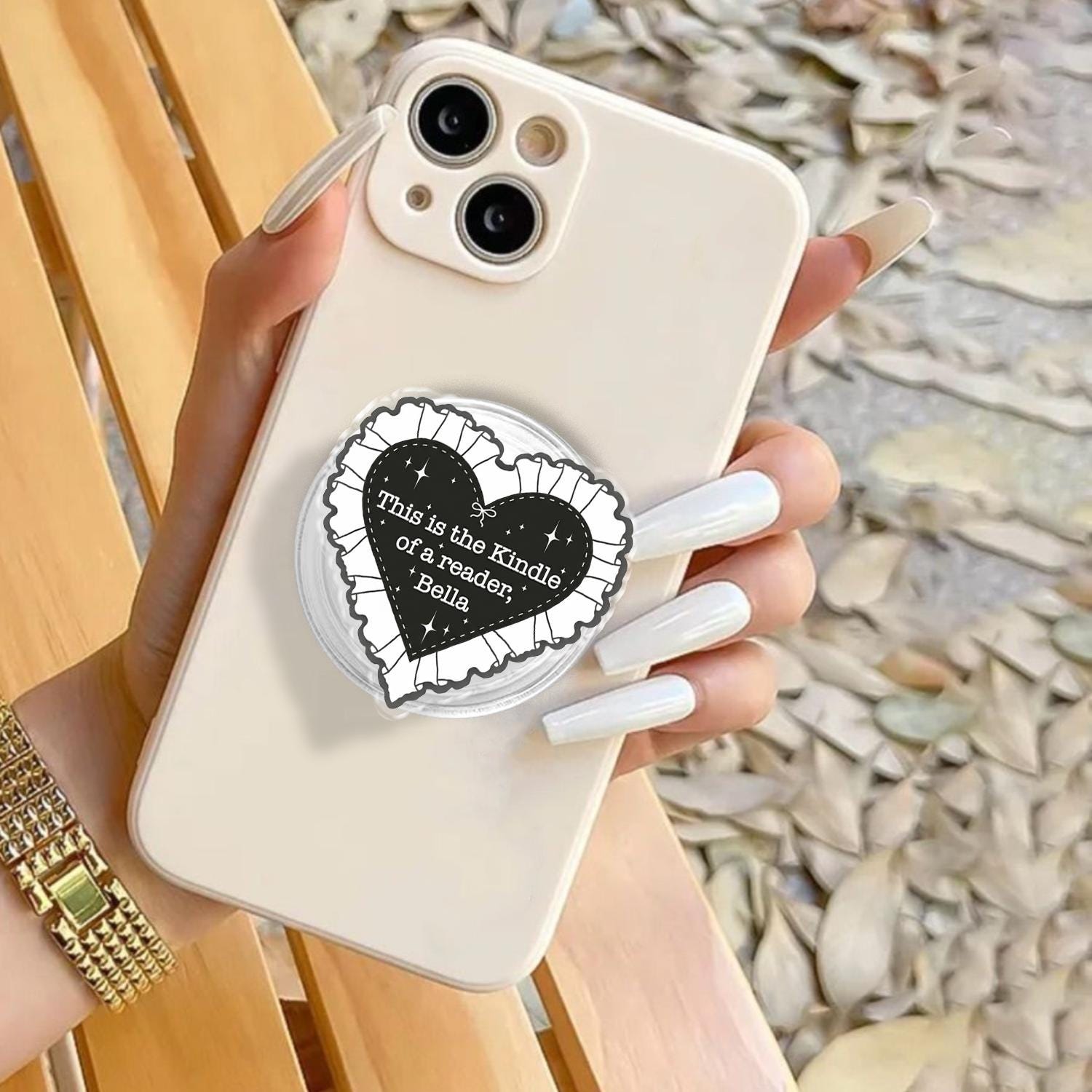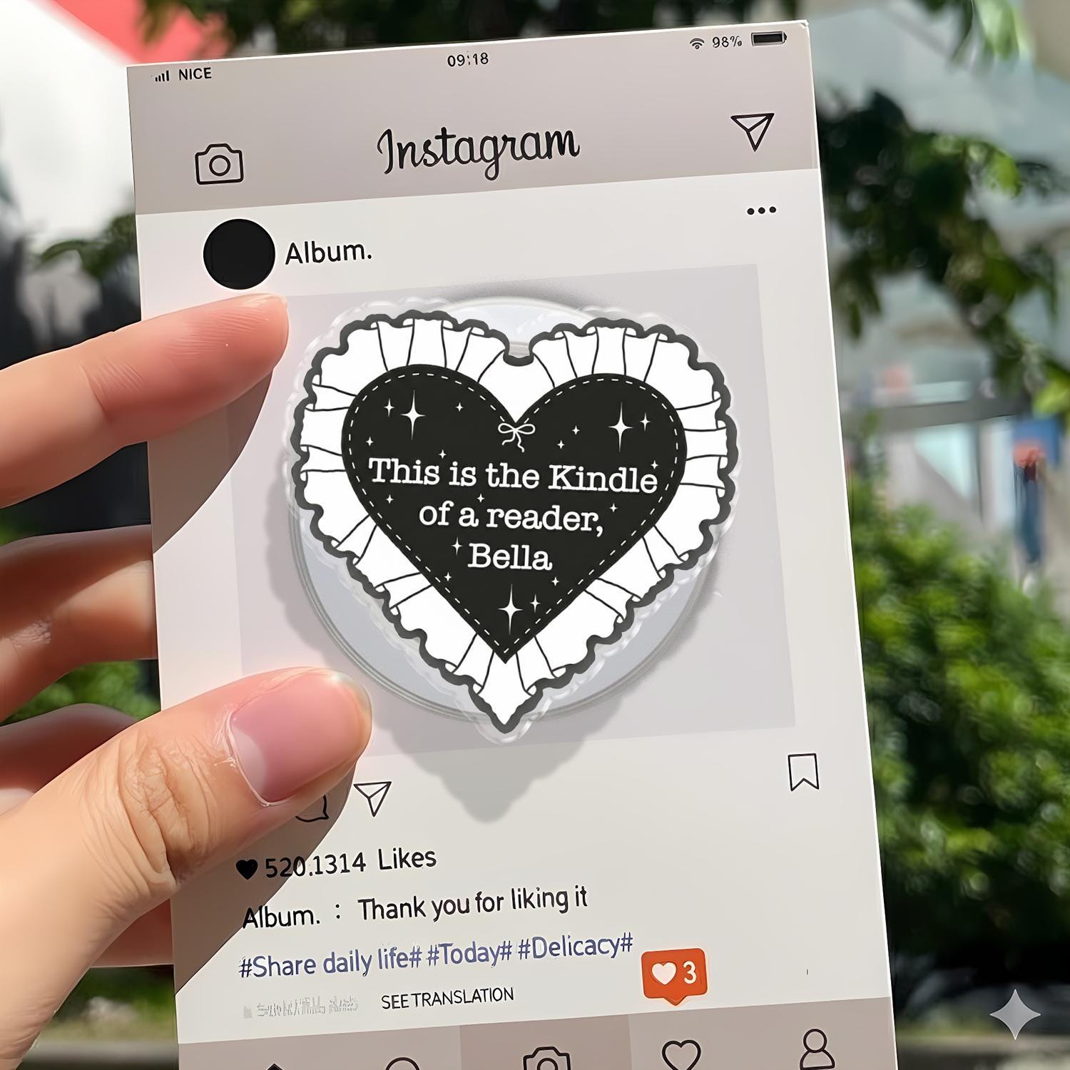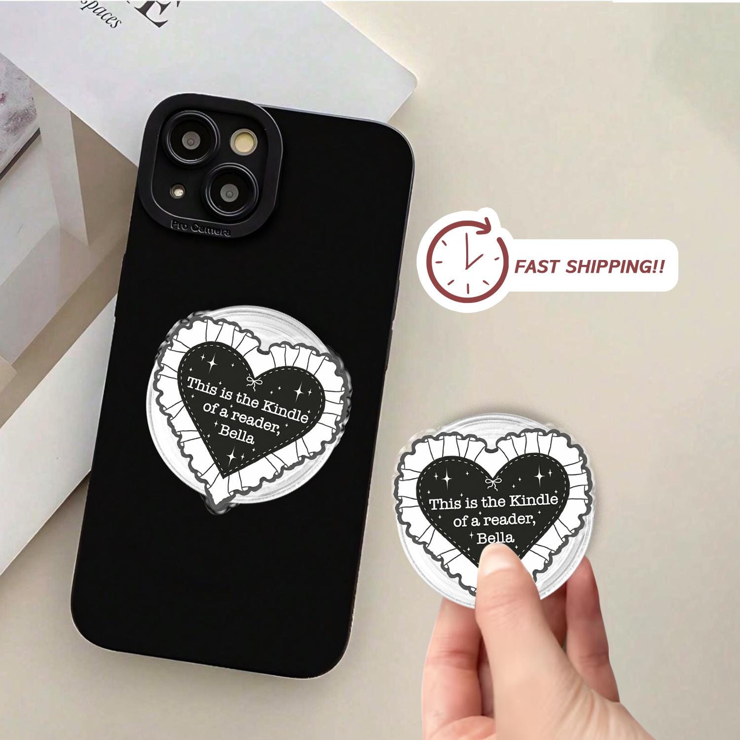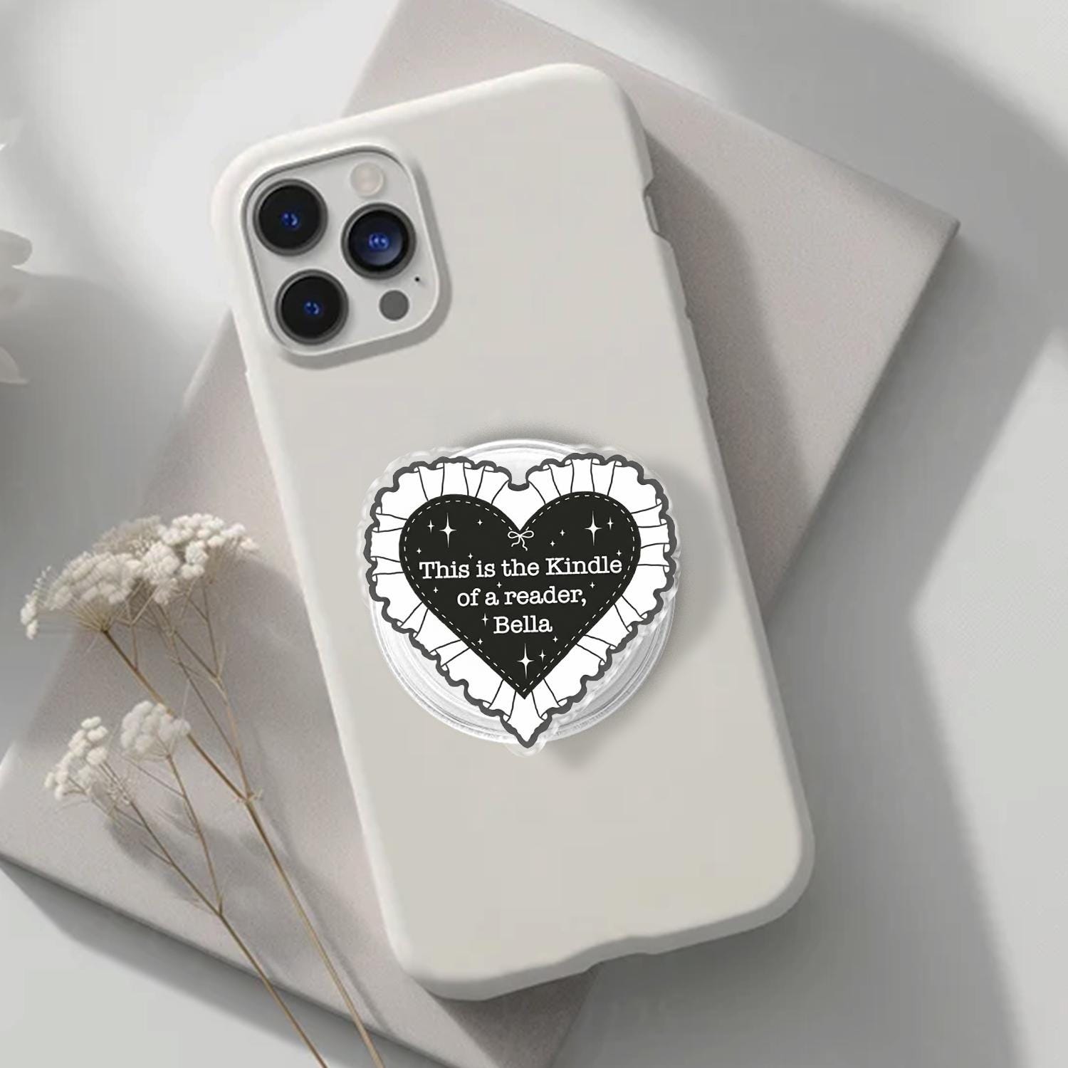 Iconic Reader Artistry: This phone holder features a bold black heart with a delicate white ruffled lace border, showcasing the famous "This is the Kindle of a reader, Bella" quote inspired by literary memes.