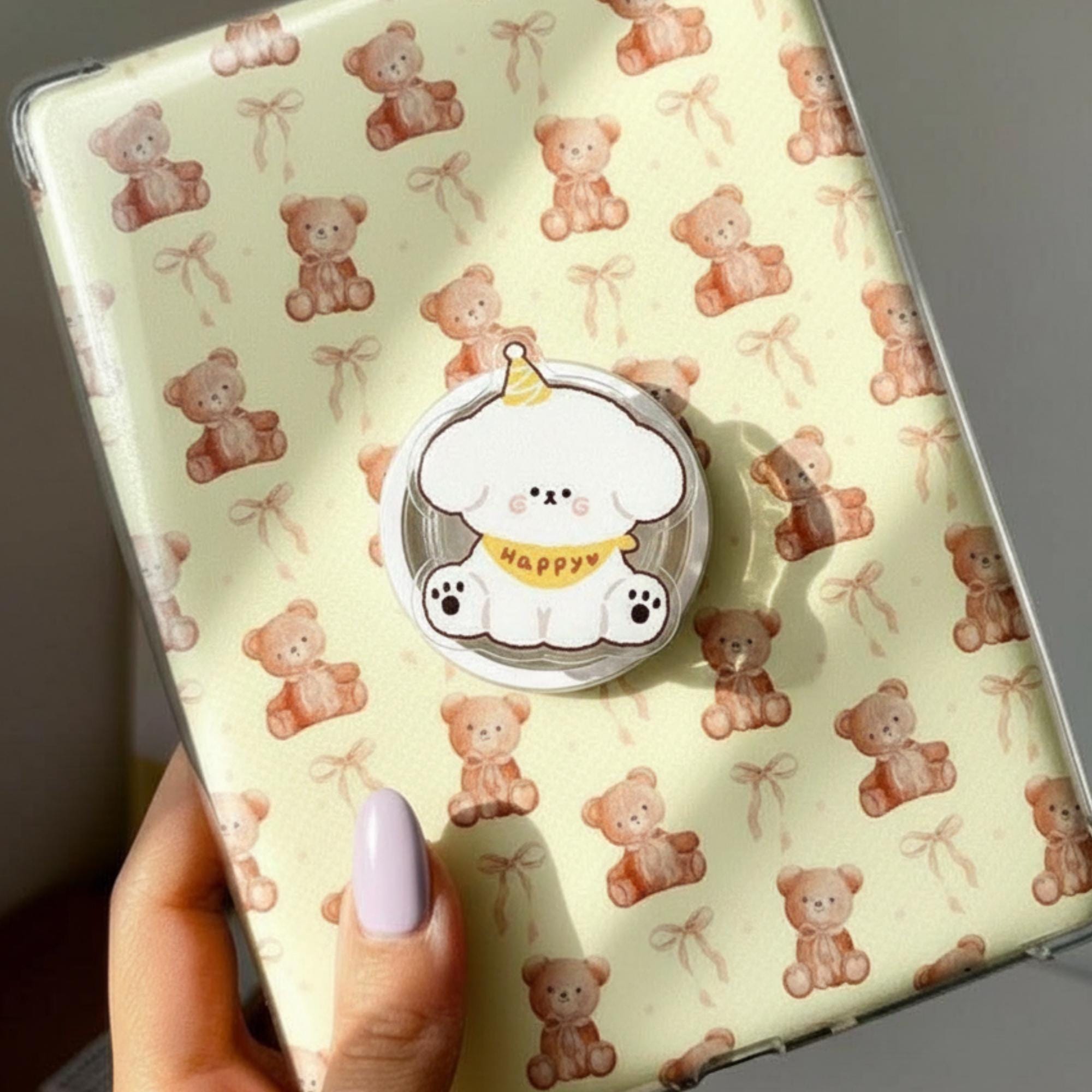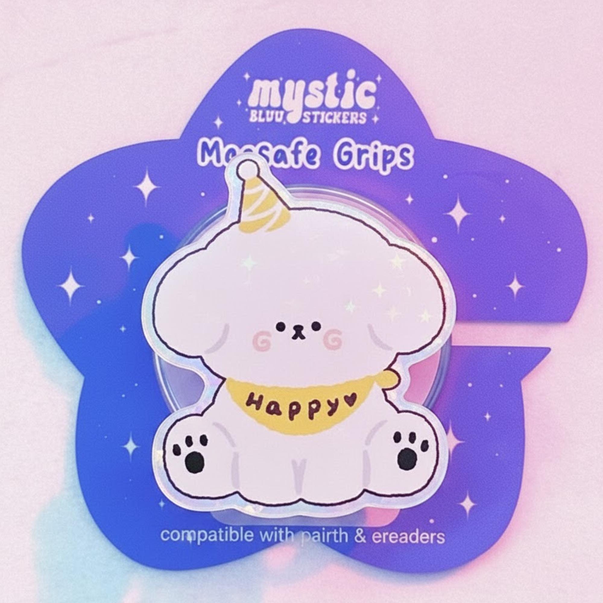 🎉 Kawaii White Dog Phone Grip – Happy Puppy with Party Hat Design. Celebrate your love for cute pups with this adorable Kawaii White Dog Phone Grip. Featuring a fluffy white puppy wearing a birthday party hat and a “Happy” banner, this phone grip adds an extra dose of happiness to your device. Ideal for dog lovers, this playful and pastel-colored phone grip will keep your phone secure and looking adorable all day long.