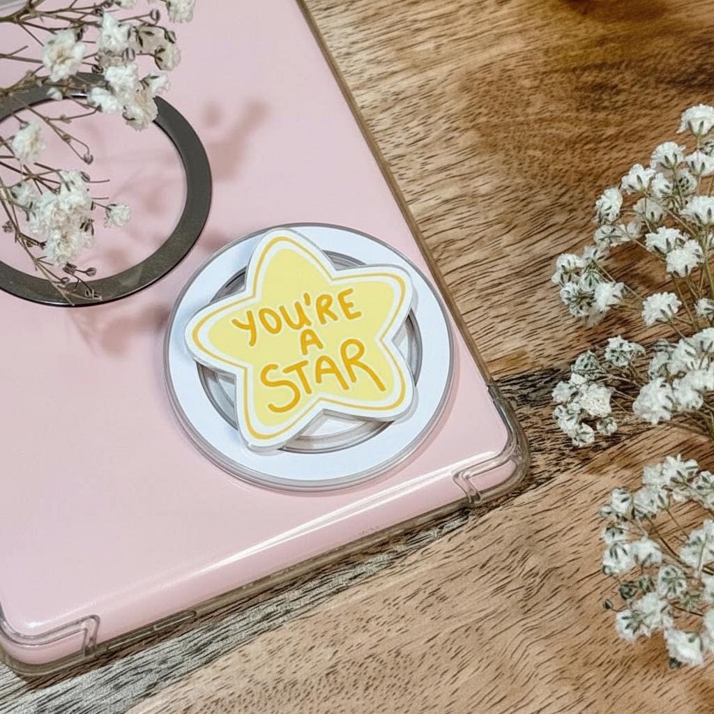 Shine bright with this cheerful You’re a Star MagSafe Phone Grip, designed to uplift and inspire every time you pick up your device. Featuring a bold yellow star and playful typography, this grip delivers a daily dose of encouragement while keeping your phone secure and stylish. Whether you're reading on your Kindle, scrolling through your day, or gifting someone special, this emotional popgrip is a reminder that they truly shine.